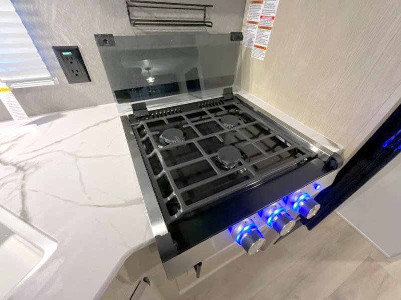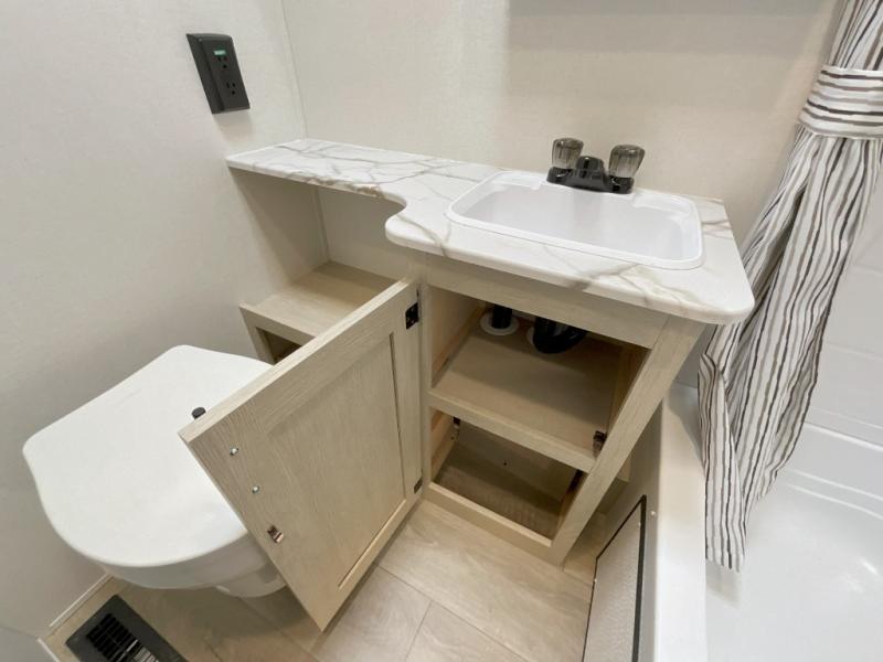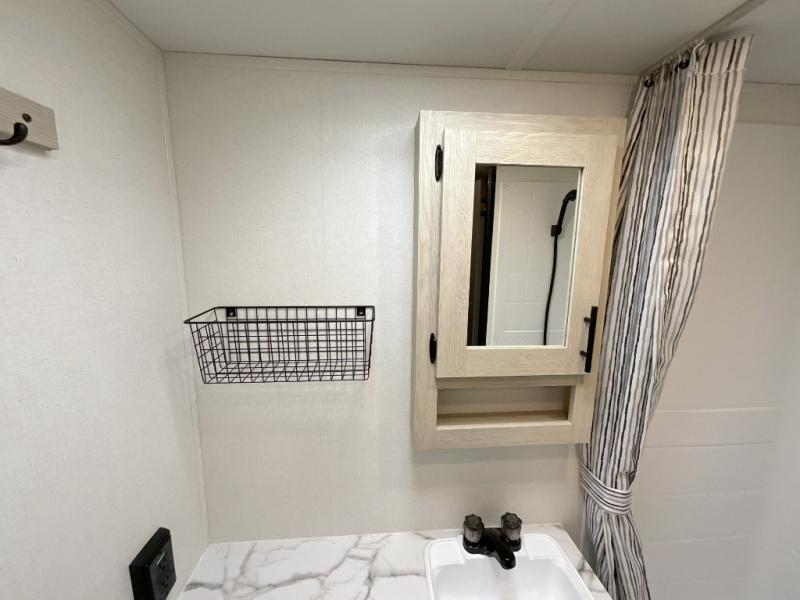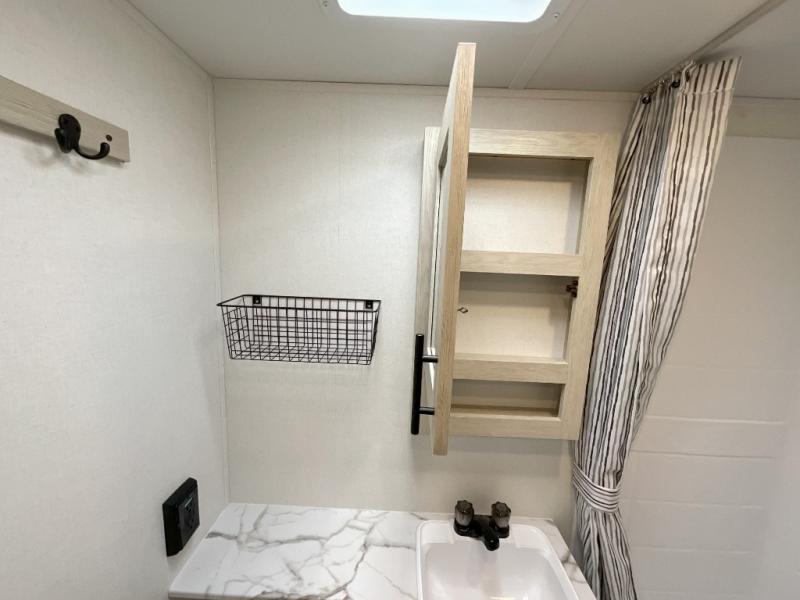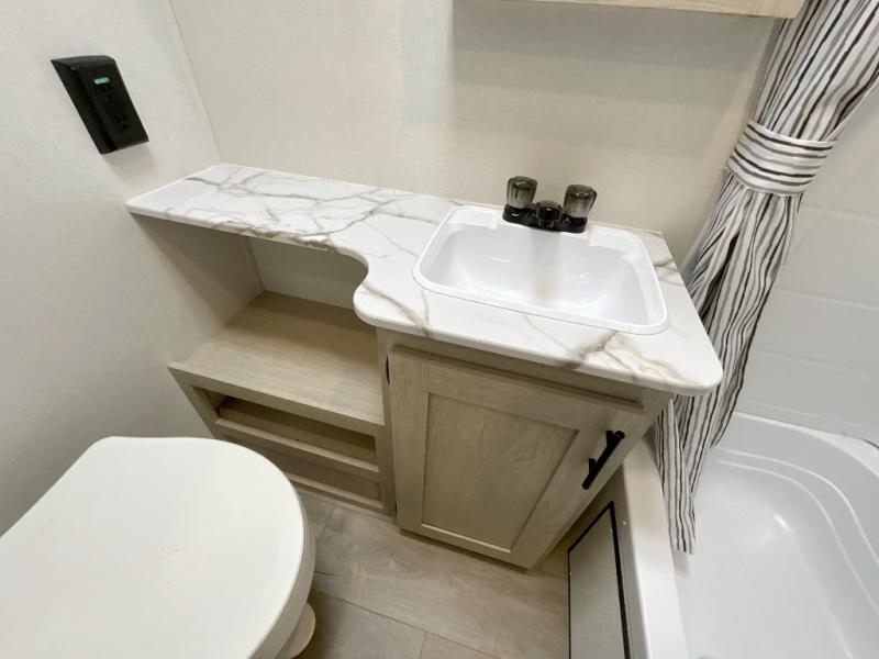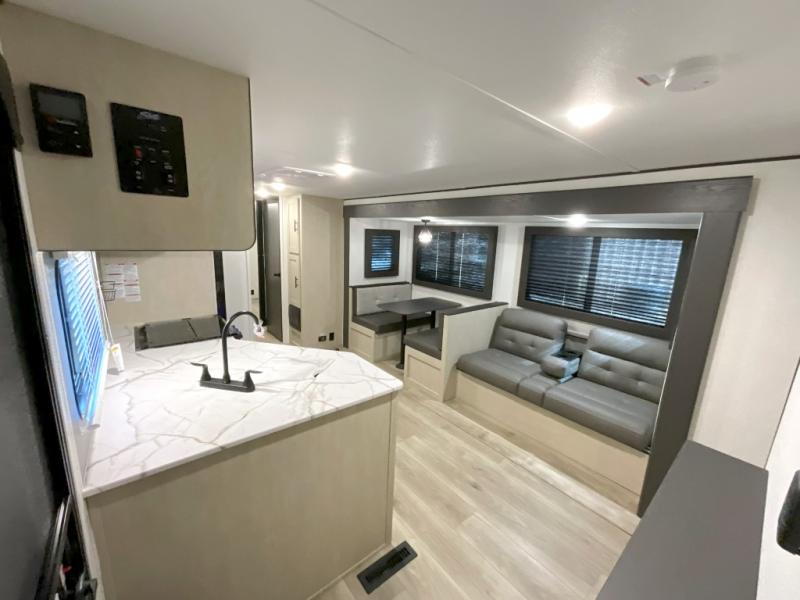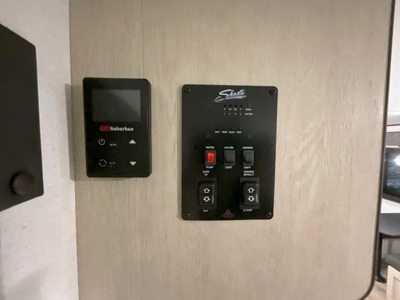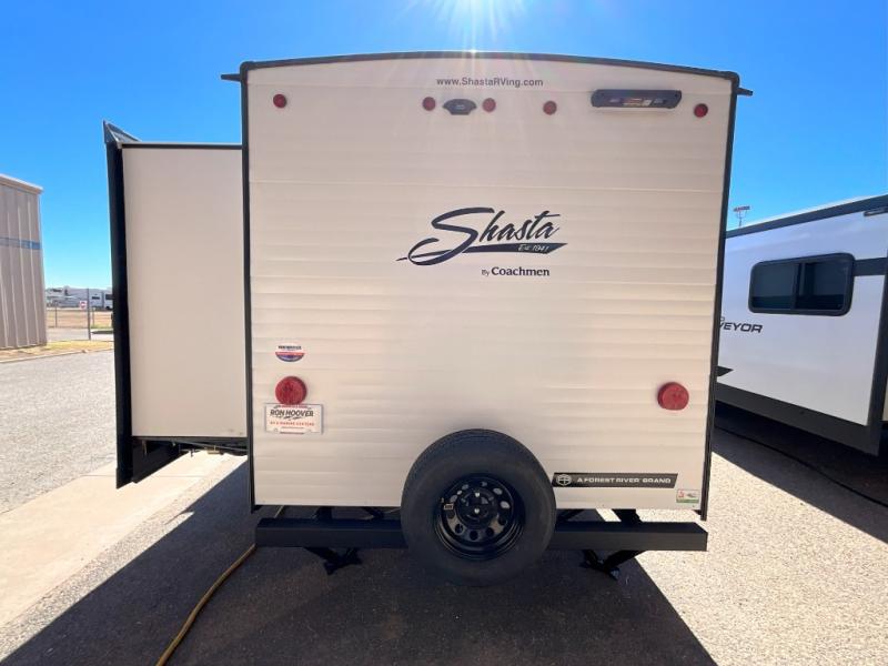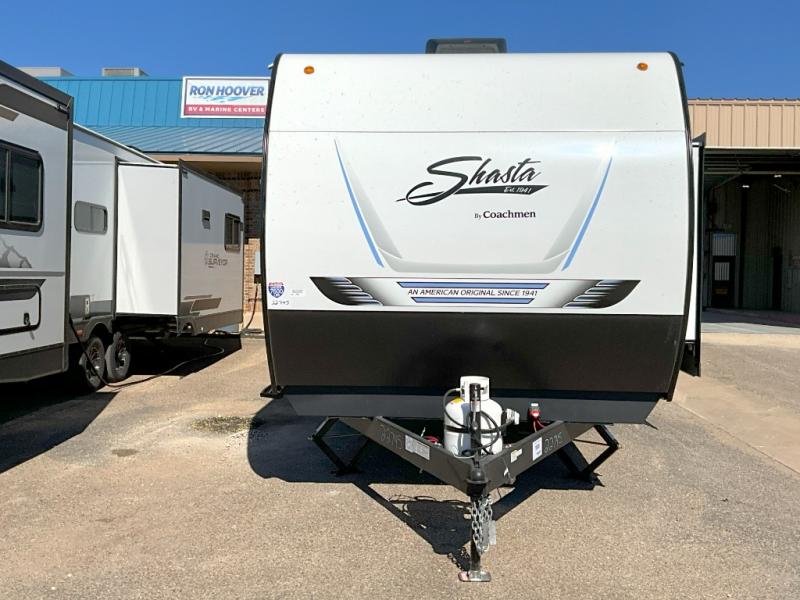In any Shasta i-5 Edition travel trailer, you will find quality craftsmanship along with an affordable price tag. These units each features four stabilizer jacks to make setting up easier and an enclosed underbelly for added protection as you travel. The Base Camp Package provides each unit with black tank flush, a monitor panel for quick access to the functions of your unit, a 13.5K A/C unit, and a tankless water heater for added convenience. Inside, you'll find seamless countertops, sink covers, a portable Bluetooth speaker, and more comforts!
