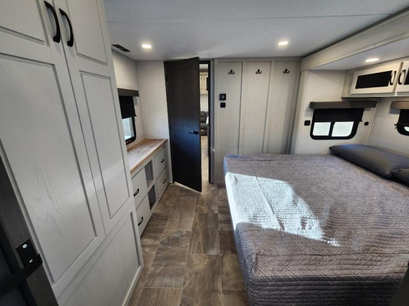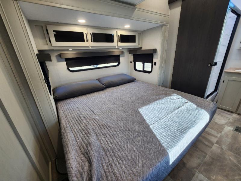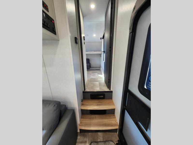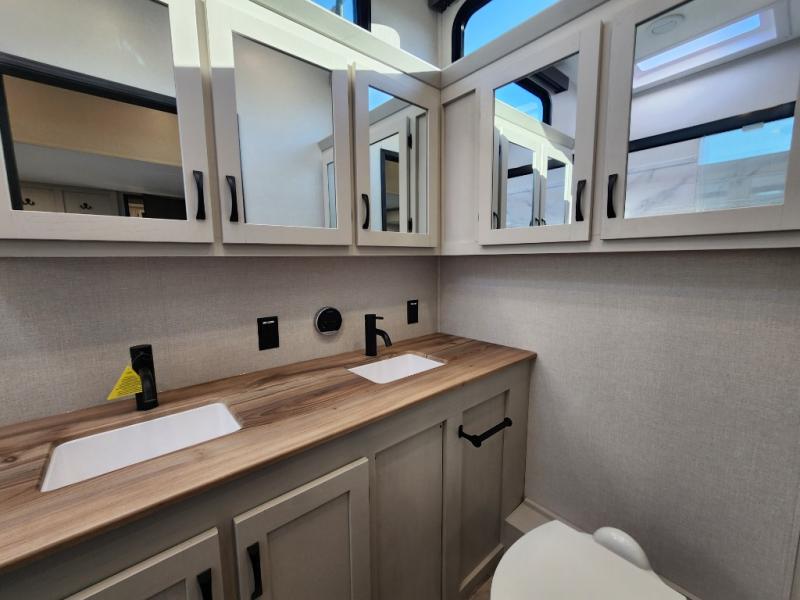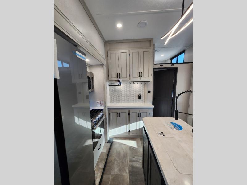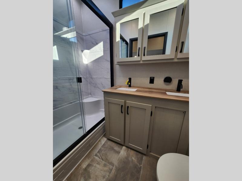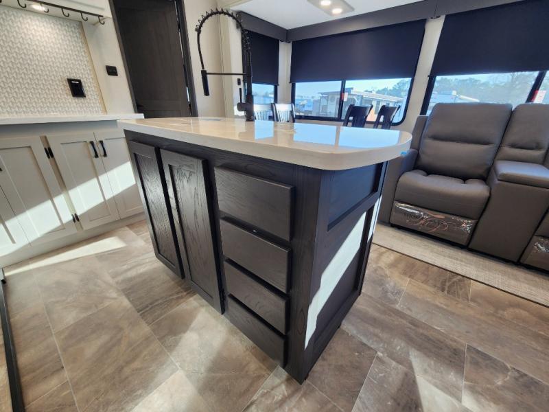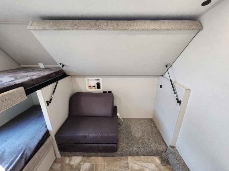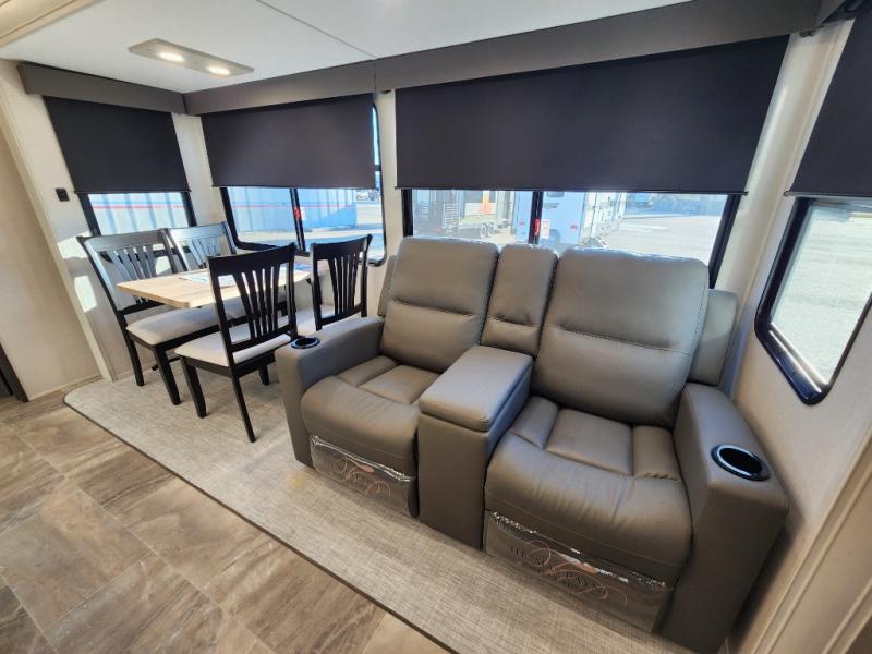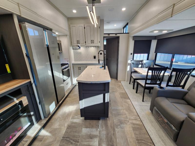 This fifth wheel is decked out in features you will love! Starting with the front private bunkhouse which has a 30" x 74" bunk bed, a 30" x 62" bunk above a cube sofa, washer and dryer prep, and even it's very own full bathroom. The living area has theater seating across from an entertainment center and a tri-fold hide-a-bed sofa for extra sleeping space, plus it is right next to the fully equipped kitchen with an island so you can socialize with the chef while they prepare a delicious home cooked meal. Get a good night's rest in the master suite with the king bed slide, a dresser, wardrobe, and full rear bathroom which has a shower with a seat and a dual sink vanity for two to get ready at once. Plus, above the master suite is a loft for extra sleeping or storage space!