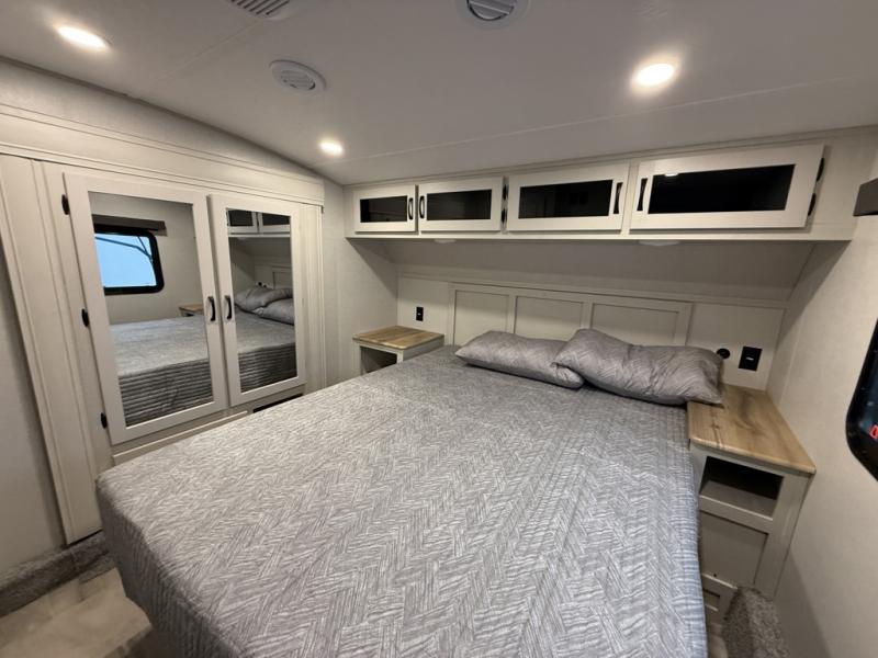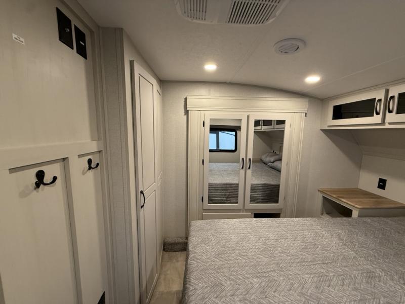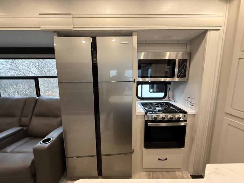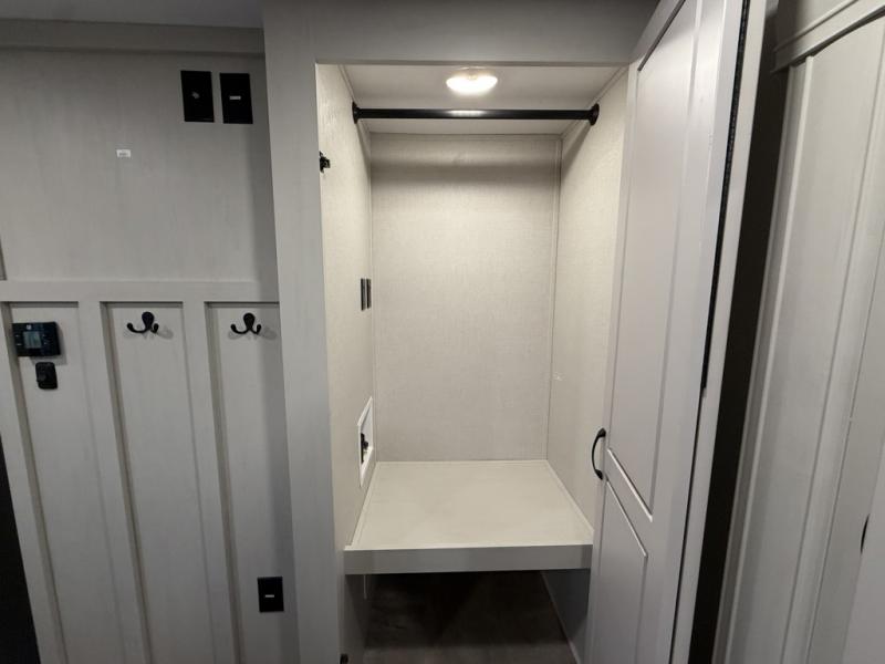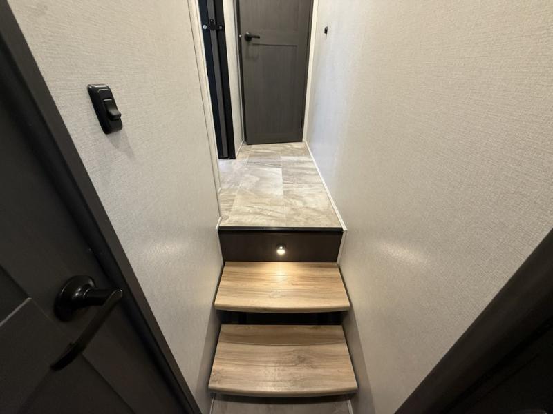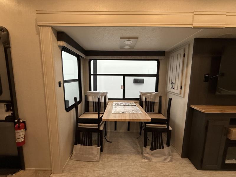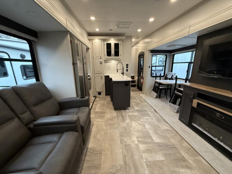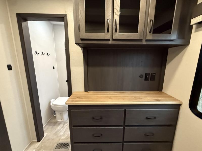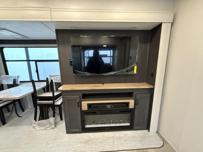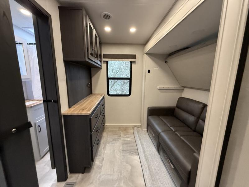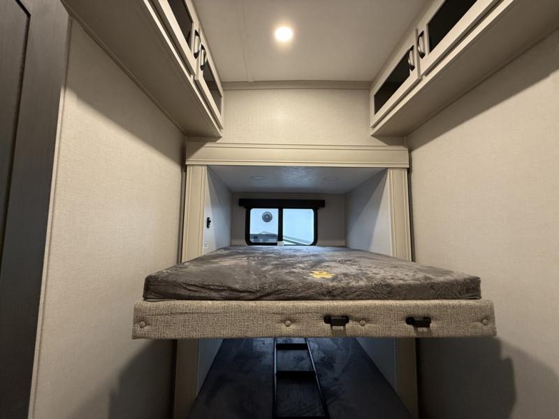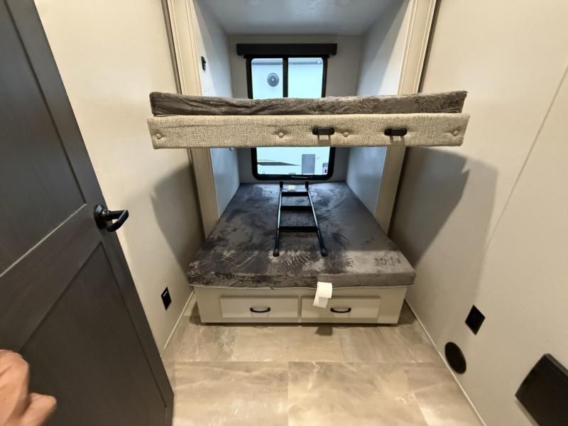 You can bring the whole family and extra friends with this fifth wheel! The front private bedroom has a queen bed with nightstands on either side, a wardrobe slide, and a wardrobe with washer and dryer prep. Just outside the bedroom is one of the full bathrooms which has a shower with a seat and is next to the second bedroom which has a set of 48" x 64" double bunk beds slide and overhead cabinets. The third bedroom is in the rear with a 30" x 65" flip down bunk above a tri-fold hide-a-bed sofa slide across from a dresser and an entertainment center, plus it's very own full bathroom that has one of the dual entry doors to the unit.