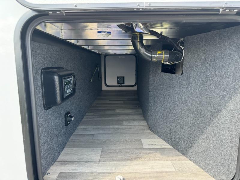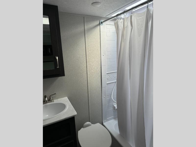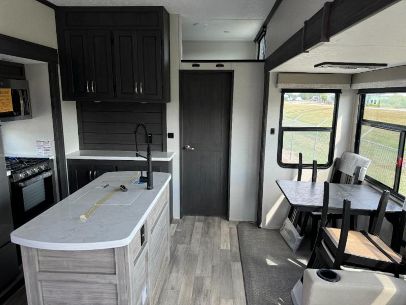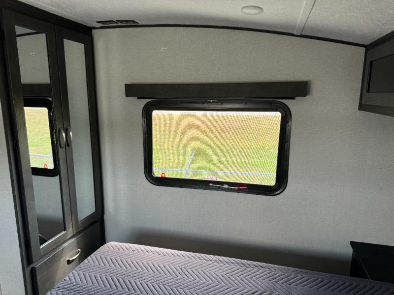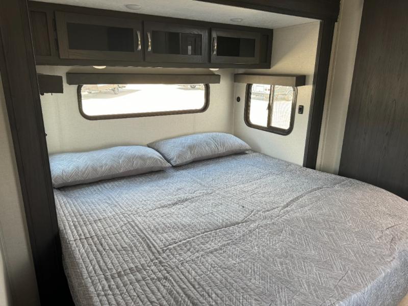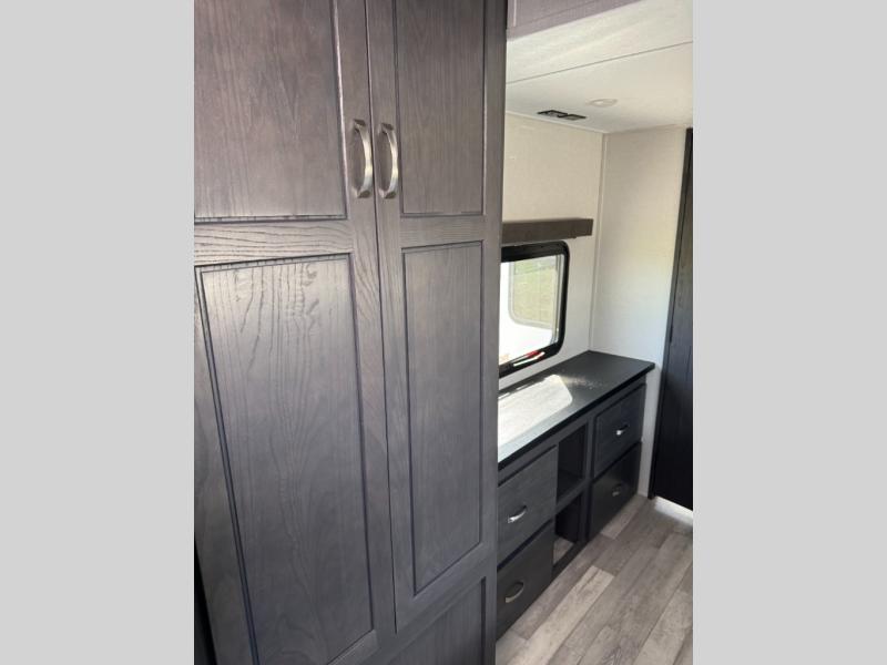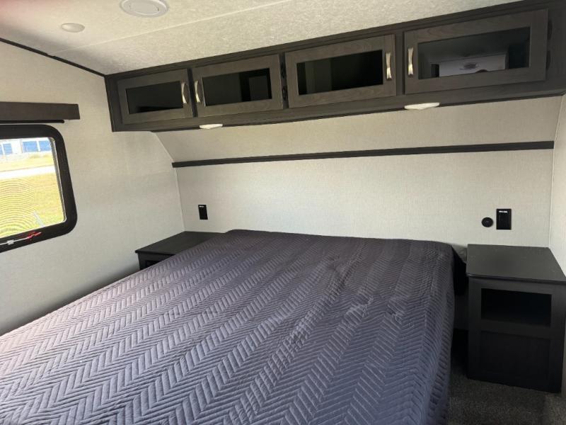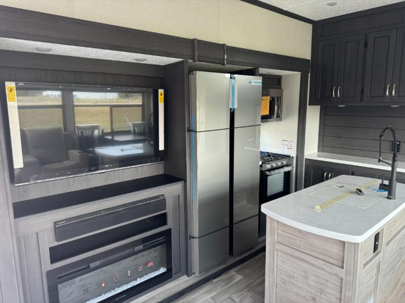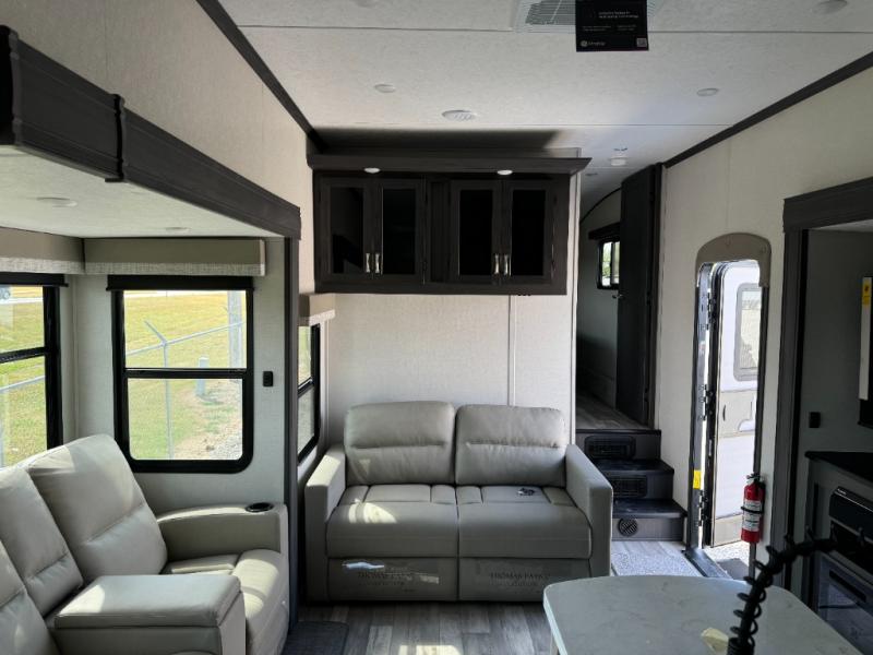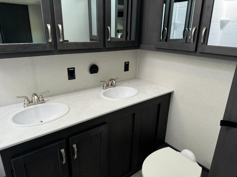 With two private bedrooms and two full bathrooms, you can be sure this fifth wheel has everything you need! You can sleep like a queen in the front bedroom with a queen bed, and plenty of storage in the wardrobes on either side and the additional wardrobe, plus it has its very own full bathroom. The second full bathroom includes a shower with a seat, a dual sink vanity, and is attached to the second private bedroom. Inside this bedroom is a king bed slide with a wardrobe and dresser, and a loft above it all. The main living and kitchen area includes dual opposing slides for lots of floor space, a kitchen island to prepare and serve meals, a hutch for storage, theater seating across from the entertainment center, and a tri-fold hide-a-bed sofa for added sleeping space!