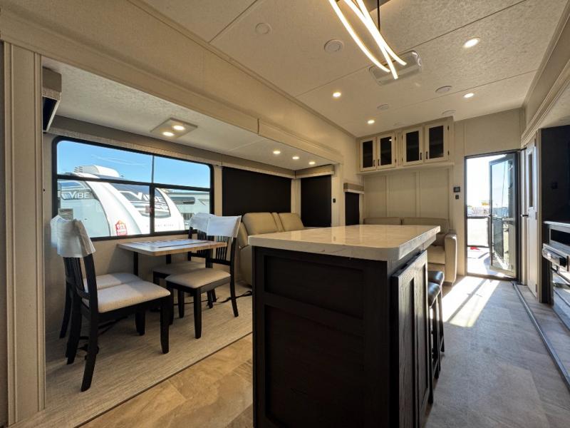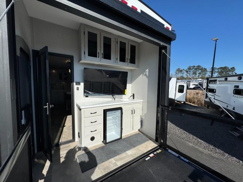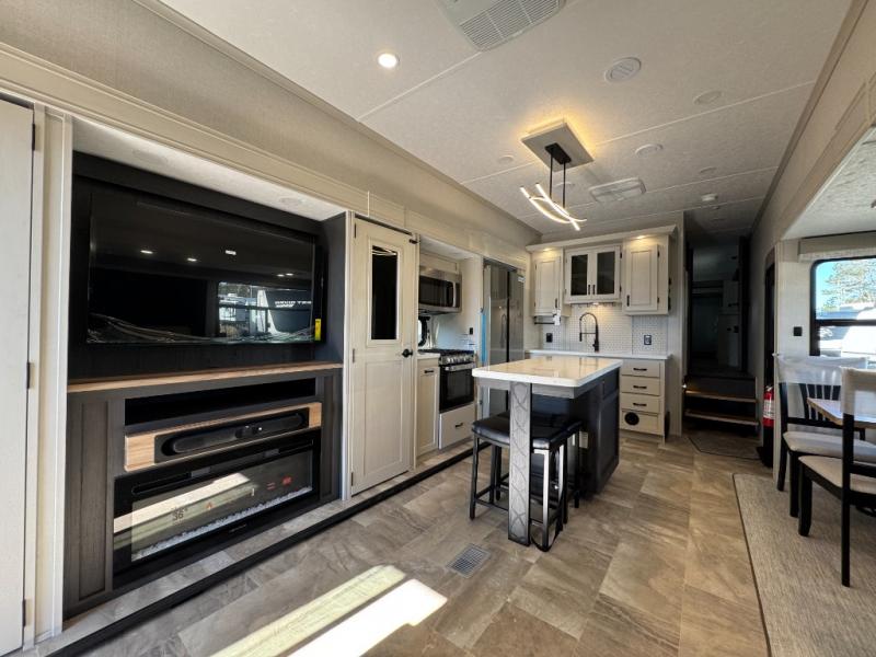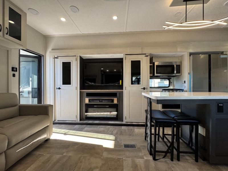 2025 Shasta RVs Phoenix fifth wheel 389DEK This fifth wheel will feel just like home with its rear fold down patio with a mini refrigerator, sink, and counter space so you can visit with campground neighbors. The combined kitchen and living area is made open thanks to the dual opposing slides, and here you'll enjoy theater seating across from the TV and fireplace, a free-standing table, and a kitchen island with two stools. There is also a 65" tri-fold sofa where guests can sleep! A spacious full bath includes a shower with a seat and dual bath sinks so you both can get ready for bed at the same time. And you will love having your own bedroom up front, complete with a king bed slide out, a dresser, plus a front wardrobe with washer and dryer prep!