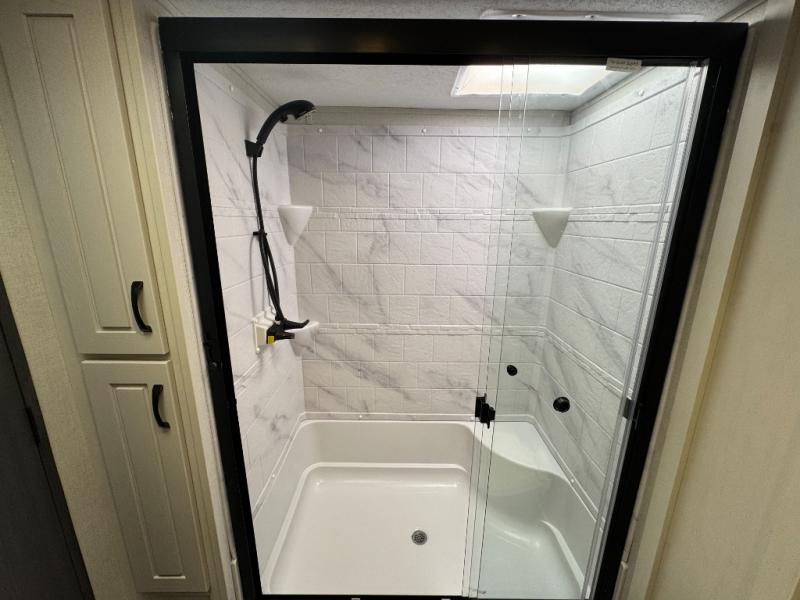 With any Phoenix mid-profile fifth wheel by Shasta RVs, the stand out construction features include residential 5" truss rafters, full walk-on roof decking, vacuum bonded and aluminum framed sidewalls with rot proof AZDEL composite sidewall panels. The Weather Shield+ offers cold and hot testing, 12V thermal tank heaters on all tanks, a sectionalized underbelly and heated gate valves and more so you can camp during any season you wish. The Road Armor Suspension by Trail Air will make towing easier than ever, and the upgraded marine-style convenience center includes a black tank flush plus a hot/cold shower to wash off hiking gear. Head inside to find solid surface countertops and sink covers, an upgraded 50" 4K Smart LED TV in the living room, USB/USB-C charging ports, and an upgraded 60K BTU on-demand water heater to name a few comforts!
