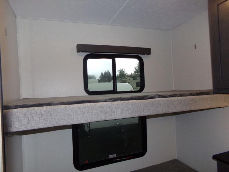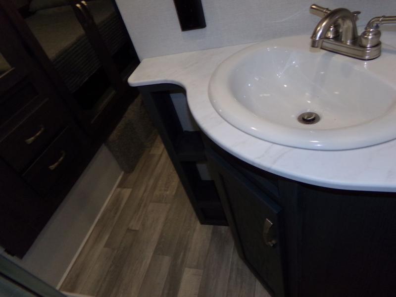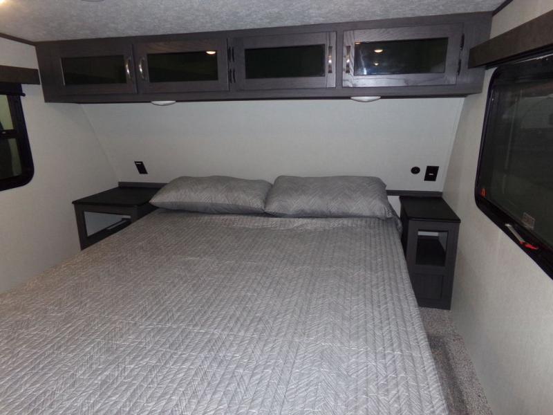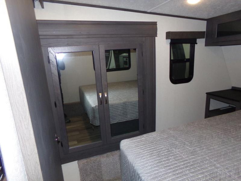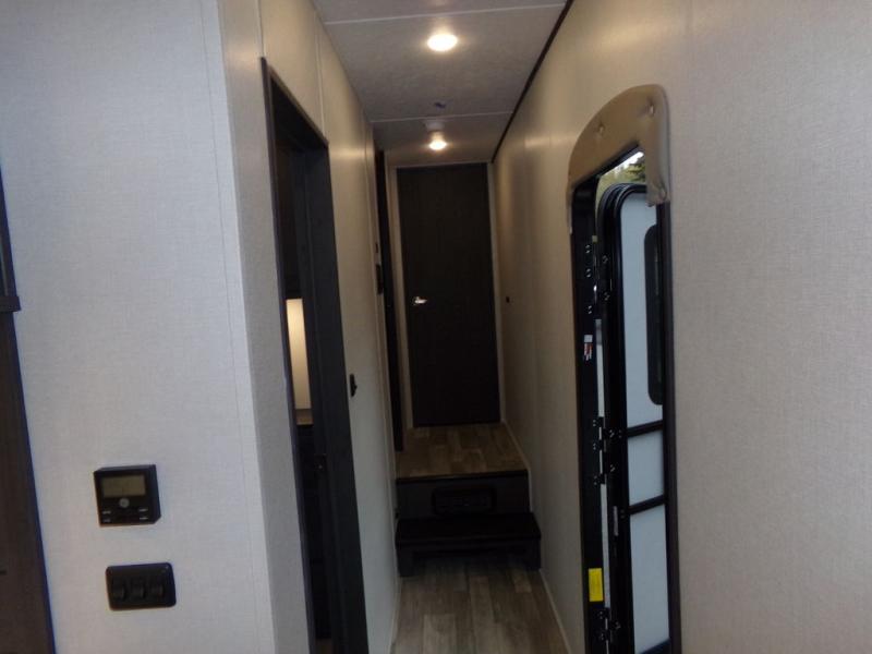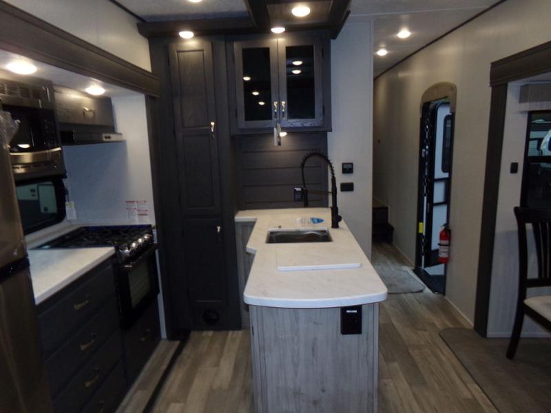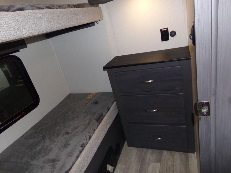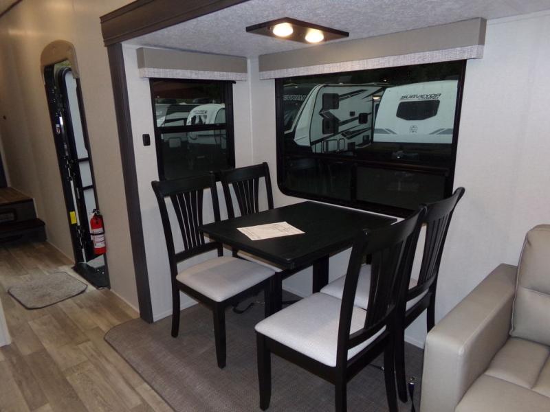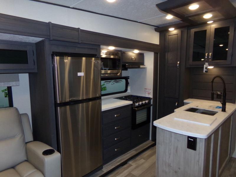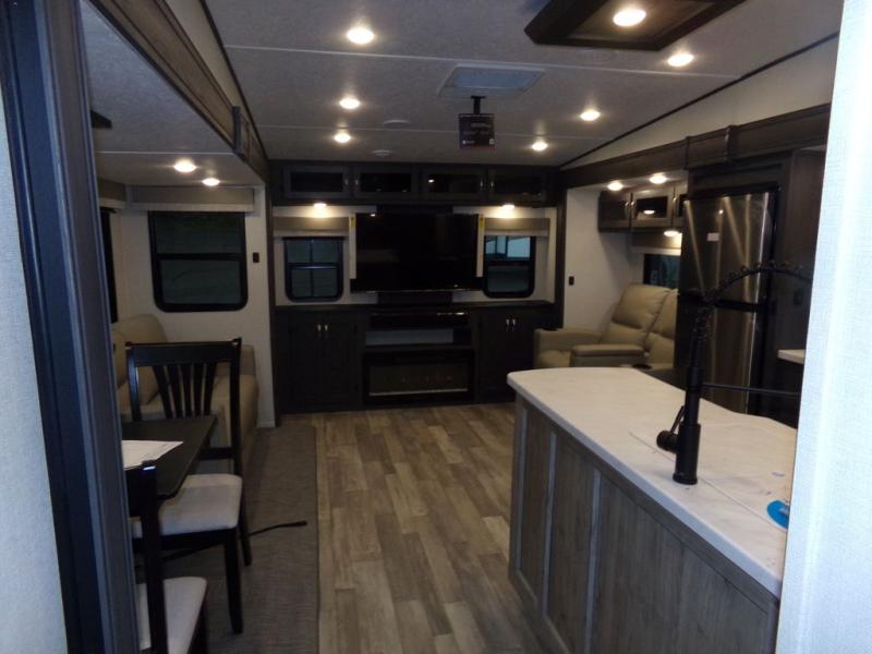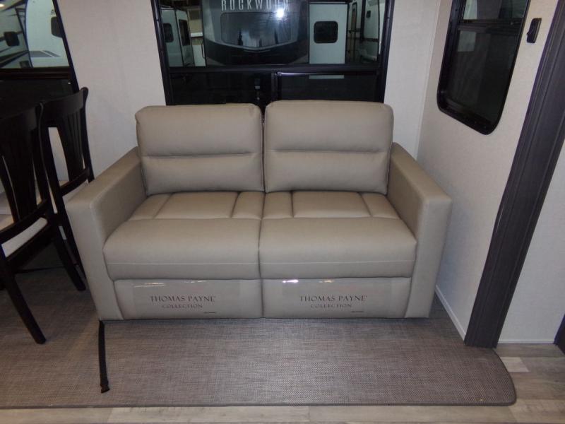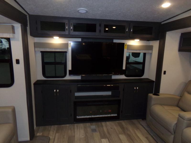 The whole family can comfortably camp in this fifth wheel with a front master bedroom and a middle bunkroom! The front private bedroom has a queen bed, a wardrobe/linen closet slide, and an entrance into the dual entry bathroom which has a radius shower. The middle bunkroom has a 30" x 74" bunk bed with a flip up top bunk, shoe storage area, and overhead cabinets. The chef can prepare their best home cooked meals with the residential cooktop and 21" stainless steel oven, then enjoy them all together at the table with chairs. After dinner you can head to the rear living area and relax on either the tri-fold hide-a-bed sofa or Thomas Payne theater seating while enjoying the high BTU output electric fireplace!