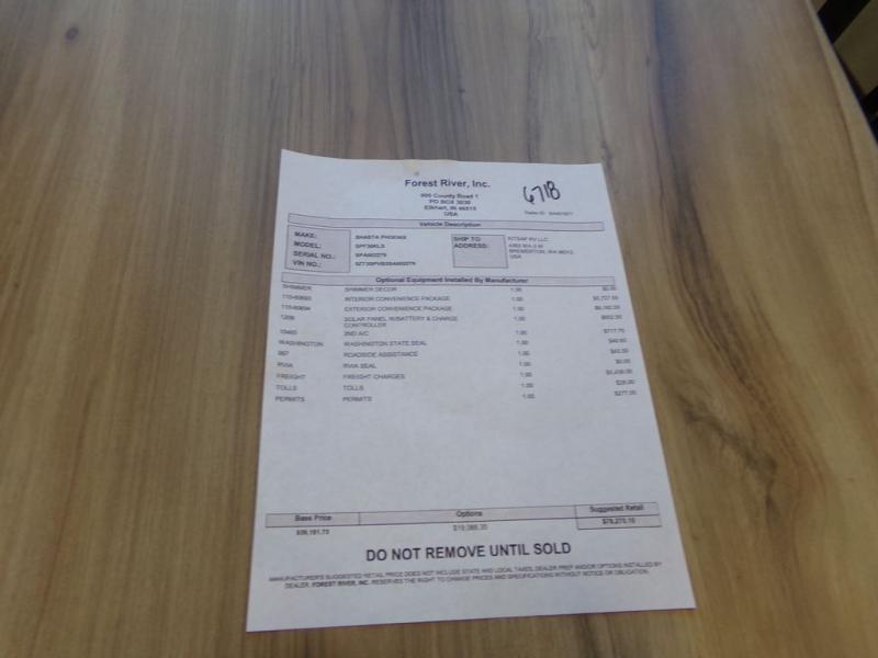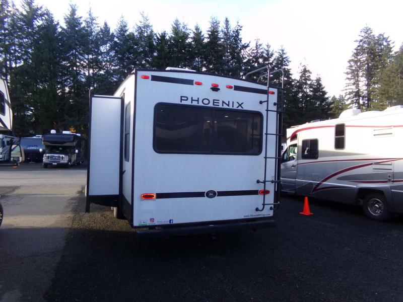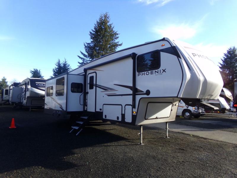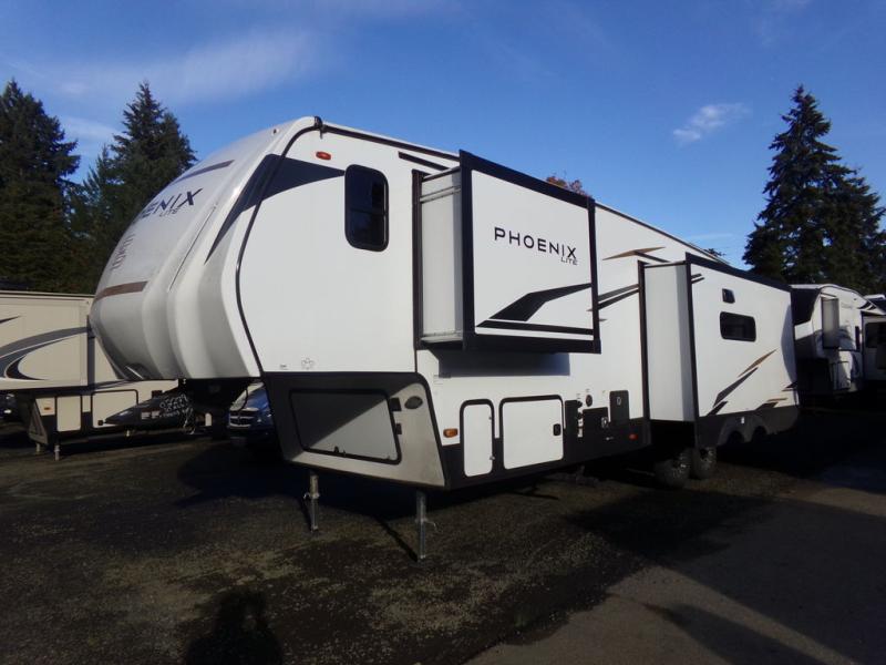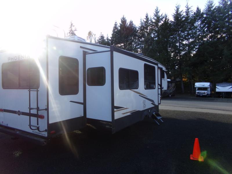 Stand out from all the others with one of these Shasta RVs Phoenix Lite fifth wheels! They are constructed with Weather Shield+ technology, dual-sided Azdel composite sidewall panels, and Tri-Tex powder coated frame technology that is ultra weather resistant. There are also electric front jacks and electric rear stabilizer jacks, an electric awning with LED light strip and one hand pitch adjustment, and a roof mounted solar panel within the Solar Source+ Package. The interior includes USB charging ports, slow rise blackout roller night shades, and a large transom window in the kitchen. You will also enjoy the upgraded GE 13,500 BTU dual ducted main A/C to keep you comfortable throughout your fifth wheel, plus an upgraded 60K BTU on-demand water heater for endless hot showers!