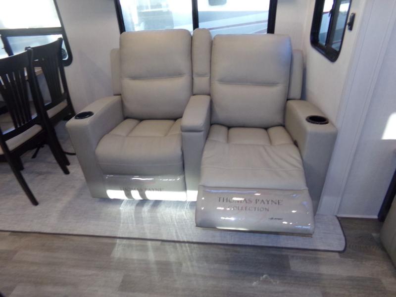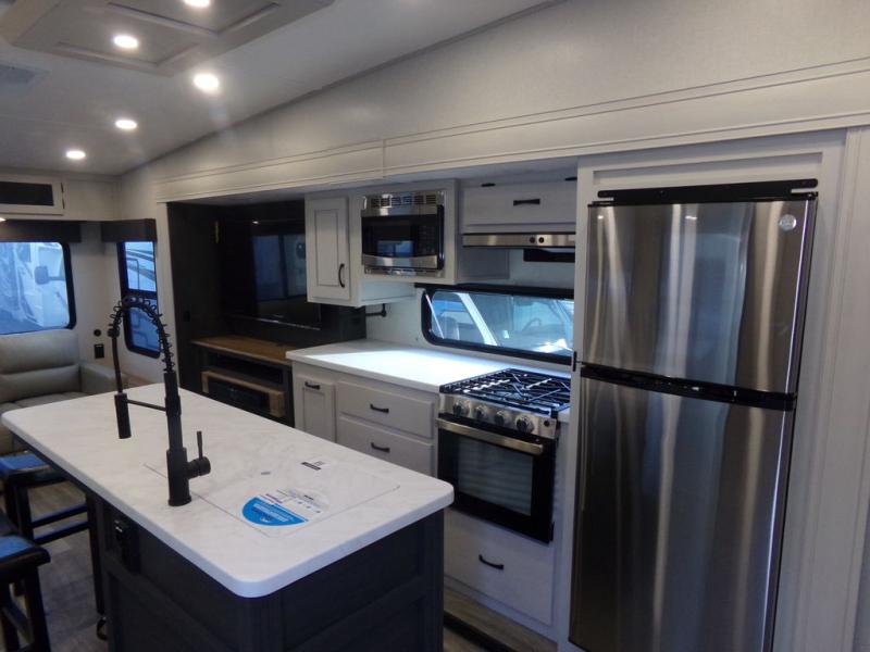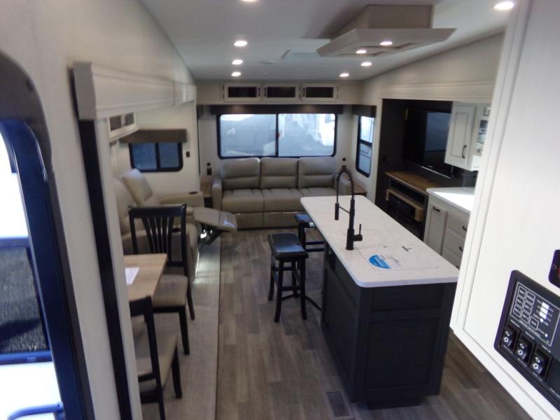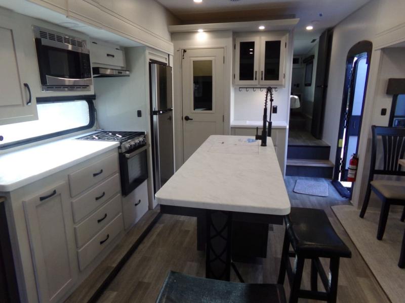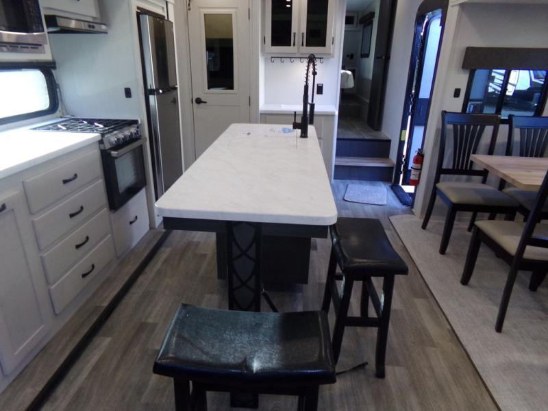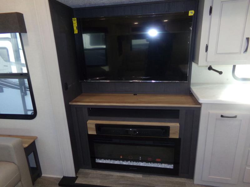Start camping in true luxury with this fifth wheel! The chef will appreciate having a kitchen island with two barstools to sit at while they prepare dinner. Eat your meals and play card games at the table and chairs, then relax in the rear living area on either the 78" tri-fold hide-a-bed sofa or theater seating across from the fireplace and TV. The dual entry bathroom has a radius shower to freshen up in and leads directly into the front private bedroom with a queen bed and wardrobe/linen closet slide to keep your items looking their best!