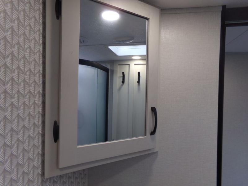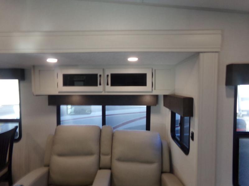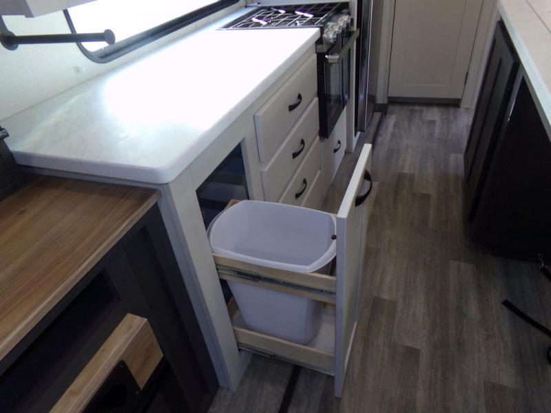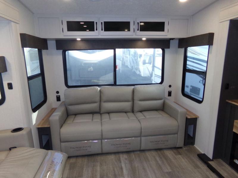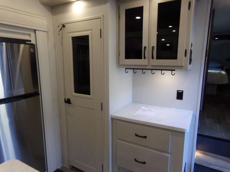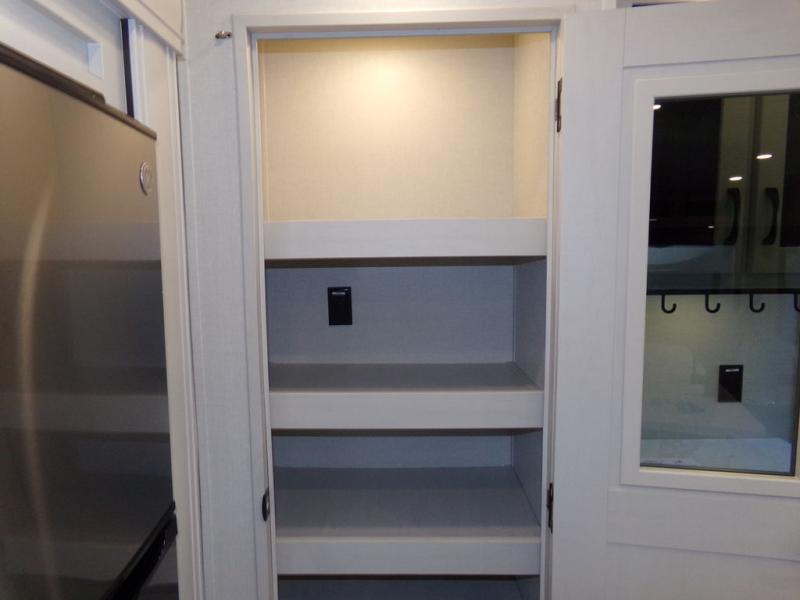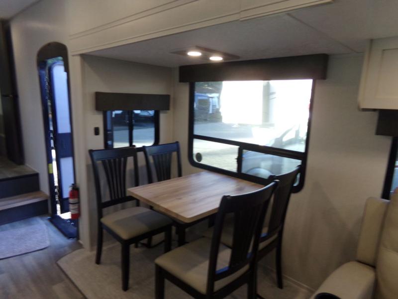Start camping in true luxury with this fifth wheel! The chef will appreciate having a kitchen island with two barstools to sit at while they prepare dinner. Eat your meals and play card games at the table and chairs, then relax in the rear living area on either the 78" tri-fold hide-a-bed sofa or theater seating across from the fireplace and TV. The dual entry bathroom has a radius shower to freshen up in and leads directly into the front private bedroom with a queen bed and wardrobe/linen closet slide to keep your items looking their best!