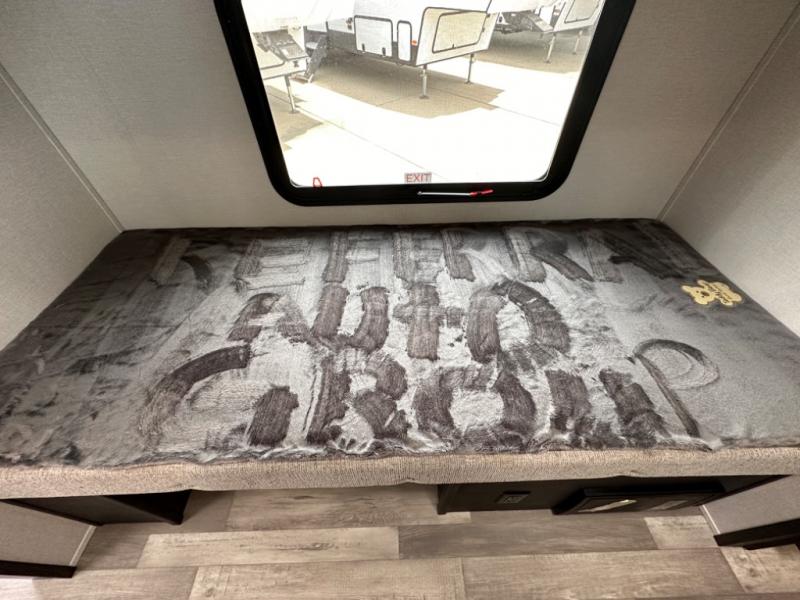 Kids or guests can enjoy their own private bunkhouse with four bunks and a rear full bath, while the front bedroom offers a queen bed and direct access to the second full bathroom. The tri-fold hide-a-bed sofa provides even more sleeping space.
