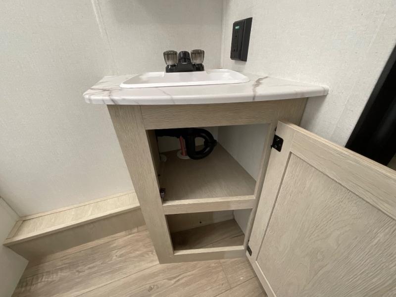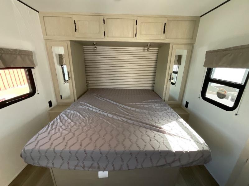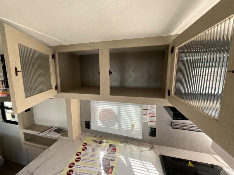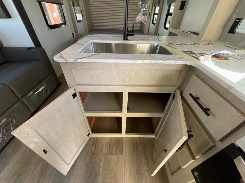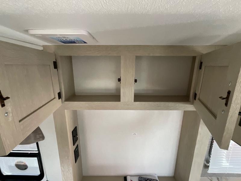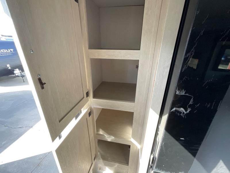 The light cabinetry and a cozy sofa plus the extra floor space from the slide out allow you to relax and unwind before exploring outdoors! There is a pantry and 10 cu. ft. residential refrigerator as you enter, and the kitchen has an L-shaped counter with extended countertop along one side. There is an entertainment center, a walk-around RV queen bed up front with wardrobes and an overhead cabinet for storage. The rear corner bathroom is complete with a 24" x 40" shower and linen storage. And the pass-through compartment allows for the larger items like camping chairs and outdoor tables, while the power awning provides some protection from the elements.