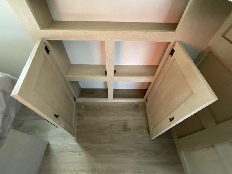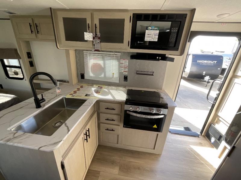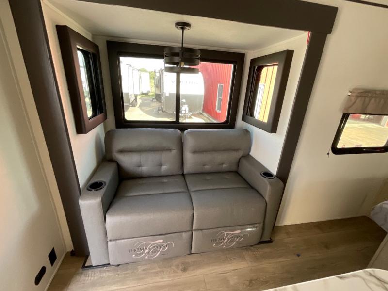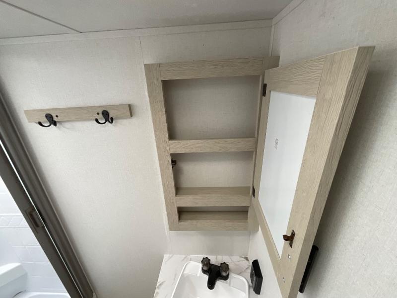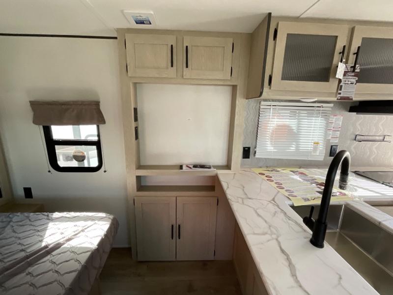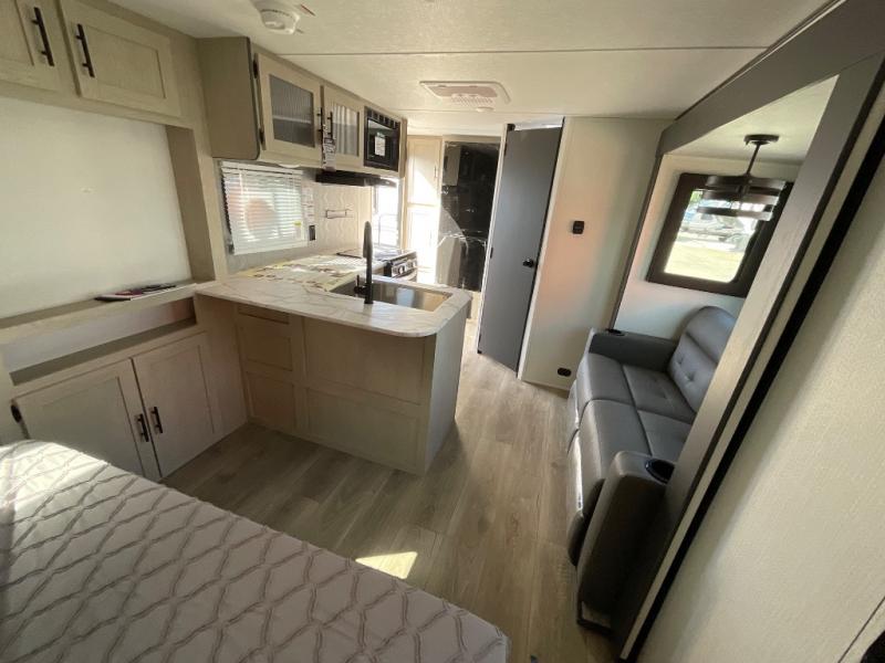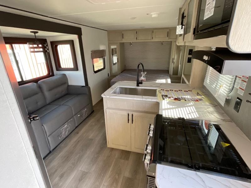 The light cabinetry and a cozy sofa plus the extra floor space from the slide out allow you to relax and unwind before exploring outdoors! There is a pantry and 10 cu. ft. residential refrigerator as you enter, and the kitchen has an L-shaped counter with extended countertop along one side. There is an entertainment center, a walk-around RV queen bed up front with wardrobes and an overhead cabinet for storage. The rear corner bathroom is complete with a 24" x 40" shower and linen storage. And the pass-through compartment allows for the larger items like camping chairs and outdoor tables, while the power awning provides some protection from the elements.