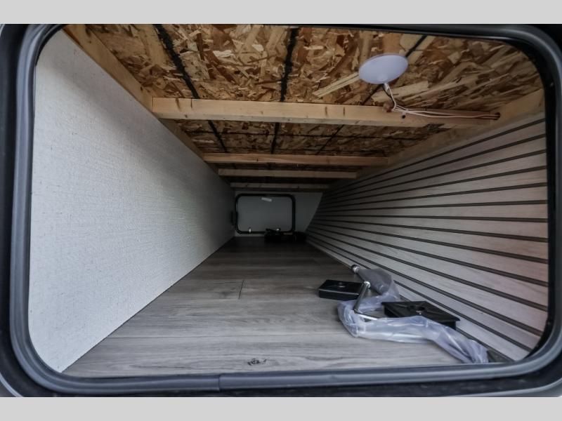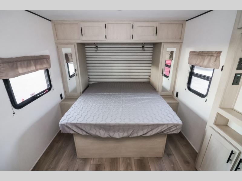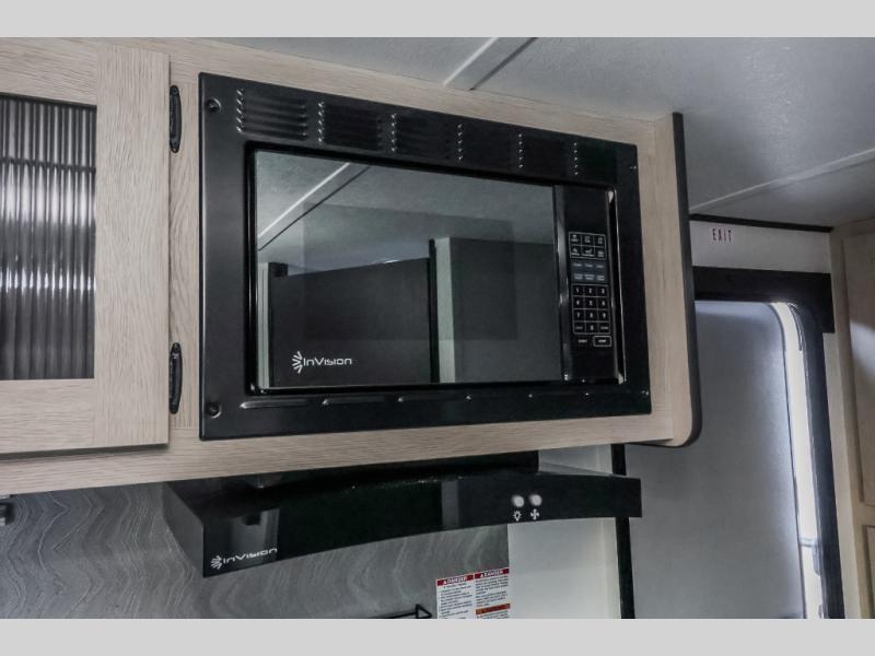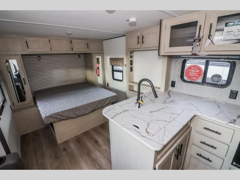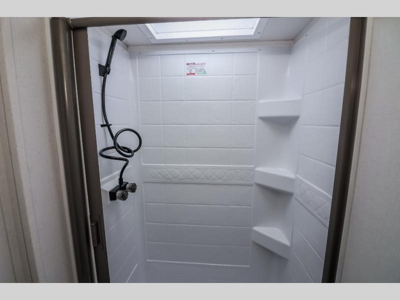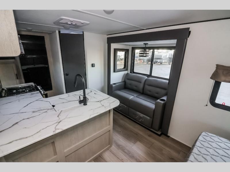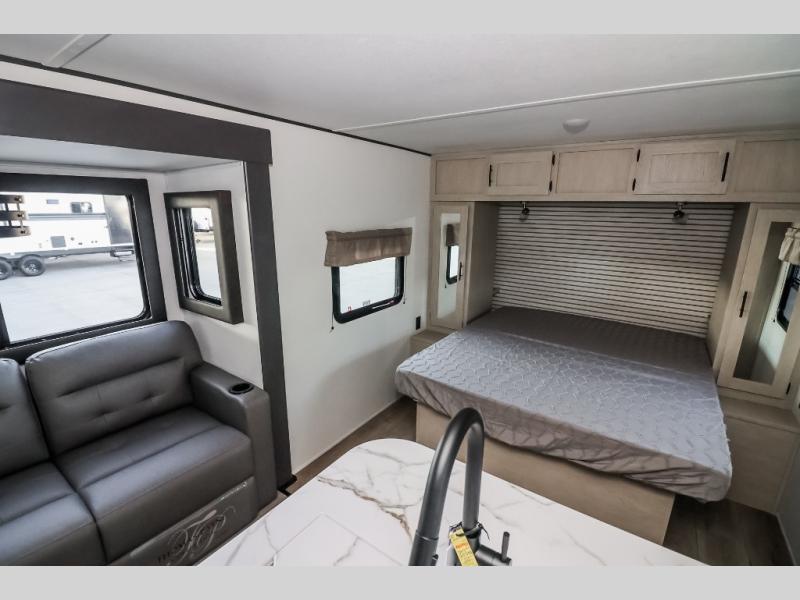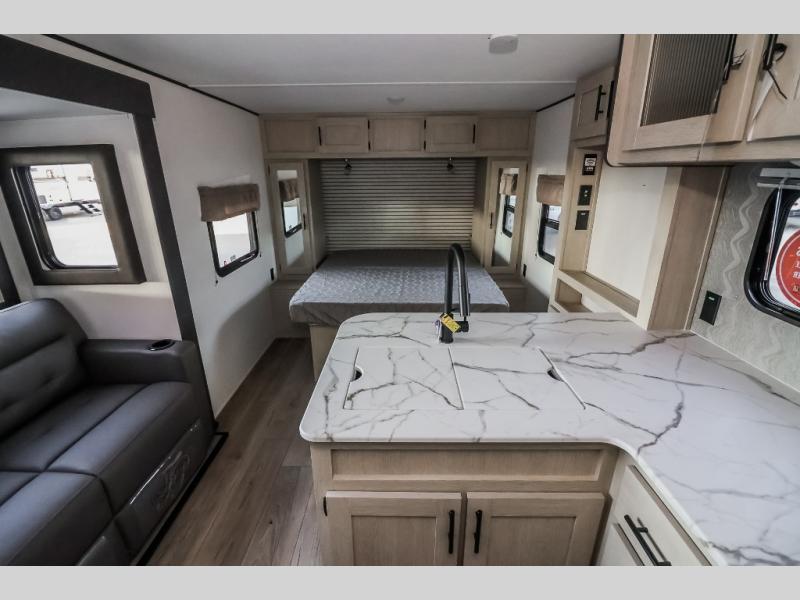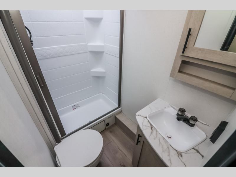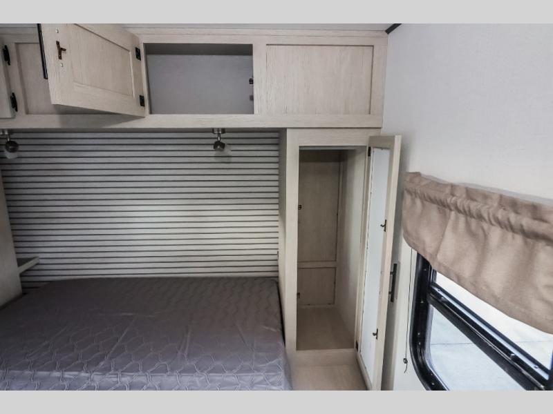 The light cabinetry and a cozy sofa plus the extra floor space from the slide out allow you to relax and unwind before exploring outdoors! There is a pantry and 10 cu. ft. residential refrigerator as you enter, and the kitchen has an L-shaped counter with extended countertop along one side. There is an entertainment center, a walk-around RV queen bed up front with wardrobes and an overhead cabinet for storage. The rear corner bathroom is complete with a 24" x 40" shower and linen storage. And the pass-through compartment allows for the larger items like camping chairs and outdoor tables, while the power awning provides some protection from the elements.