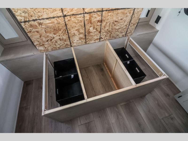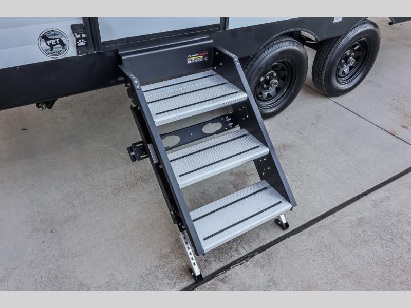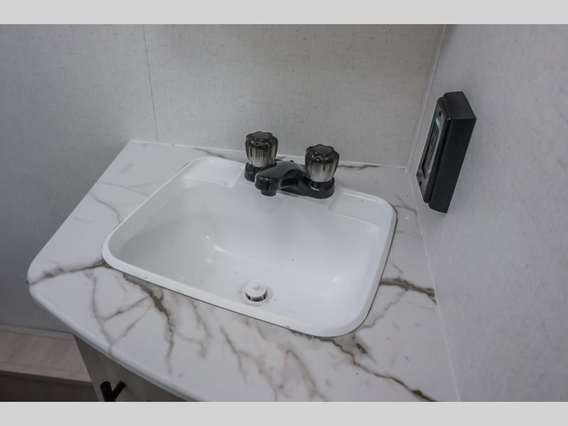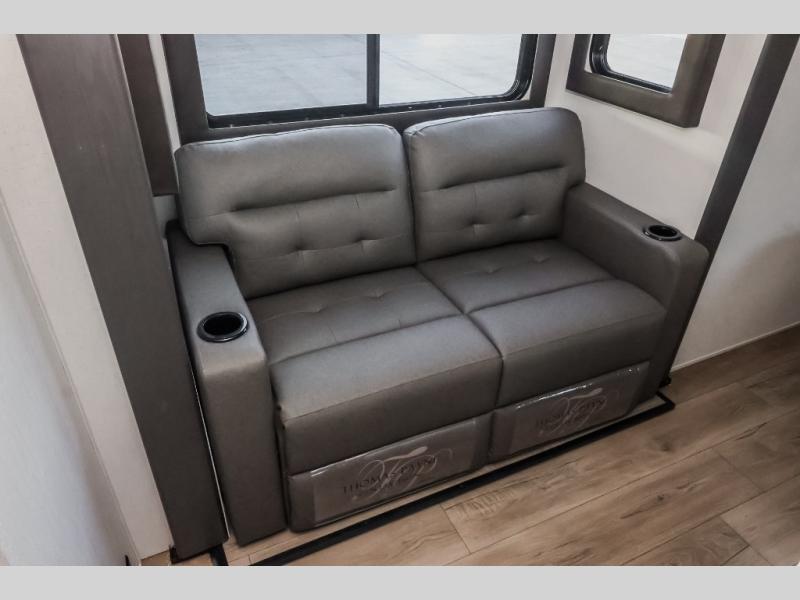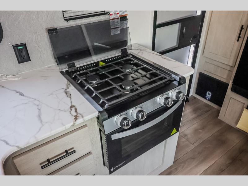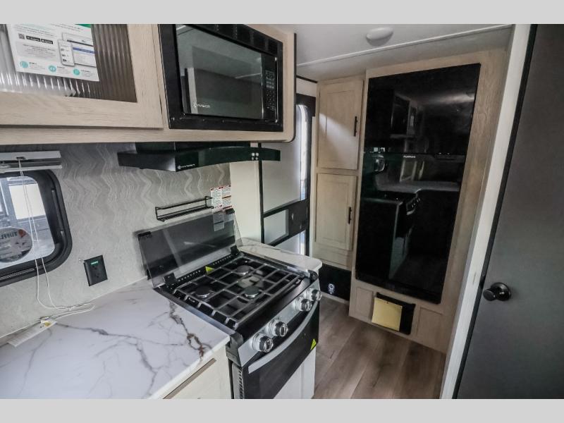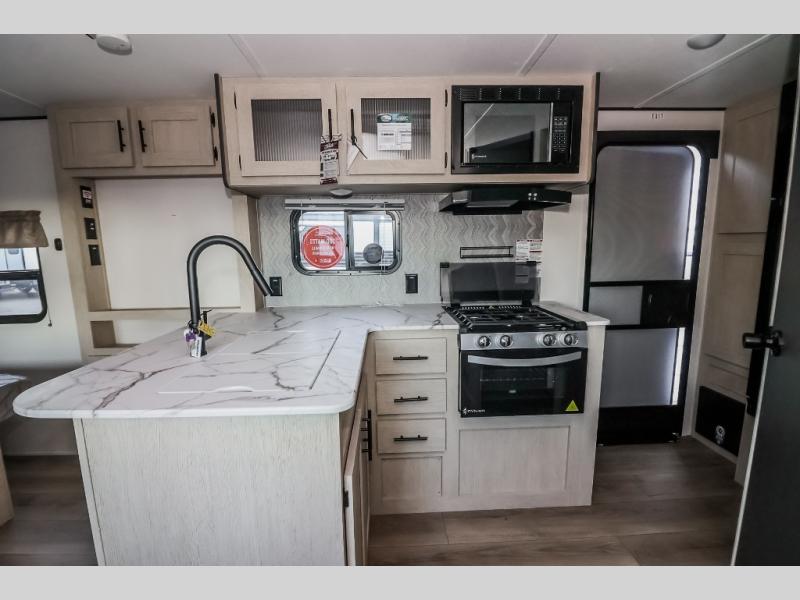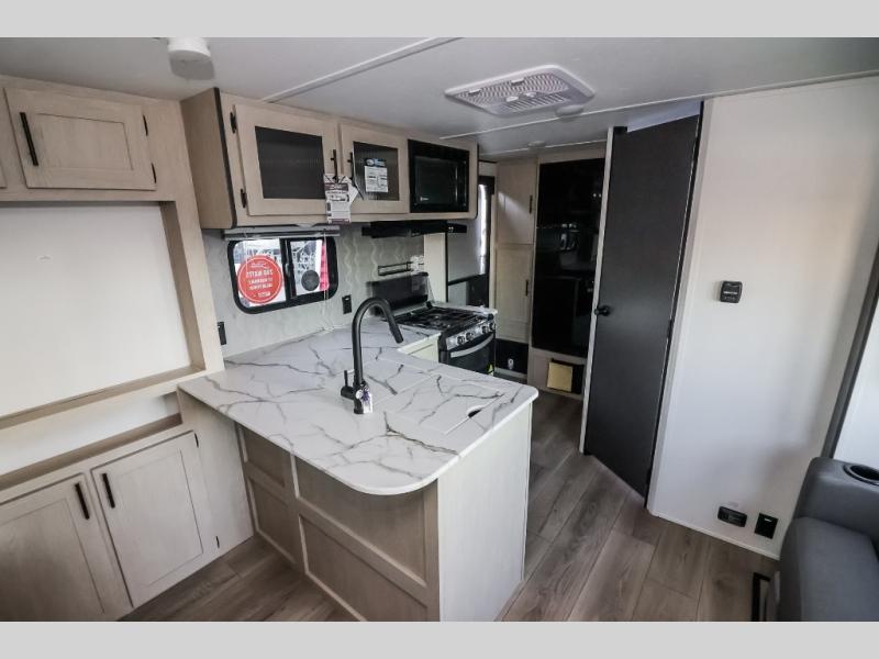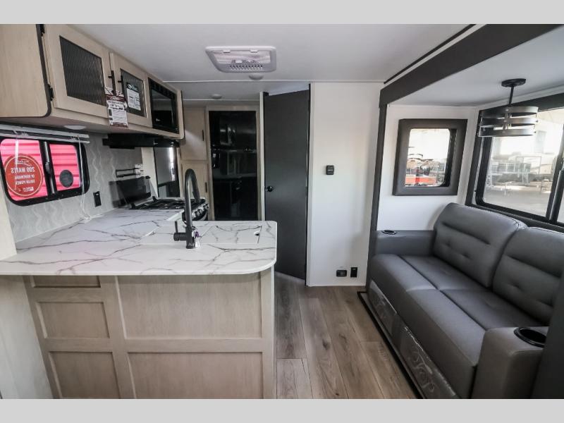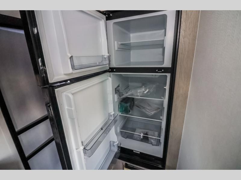 The light cabinetry and a cozy sofa plus the extra floor space from the slide out allow you to relax and unwind before exploring outdoors! There is a pantry and 10 cu. ft. residential refrigerator as you enter, and the kitchen has an L-shaped counter with extended countertop along one side. There is an entertainment center, a walk-around RV queen bed up front with wardrobes and an overhead cabinet for storage. The rear corner bathroom is complete with a 24" x 40" shower and linen storage. And the pass-through compartment allows for the larger items like camping chairs and outdoor tables, while the power awning provides some protection from the elements.