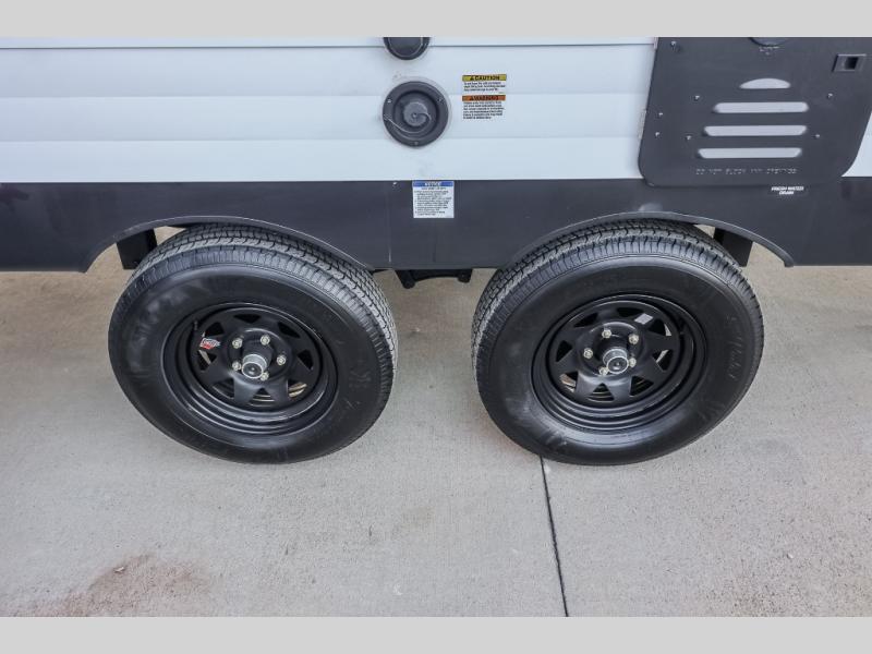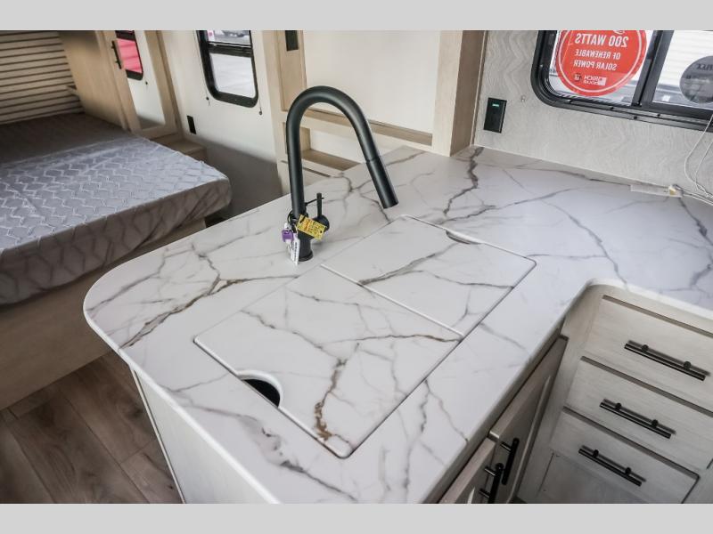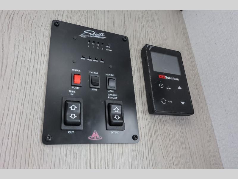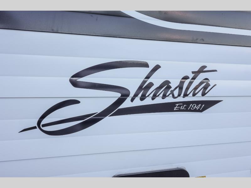 With each Shasta travel trailer by Shasta RVs, premium construction products are used such as radius wood rafters, wall studs on 16” centers, cambered steel I-beam frame, Congoleum flooring, and seamless countertops. Also included is an aerodynamic radius front profile, a front colored rock guard to protect against road debris, a straight axle with electric brakes, and a power tongue jack for easy setup. The interior offers decorative cabinet pulls, USB charging stations, an under-mount kitchen sink with a sink cover, and more providing value and convenience. The 200W solar panel comes with a 30 amp controller, and the tankless water heater will provide endless hot showers.