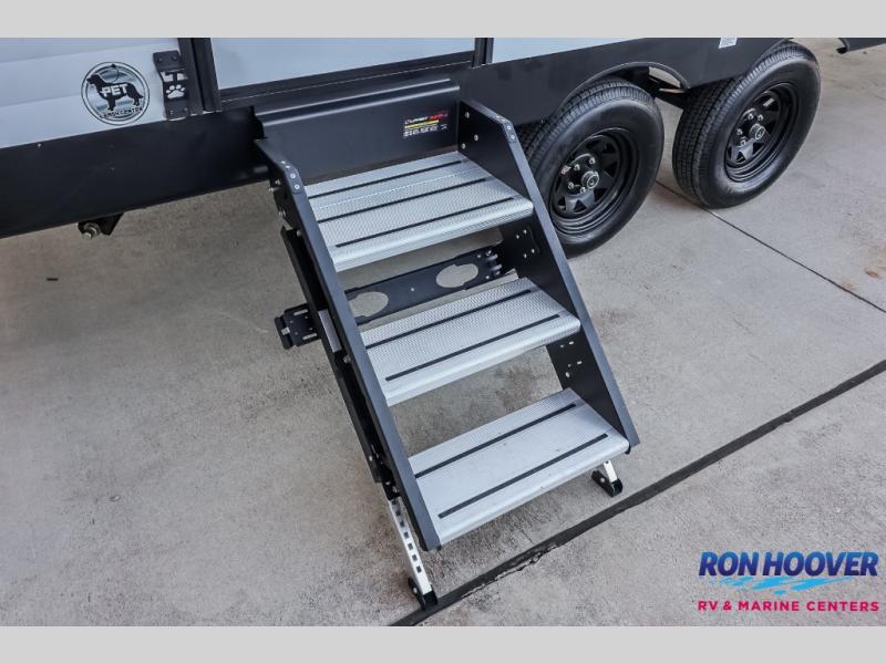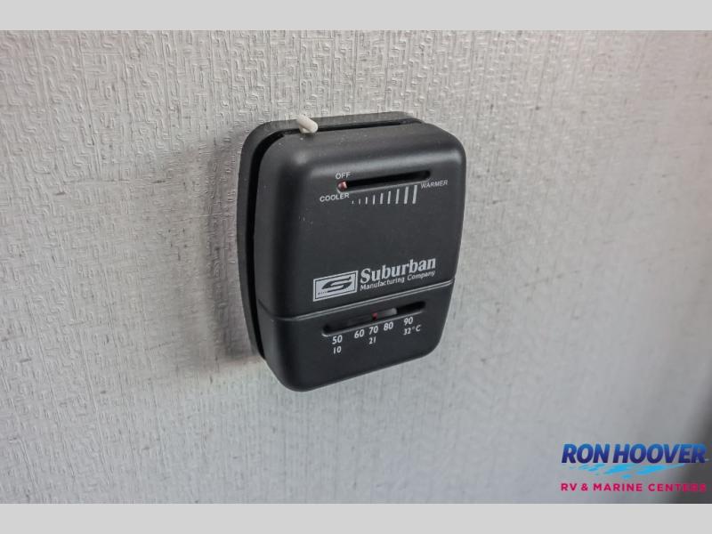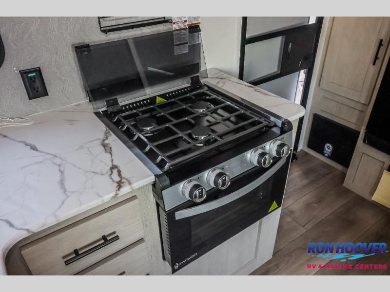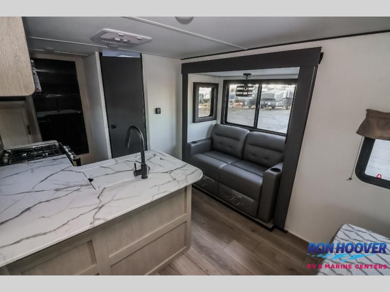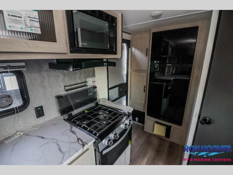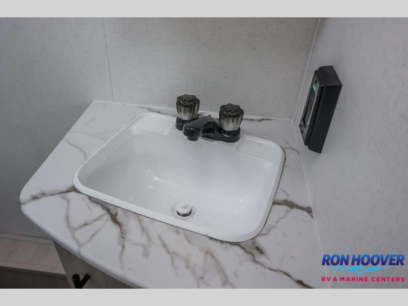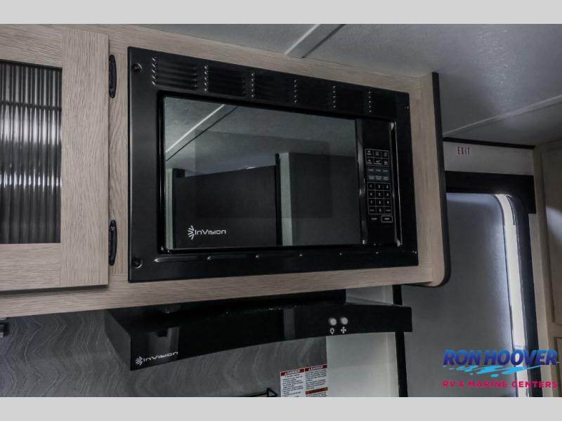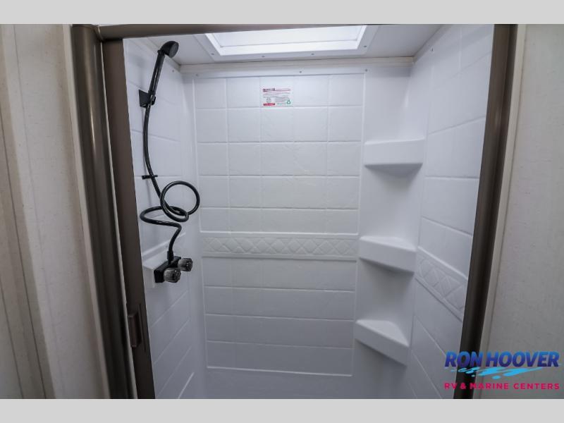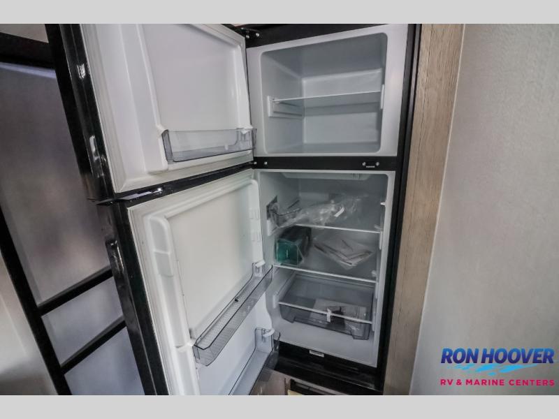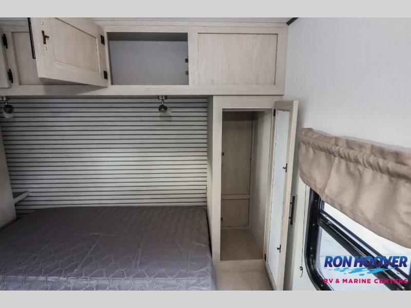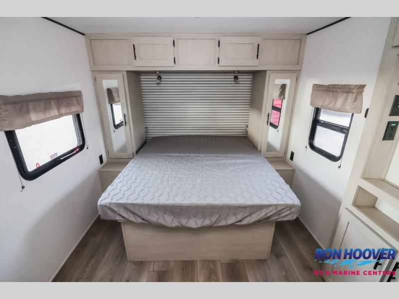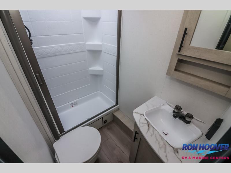 The light cabinetry and a cozy sofa plus the extra floor space from the slide out allow you to relax and unwind before exploring outdoors! There is a pantry and 10 cu. ft. residential refrigerator as you enter, and the kitchen has an L-shaped counter with extended countertop along one side. There is an entertainment center, a walk-around RV queen bed up front with wardrobes and an overhead cabinet for storage. The rear corner bathroom is complete with a 24" x 40" shower and linen storage. And the pass-through compartment allows for the larger items like camping chairs and outdoor tables, while the power awning provides some protection from the elements.