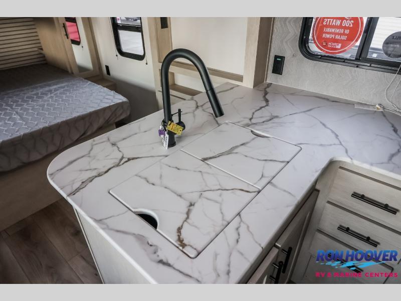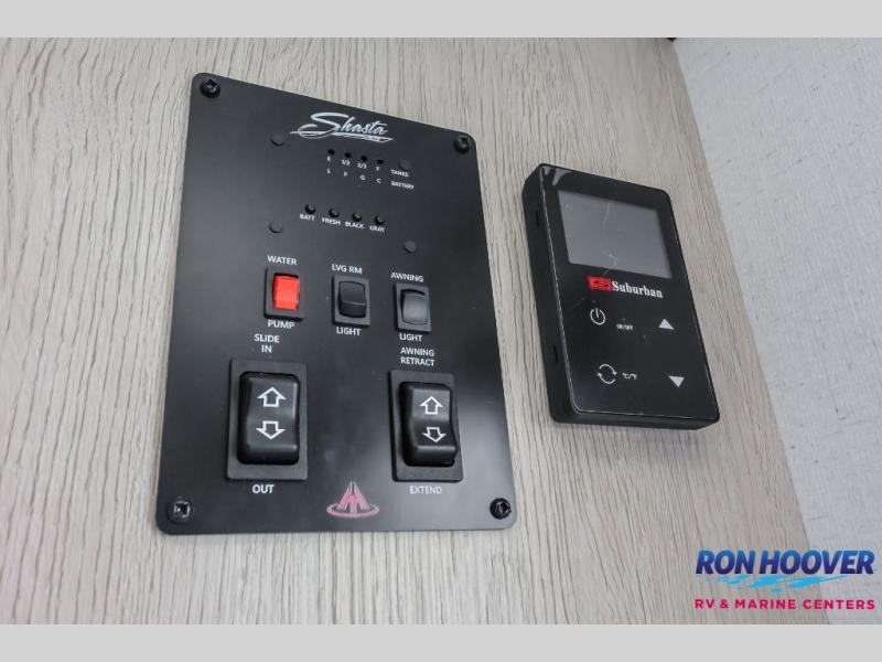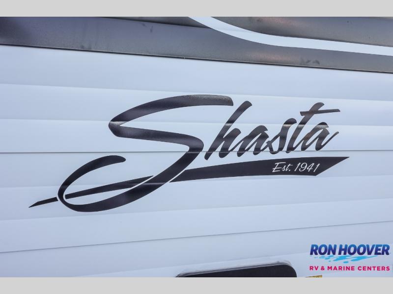 With each Shasta travel trailer by Shasta RVs, premium construction products are used such as radius wood rafters, wall studs on 16” centers, cambered steel I-beam frame, Congoleum flooring, and seamless countertops. Also included is an aerodynamic radius front profile, a front colored rock guard to protect against road debris, a straight axle with electric brakes, and a power tongue jack for easy setup. The interior offers decorative cabinet pulls, USB charging stations, an under-mount kitchen sink with a sink cover, and more providing value and convenience. The 200W solar panel comes with a 30 amp controller, and the tankless water heater will provide endless hot showers.