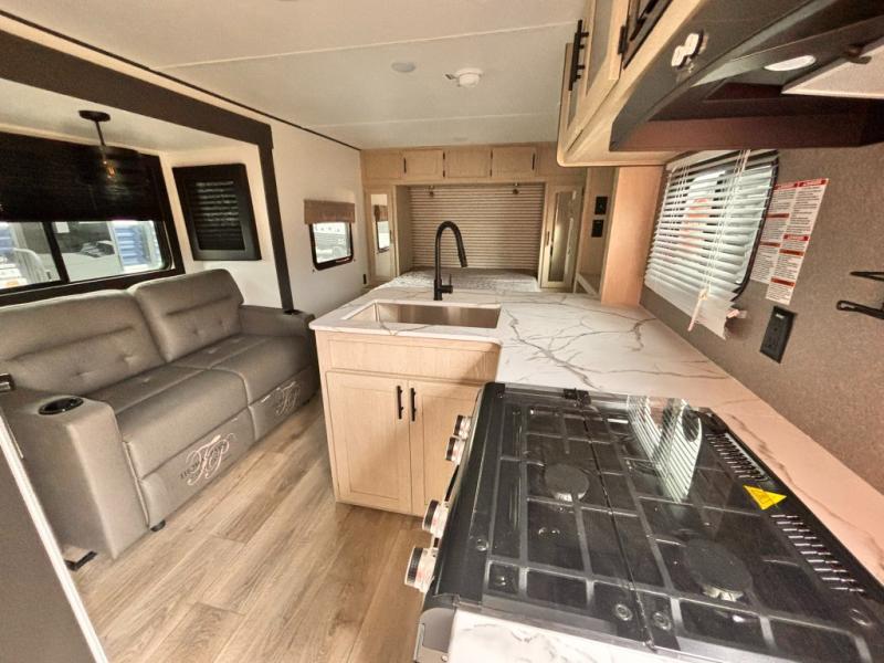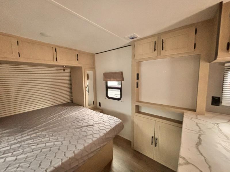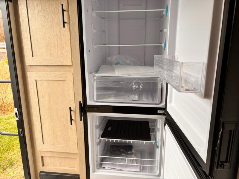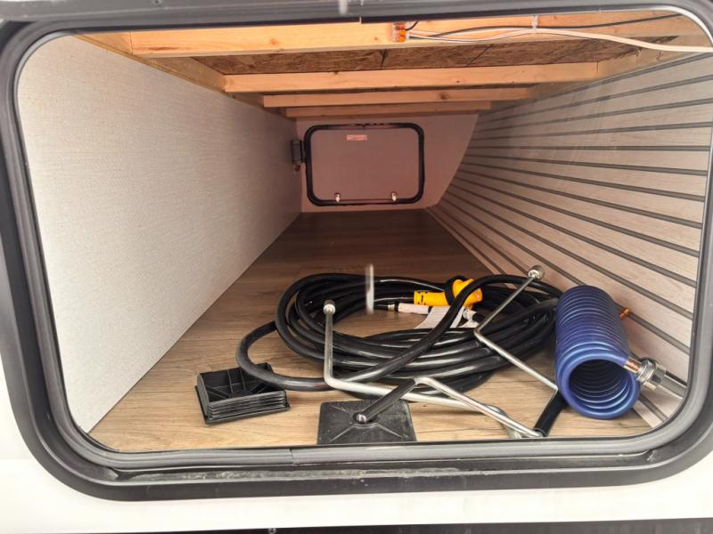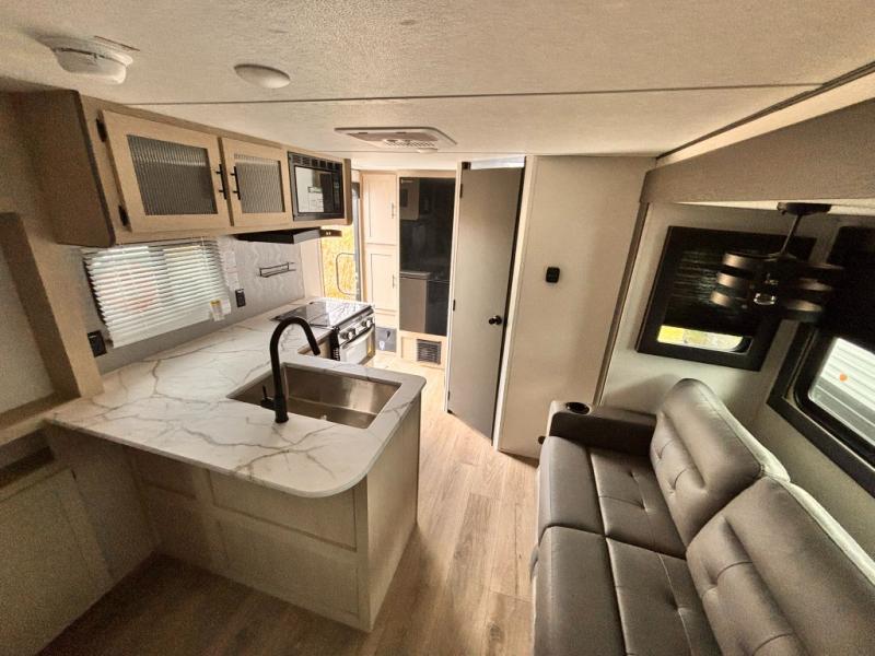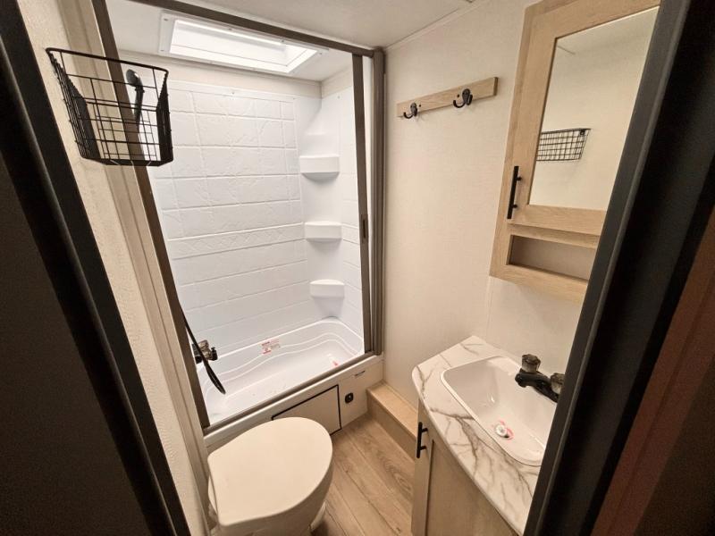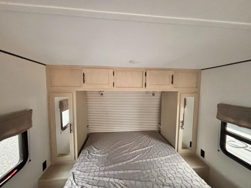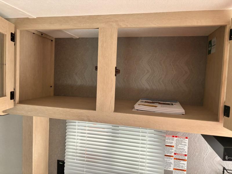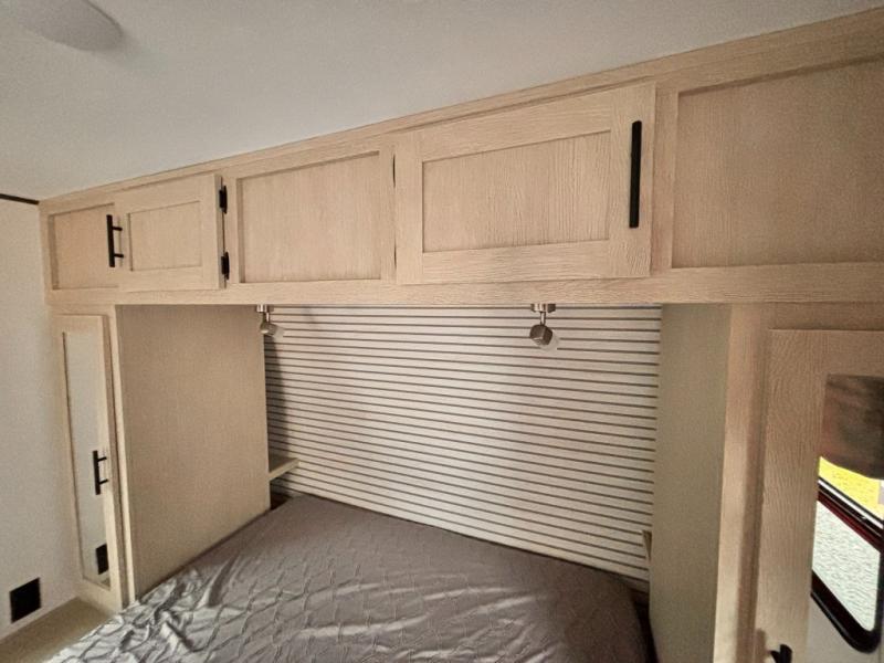 The light cabinetry and a cozy sofa plus the extra floor space from the slide out allow you to relax and unwind before exploring outdoors! There is a pantry and 10 cu. ft. residential refrigerator as you enter, and the kitchen has an L-shaped counter with extended countertop along one side. There is an entertainment center, a walk-around RV queen bed up front with wardrobes and an overhead cabinet for storage. The rear corner bathroom is complete with a 24" x 40" shower and linen storage. And the pass-through compartment allows for the larger items like camping chairs and outdoor tables, while the power awning provides some protection from the elements.
