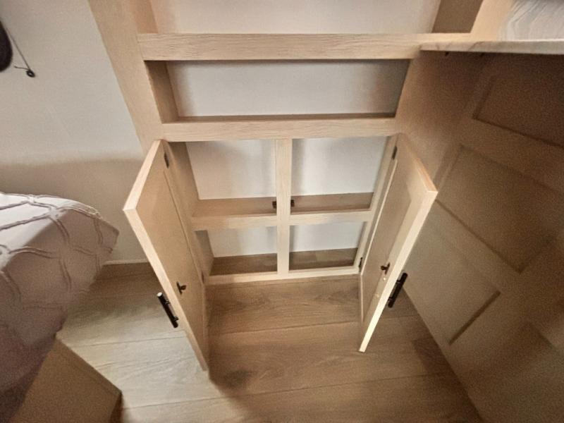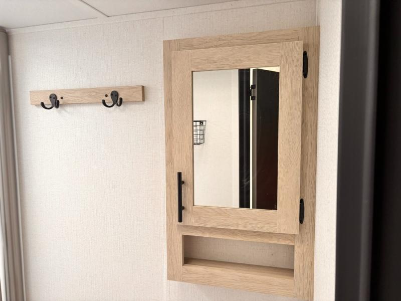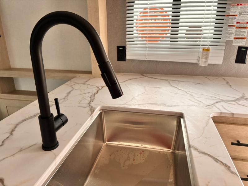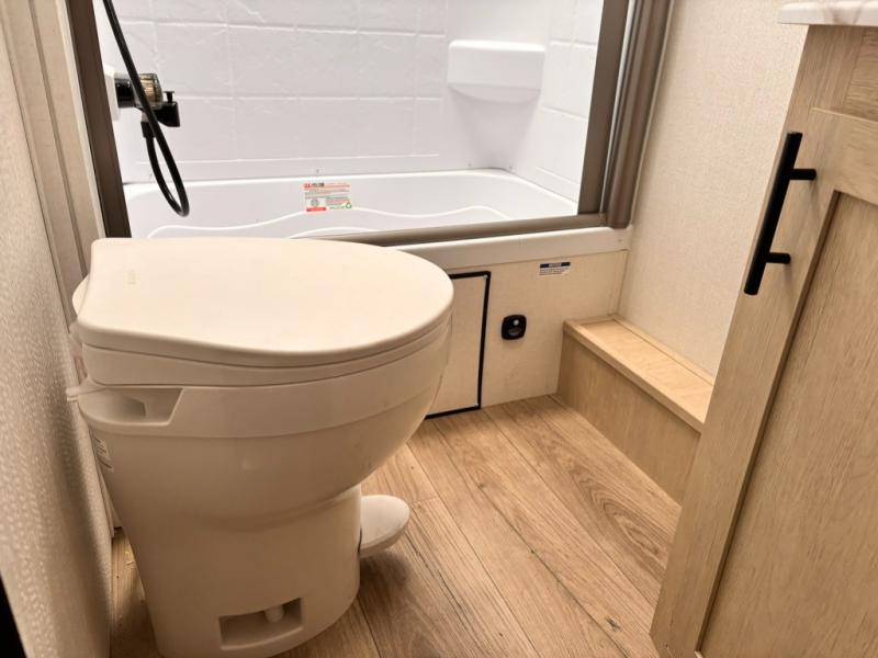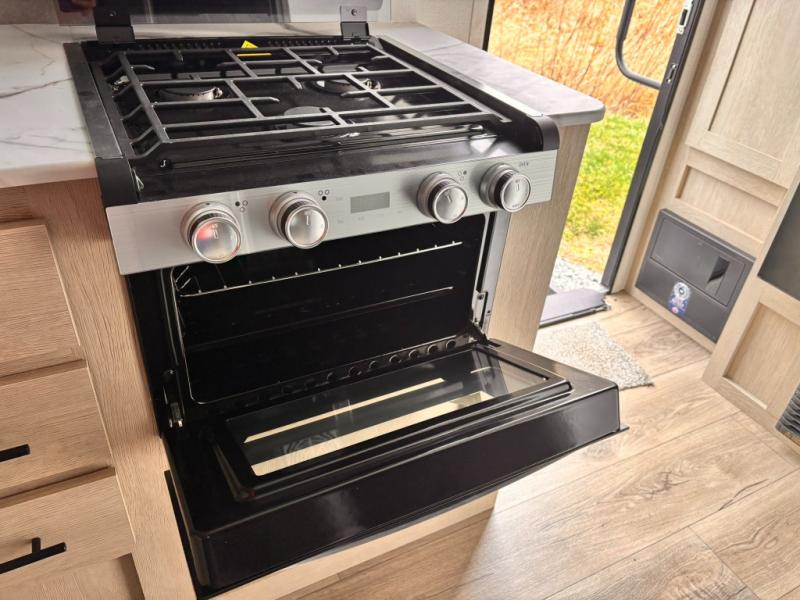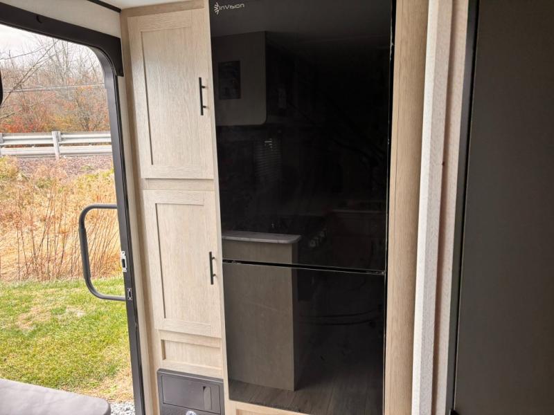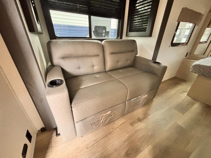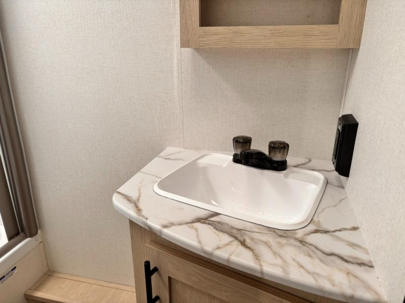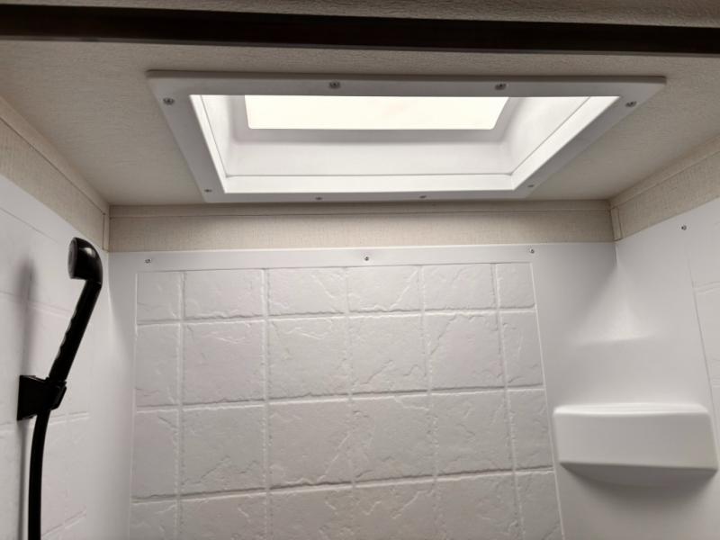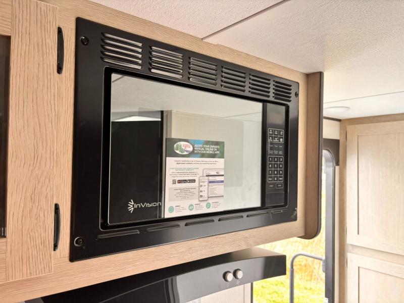 The light cabinetry and a cozy sofa plus the extra floor space from the slide out allow you to relax and unwind before exploring outdoors! There is a pantry and 10 cu. ft. residential refrigerator as you enter, and the kitchen has an L-shaped counter with extended countertop along one side. There is an entertainment center, a walk-around RV queen bed up front with wardrobes and an overhead cabinet for storage. The rear corner bathroom is complete with a 24" x 40" shower and linen storage. And the pass-through compartment allows for the larger items like camping chairs and outdoor tables, while the power awning provides some protection from the elements.