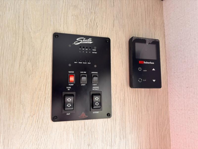 With each Shasta travel trailer by Shasta RVs, premium construction products are used such as radius wood rafters, wall studs on 16” centers, cambered steel I-beam frame, Congoleum flooring, and seamless countertops. Also included is an aerodynamic radius front profile, a front colored rock guard to protect against road debris, a straight axle with electric brakes, and a power tongue jack for easy setup. The interior offers decorative cabinet pulls, USB charging stations, an under-mount kitchen sink with a sink cover, and more providing value and convenience. The 200W solar panel comes with a 30 amp controller, and the tankless water heater will provide endless hot showers.