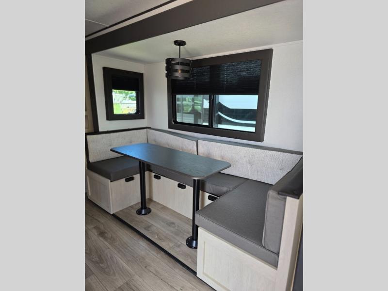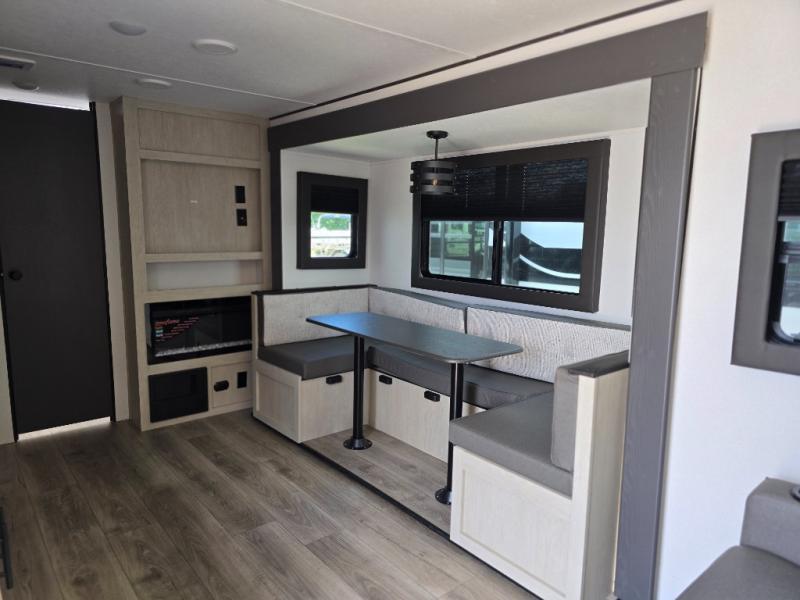 Whether you camp locally or far away, you will be able to enjoy a spacious interior and privacy in this trailer! From the rear full bathroom with an upper storage cabinet and linen storage to the front bedroom with a door to close when you are ready for bed, privacy is no issue. The walk-around RV queen bed offers dual wardrobes and an overhead cabinet to keep your things organized. The combined living and kitchen provides more floor space thanks to the U-shaped dinette, and the sofa provides more seating. The cook will love the galley kitchen with everything nearby including a pantry. Yet the outside kitchen will give them choices when making meals.