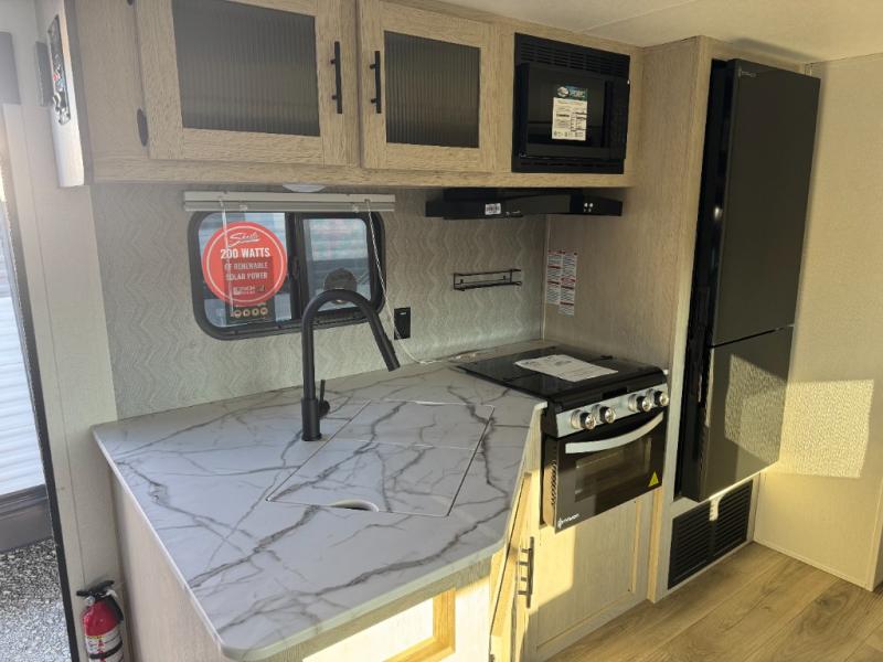 With each Shasta travel trailer by Shasta RVs, premium construction products are used such as radius wood rafters, wall studs on 16” centers, cambered steel I-beam frame, Congoleum flooring, and seamless countertops. Also included is an aerodynamic radius front profile, a front colored rock guard to protect against road debris, a straight axle with electric brakes, and a power tongue jack for easy setup. The interior offers decorative cabinet pulls, USB charging stations, an under-mount kitchen sink with a sink cover, and more providing value and convenience. The 200W solar panel comes with a 30 amp controller, and the tankless water heater will provide endless hot showers.
