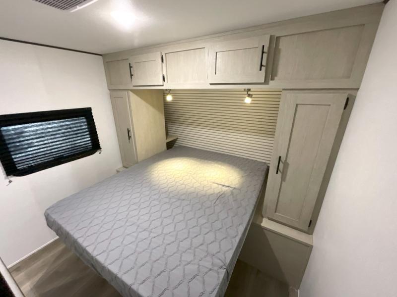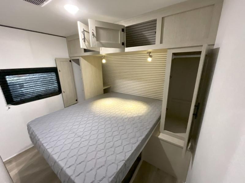 You and your guests will appreciate having privacy in this spacious travel trailer with a rear bunkhouse and a front bedroom! The bunkhouse includes four bunks, two storage cabinets, plus a hanging bar so clothes stay wrinkle-free. A queen bed comes standard in the front bedroom to ensure a great night's rest, plus there are dual bedroom wardrobes and two bed shelves to keep valuables close by. Everyone can meet in the combined kitchen and living area that includes a large slide out for more space. The sofa and U-shaped dinette here will provide a place to relax, play games, and even sleep more guests if needed. And of course, you can't overlook the full bath, complete with a large sink, shower skylight, and powered roof vent to keep everything fresh!