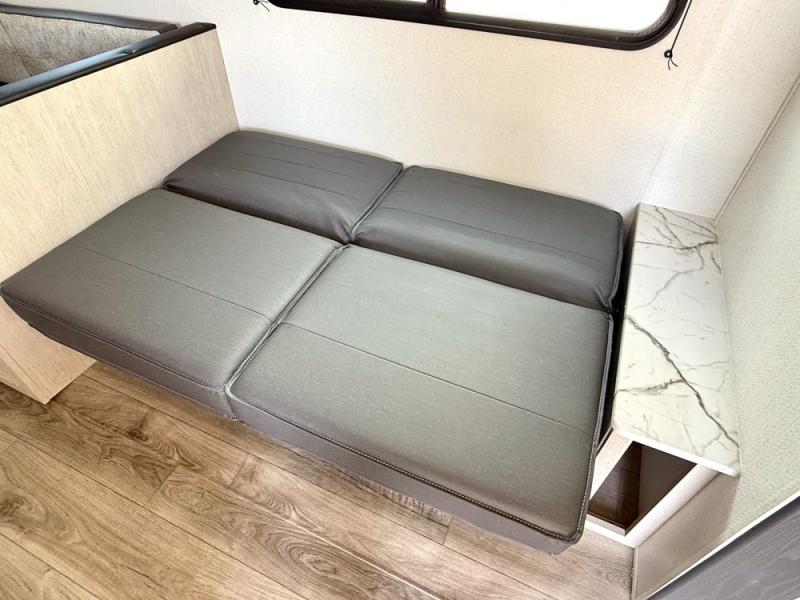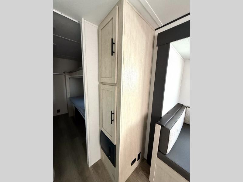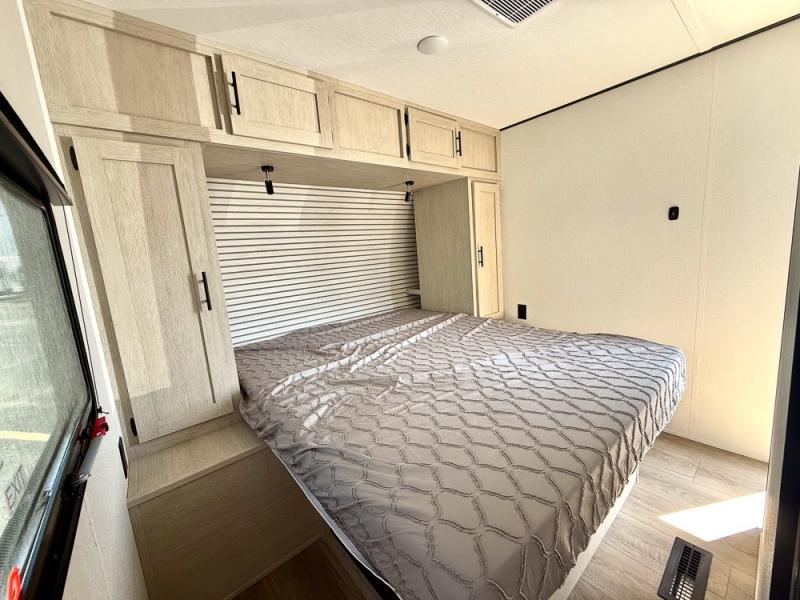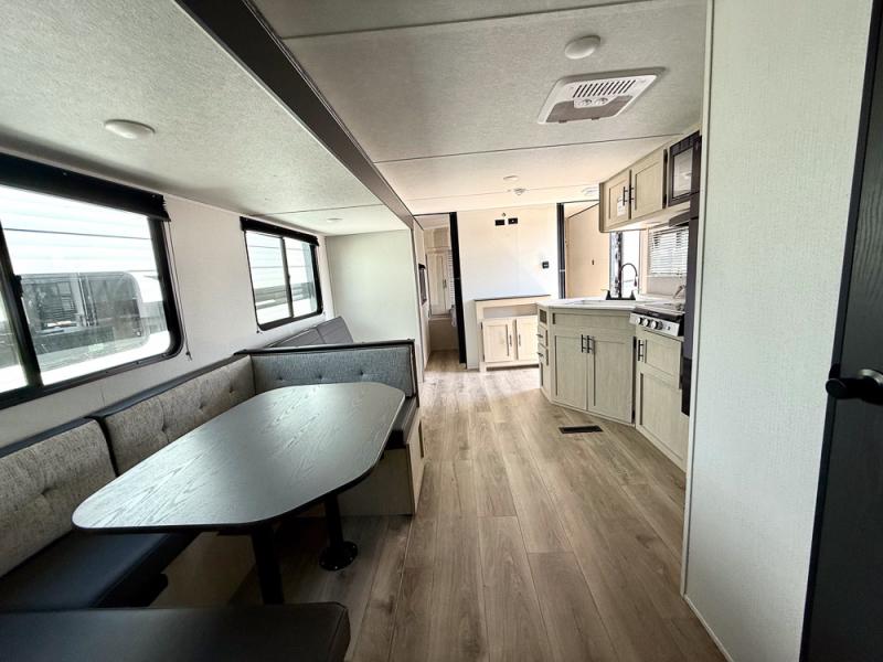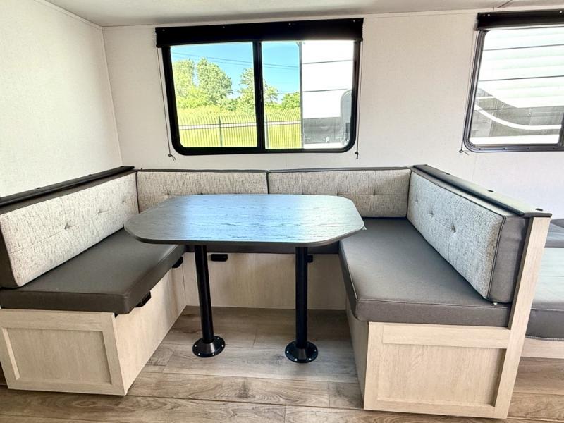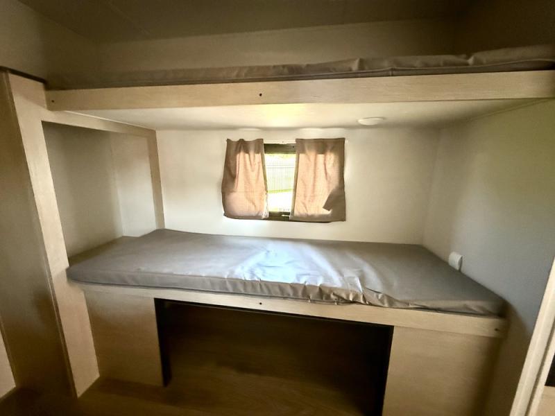 You and your guests will appreciate having privacy in this spacious travel trailer with a rear bunkhouse and a front bedroom! The bunkhouse includes four bunks, two storage cabinets, plus a hanging bar so clothes stay wrinkle-free. A queen bed comes standard in the front bedroom to ensure a great night's rest, plus there are dual bedroom wardrobes and two bed shelves to keep valuables close by. Everyone can meet in the combined kitchen and living area that includes a large slide out for more space. The sofa and U-shaped dinette here will provide a place to relax, play games, and even sleep more guests if needed. And of course, you can't overlook the full bath, complete with a large sink, shower skylight, and powered roof vent to keep everything fresh!