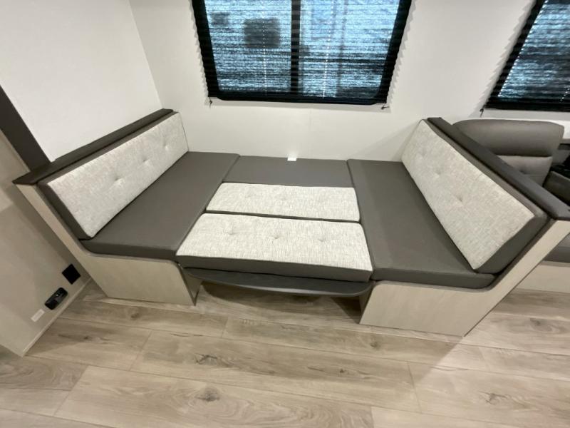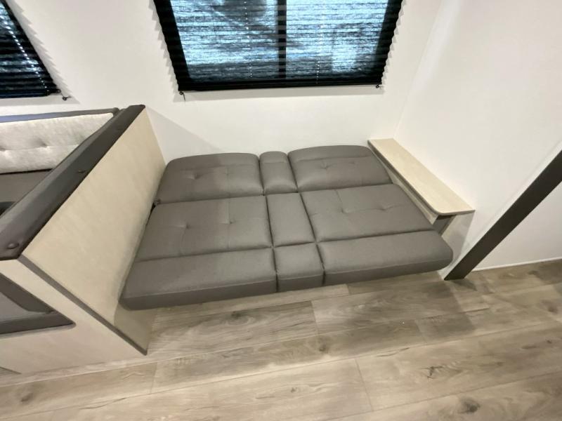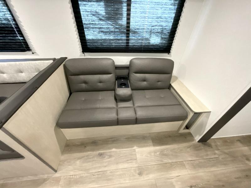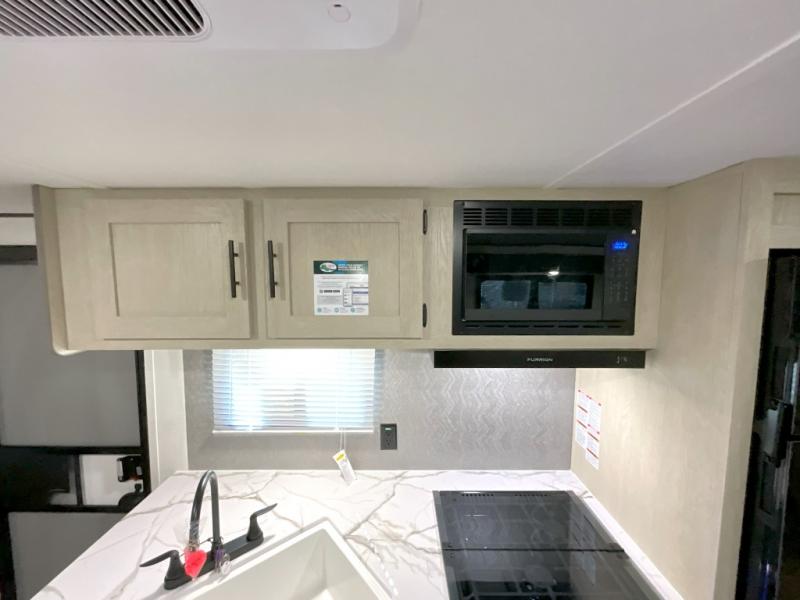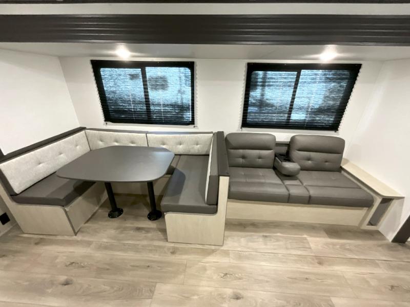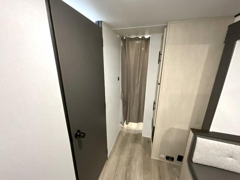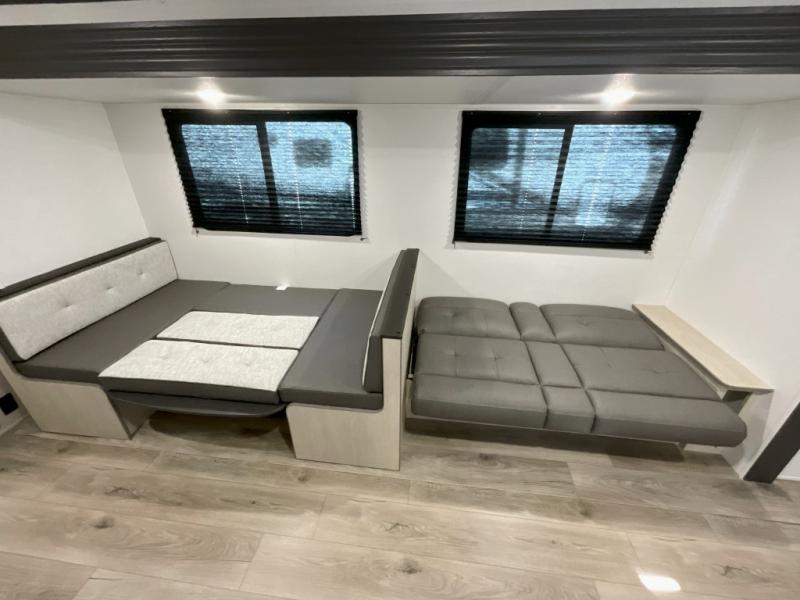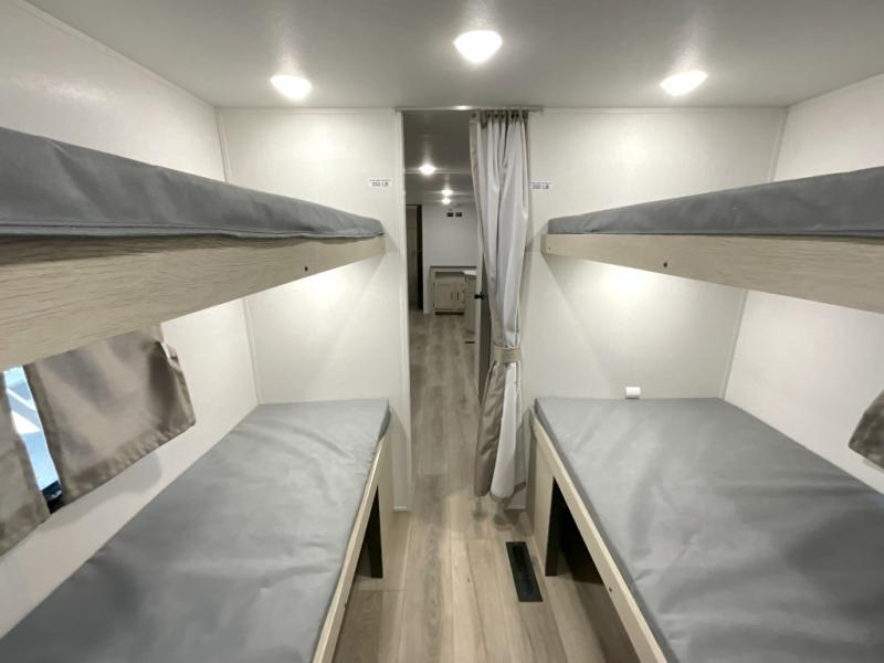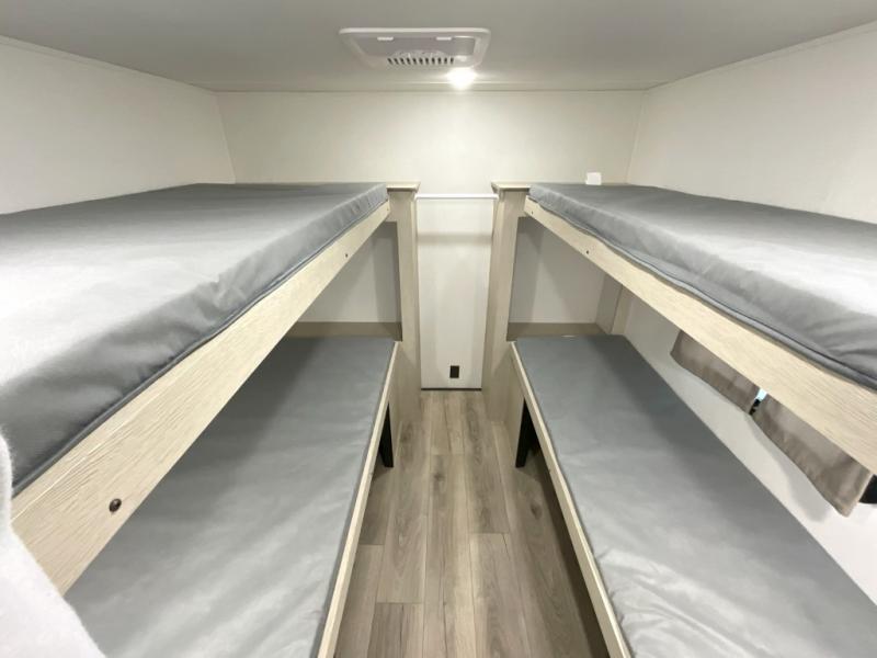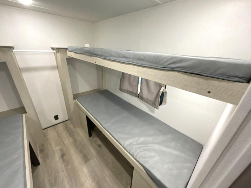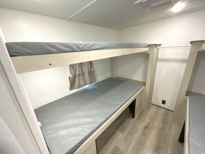 You and your guests will appreciate having privacy in this spacious travel trailer with a rear bunkhouse and a front bedroom! The bunkhouse includes four bunks, two storage cabinets, plus a hanging bar so clothes stay wrinkle-free. A queen bed comes standard in the front bedroom to ensure a great night's rest, plus there are dual bedroom wardrobes and two bed shelves to keep valuables close by. Everyone can meet in the combined kitchen and living area that includes a large slide out for more space. The sofa and U-shaped dinette here will provide a place to relax, play games, and even sleep more guests if needed. And of course, you can't overlook the full bath, complete with a large sink, shower skylight, and powered roof vent to keep everything fresh!