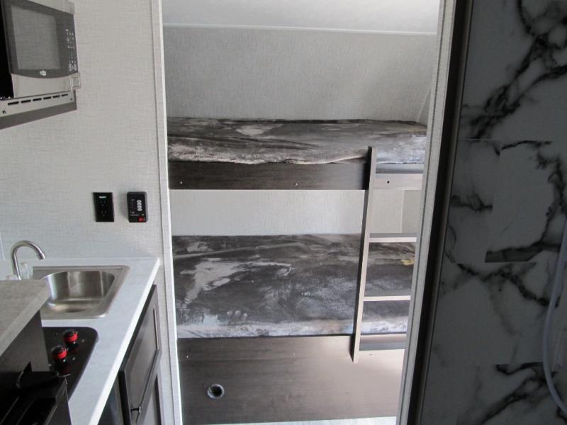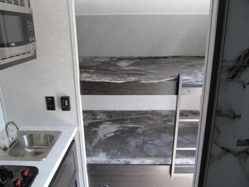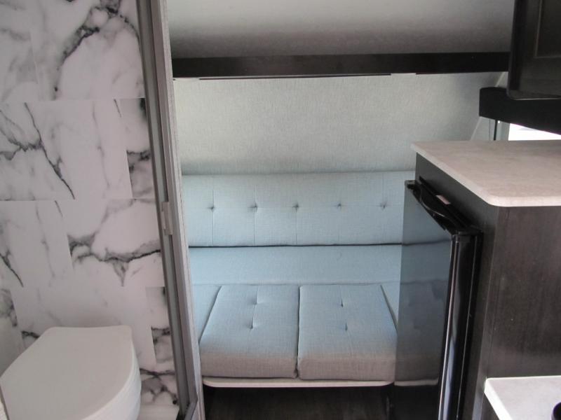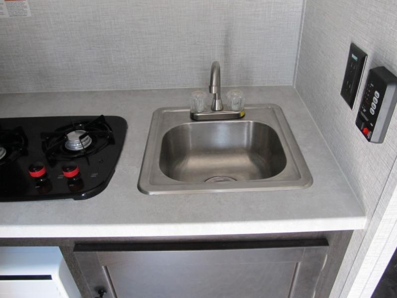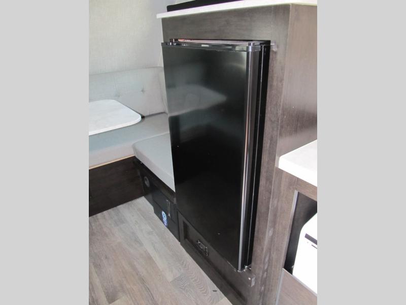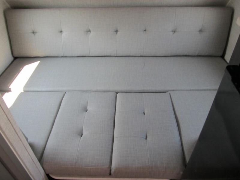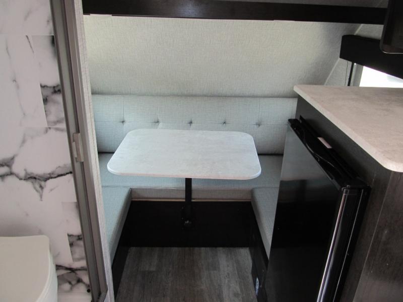 If you're looking for a little more space and comfort, this trailer may just be the one for you! There is a U-shaped dinette in the back that will double as dining and sleeping space for guests. You can freshen up in the wet bath, then start breakfast on the two burner cooktop. There is also a microwave oven for instant oatmeal and a 12V refrigerator where milk can be stored. This model also includes a front bed where you can rest up before a new day of exploring!