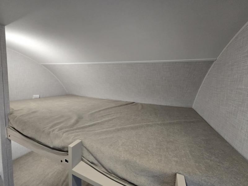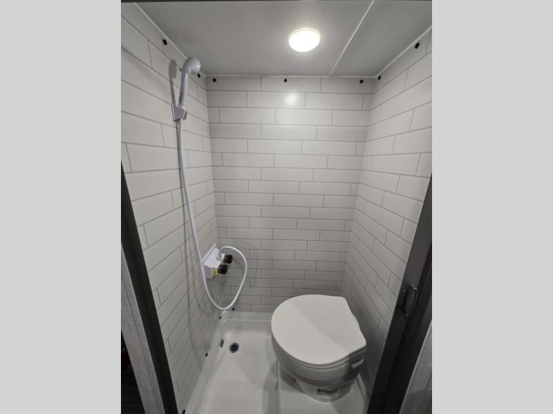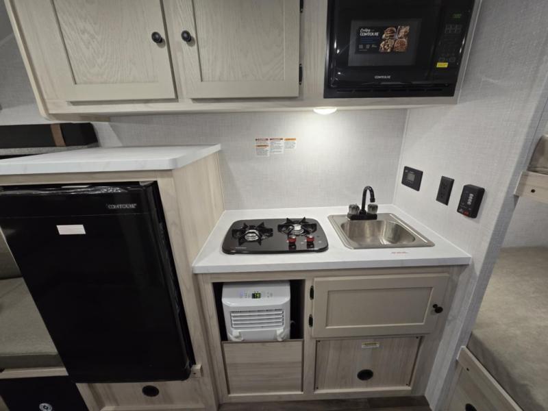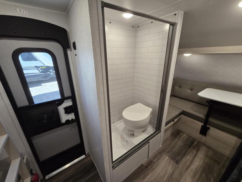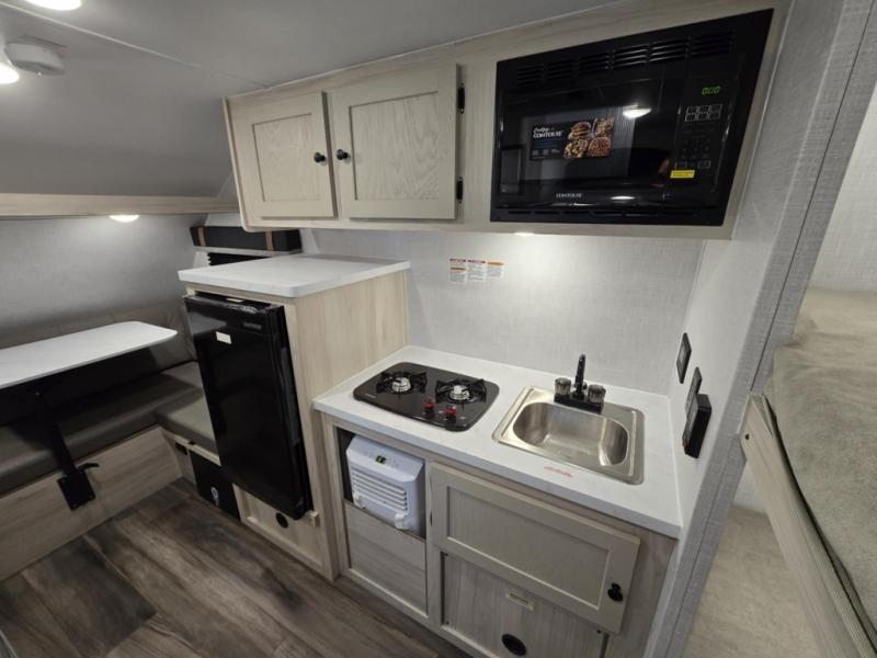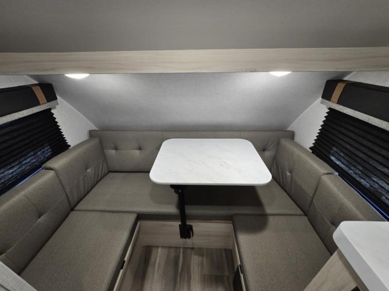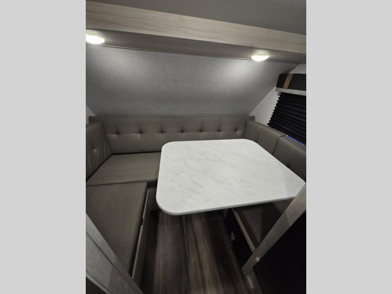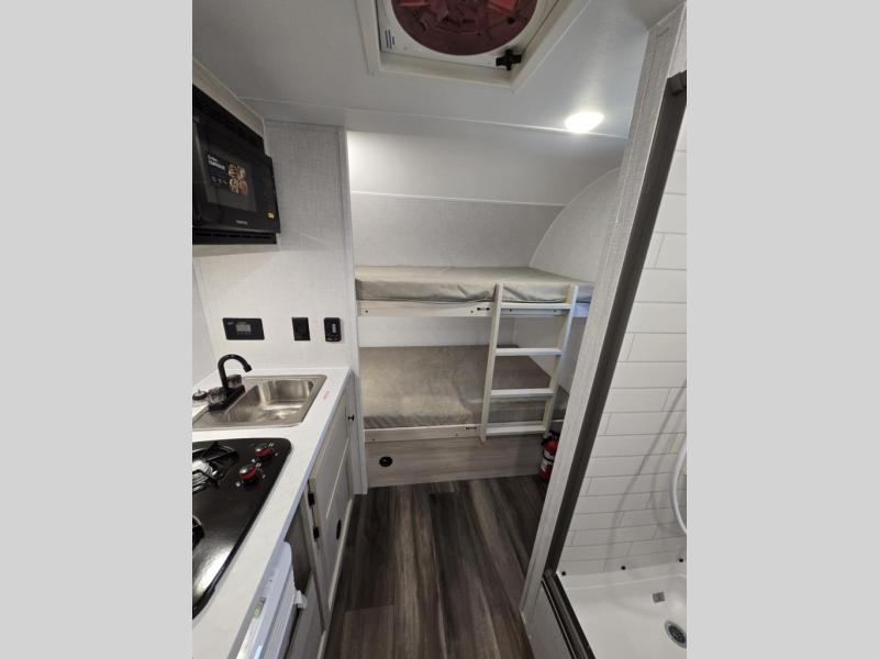 If you're looking for a little more space and comfort, this trailer may just be the one for you! There is a U-shaped dinette in the back that will double as dining and sleeping space for guests plus front bunk beds to sleep four total. You can freshen up in the wet bath, then start breakfast on the two burner cooktop. There is also a microwave oven for instant oatmeal and a 3.3 cu. ft. Super Chill 12V refrigerator where milk can be stored. And a Truma Combi heater and water heater plus a 110V floor-mounted A/C will help keep you comfortable in all your adventures!