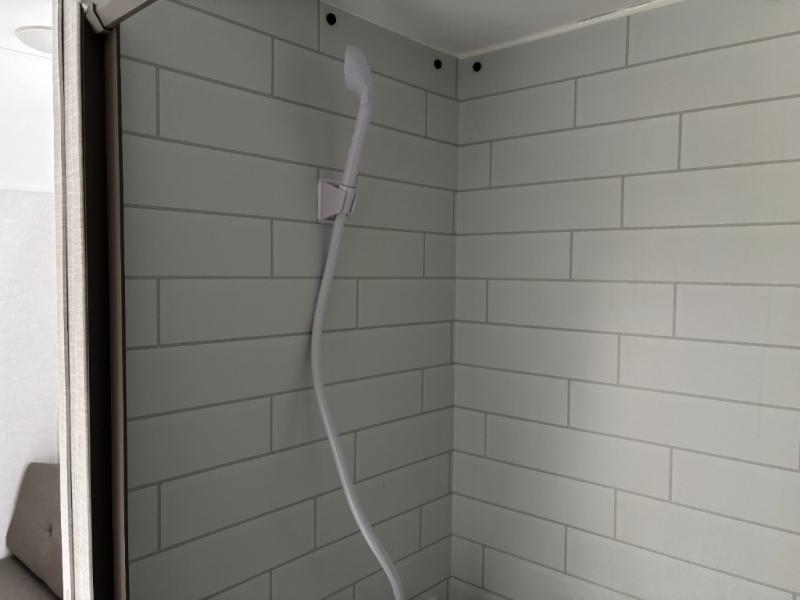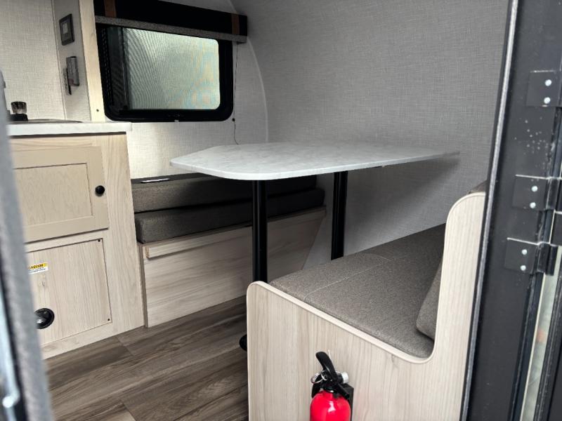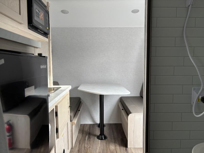 If you're looking for a little more space and comfort, this trailer may just be the one for you! The queen bed in the back will provide a great night's rest after exploring all day, and the overhead shelf will let you organize your books and belongings. You can freshen up in the wet bath with a retractable door for more space, then start breakfast on the two burner cooktop. There is also a microwave oven for instant oatmeal and a 12V refrigerator where milk can be stored. This model also includes two sofas with a table up front to dine at and even let one adult or two small children sleep on!