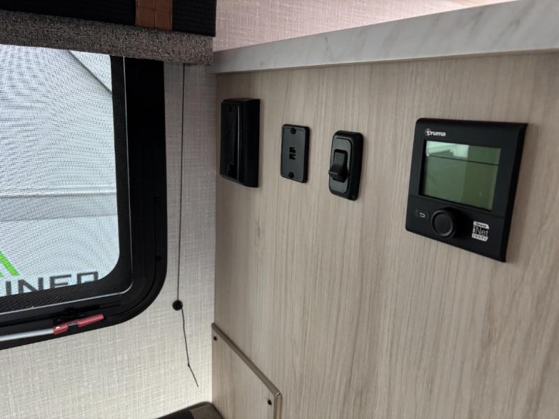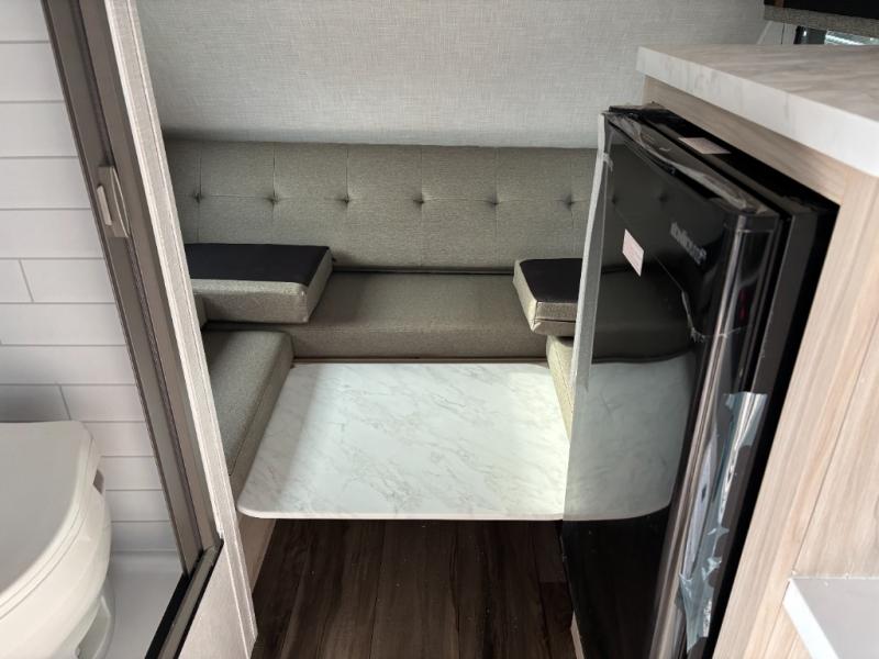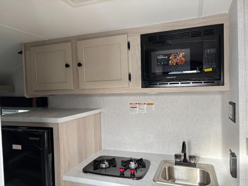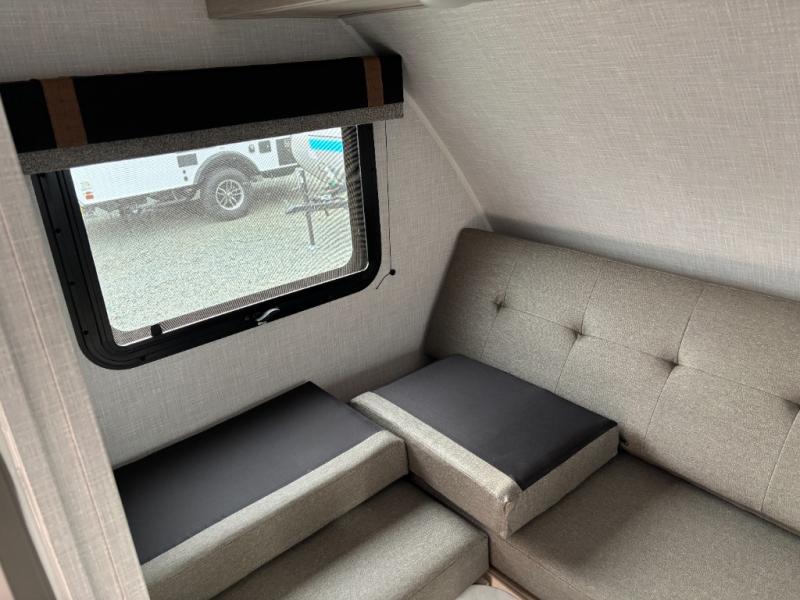 If you're looking for a little more space and comfort, this trailer may just be the one for you! There is a U-shaped dinette in the back that will double as dining and sleeping space for guests. You can freshen up in the wet bath, then start breakfast on the two burner cooktop. There is also a microwave oven for instant oatmeal and a 12V refrigerator where milk can be stored. This model also includes a front bed where you can rest up before a new day of exploring!