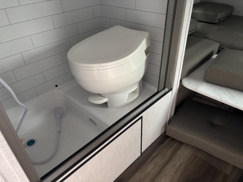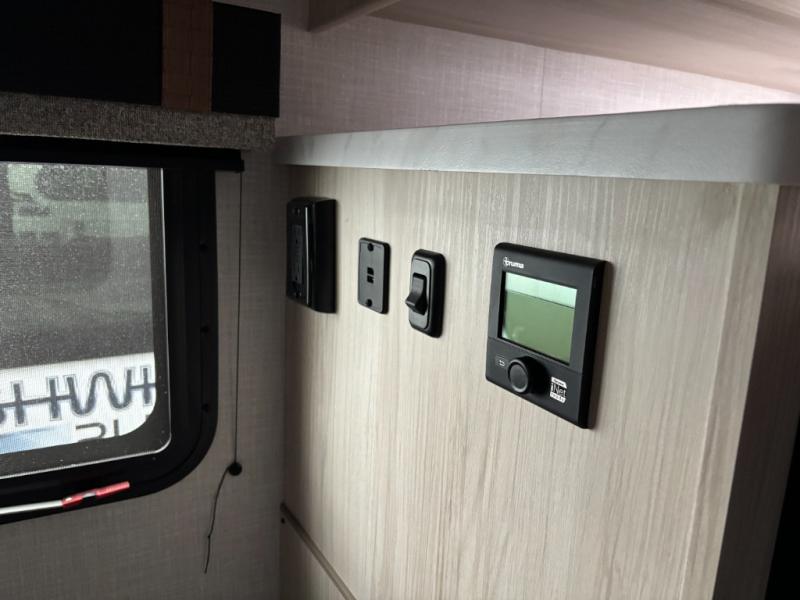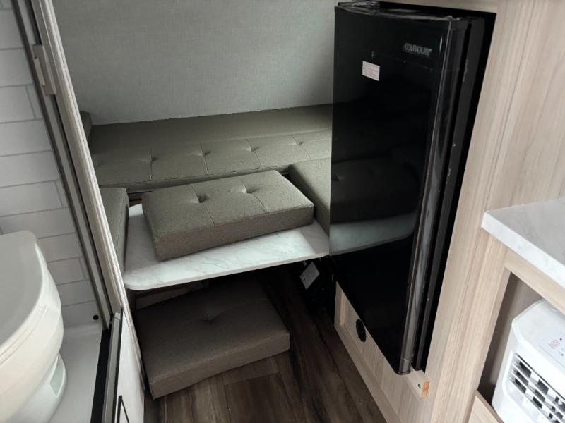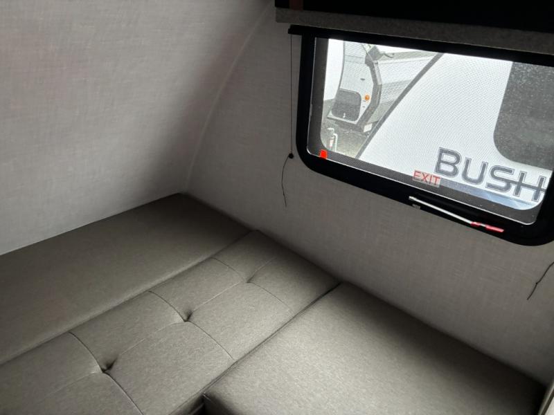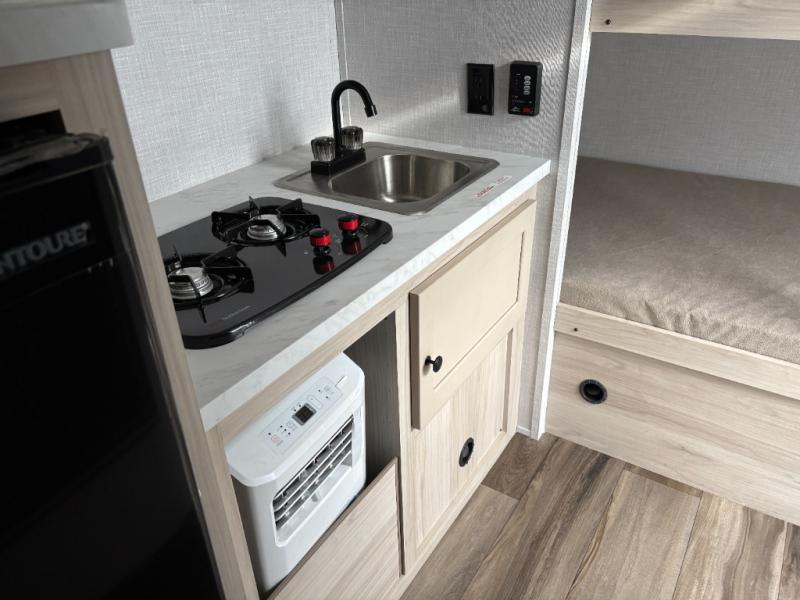If you're looking for a little more space and comfort, this trailer may just be the one for you! There is a U-shaped dinette in the back that will double as dining and sleeping space for guests. You can freshen up in the wet bath, then start breakfast on the two burner cooktop. There is also a microwave oven for instant oatmeal and a 12V refrigerator where milk can be stored. This model also includes a front bed where you can rest up before a new day of exploring!