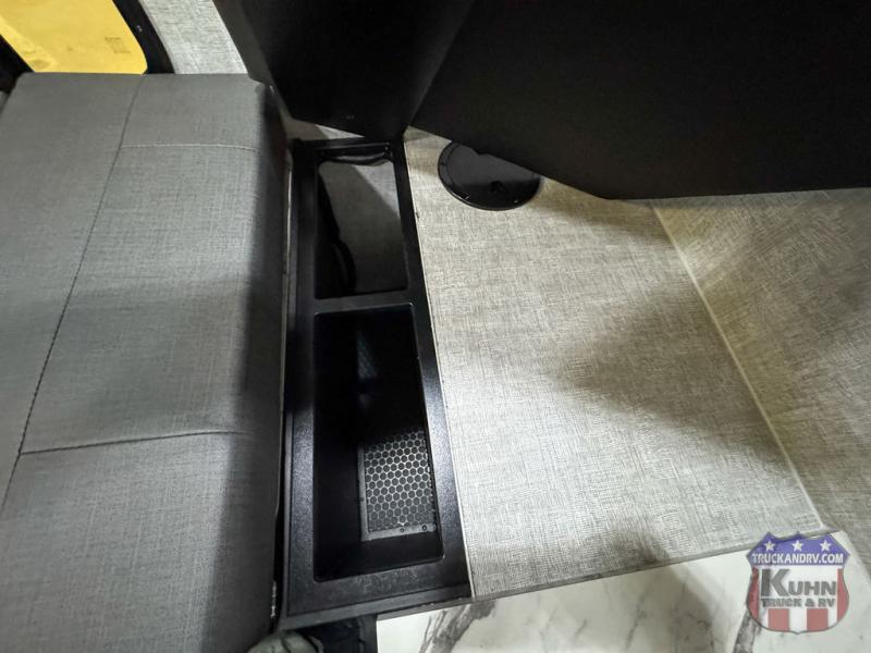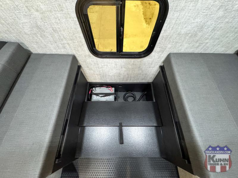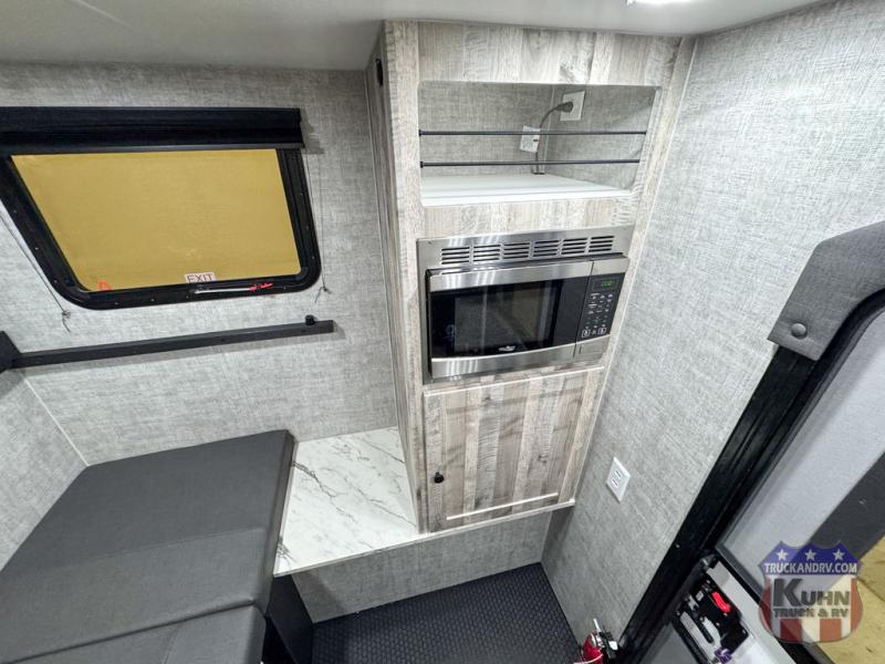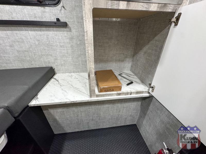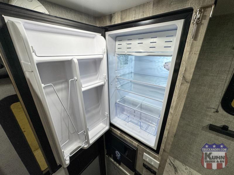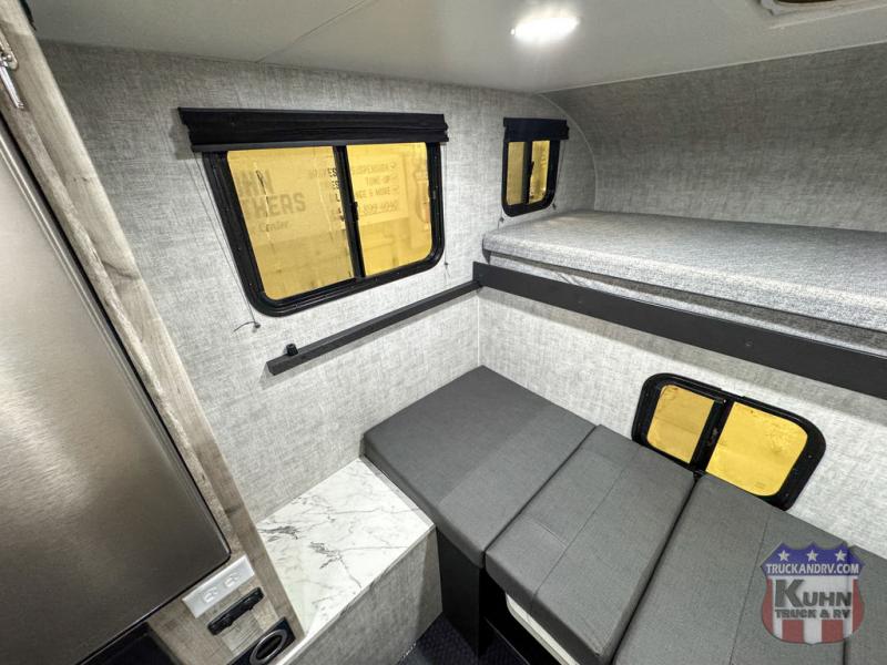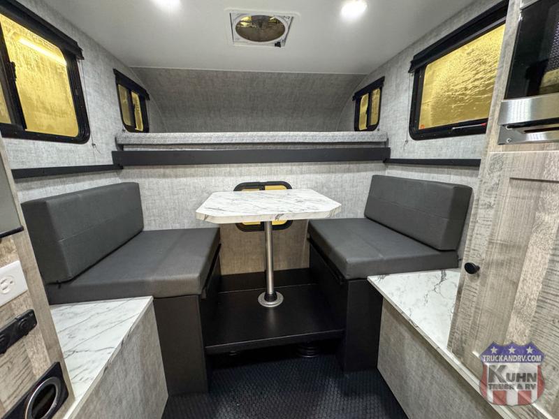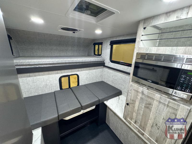 Head to your favorite destinations in this truck camper! The cab over bed will have you feeling recharged and ready to go each morning, plus the 30" wide dinette can also convert into an extra sleeping space. And if you want an extra 80" in length, choose the optional North/South pull-out bed in place of the cab over bed! The countertop space on either side of the camper will make it easier to prepare your delicious meals and the optional microwave would come in handy on those days when you only have time to reheat leftovers. With the large wardrobe cabinet, there is space for hanging clothes and next to it is a portable toilet. If you want extra perks then you can add options like a Truma furnace, a roof air conditioner, and a solar panel roof system to go off the grid!