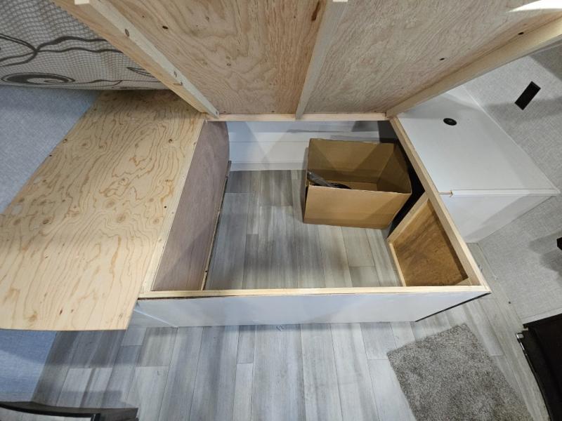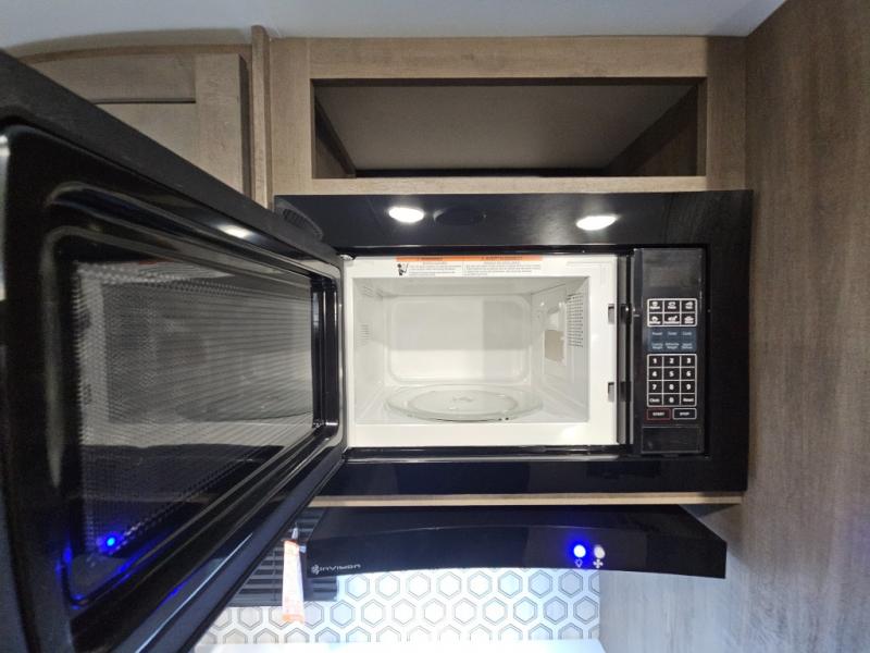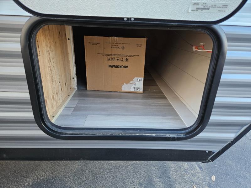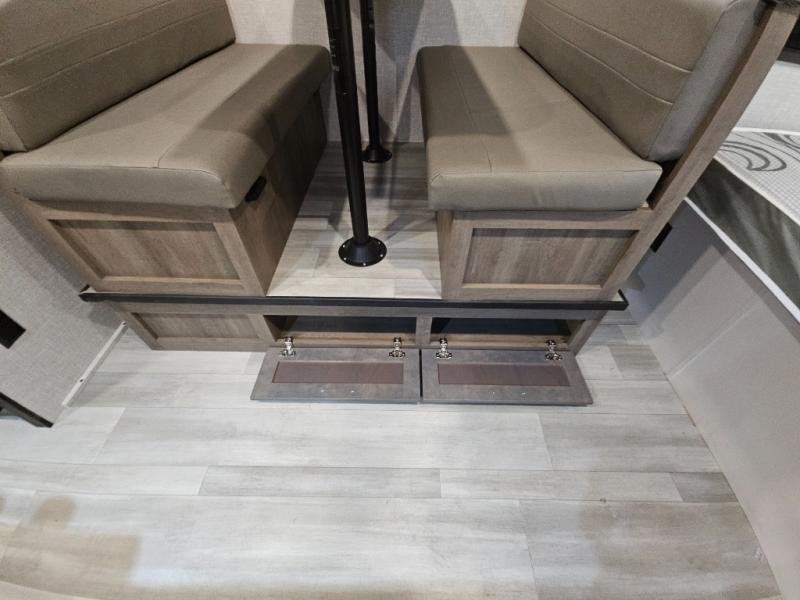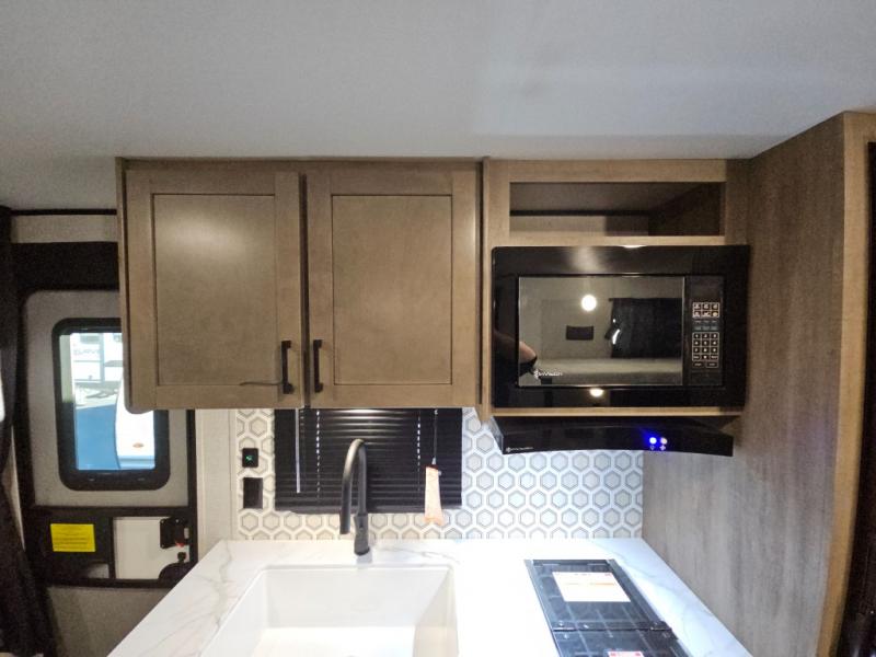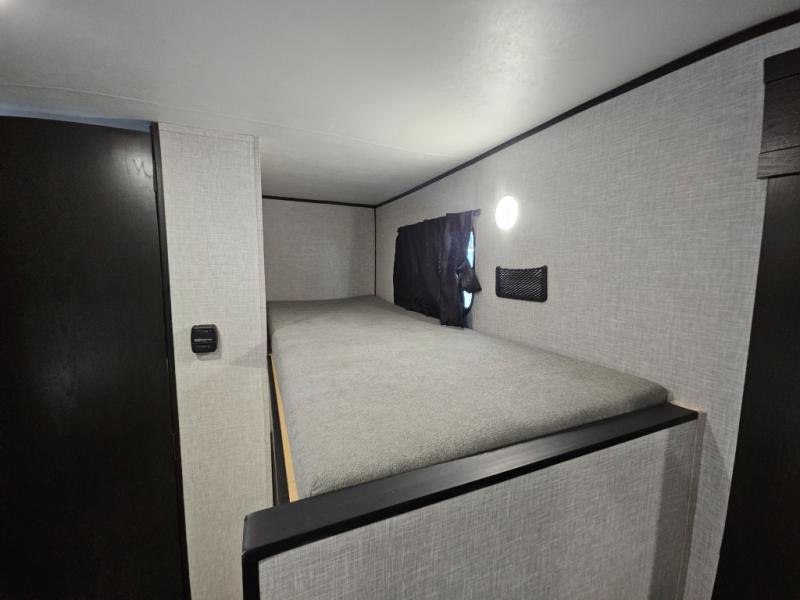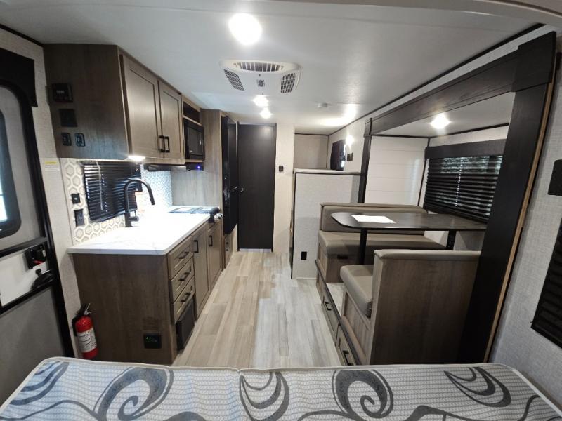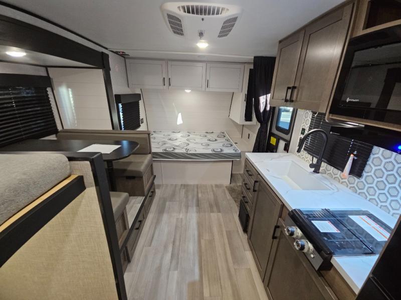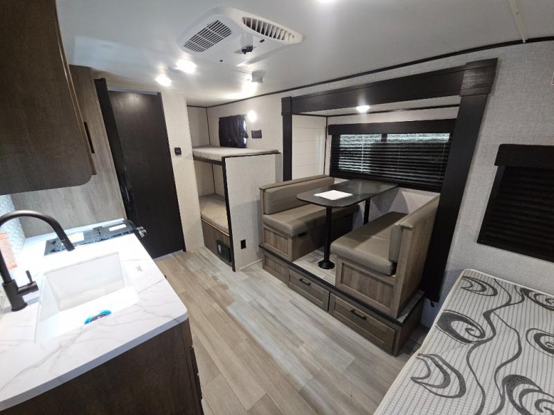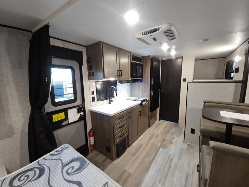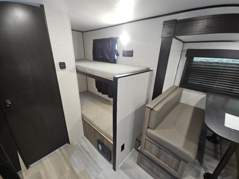 Bunk beds in this single axle travel trailer make each camping trip fun, plus there is a booth dinette slide that provides more space to stretch out and relax. The front bed includes a wardrobe at the end of it to store your clothes, and there is an overhead cabinet here for special belongings. In the morning you can make breakfast on the two burner cooktop, or use the microwave oven if you're on the go. This model also includes outside storage that will be perfect for the tackle boxes or hiking gear!