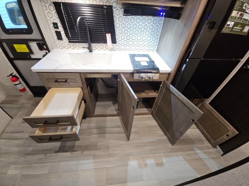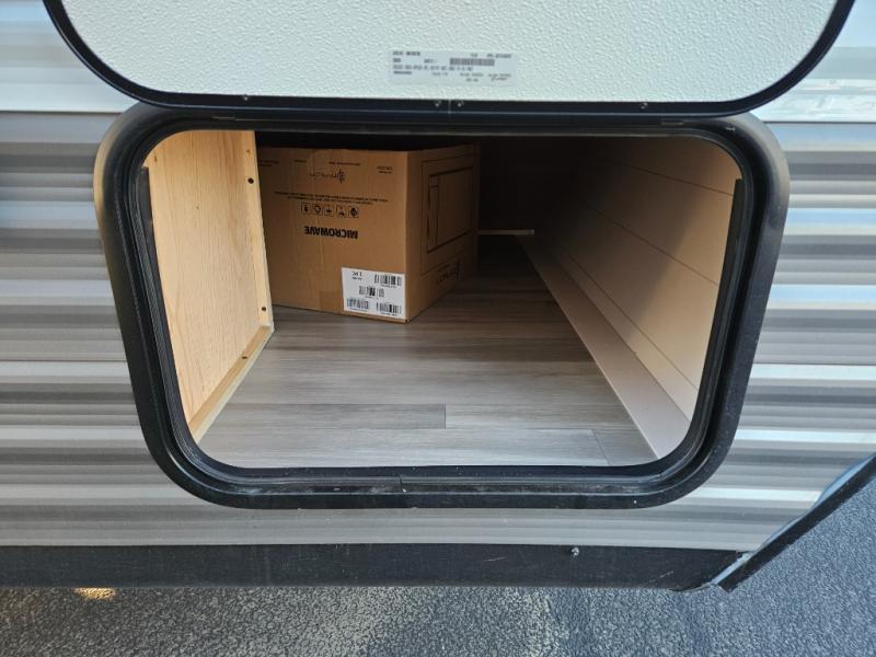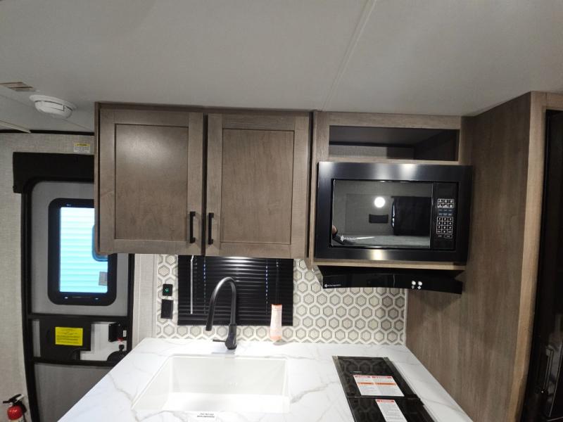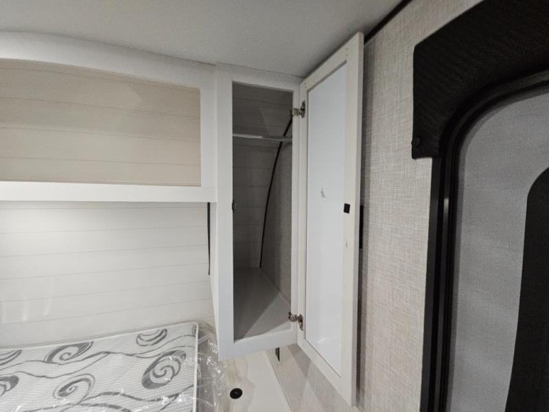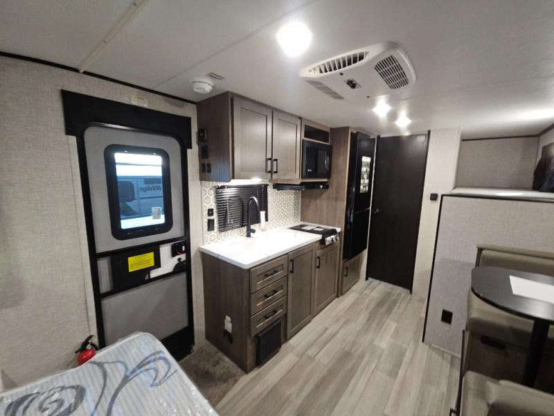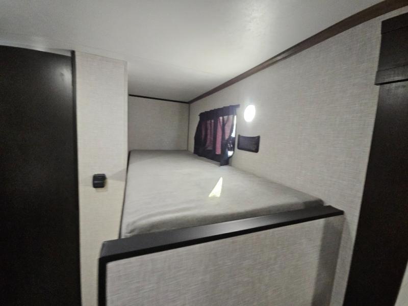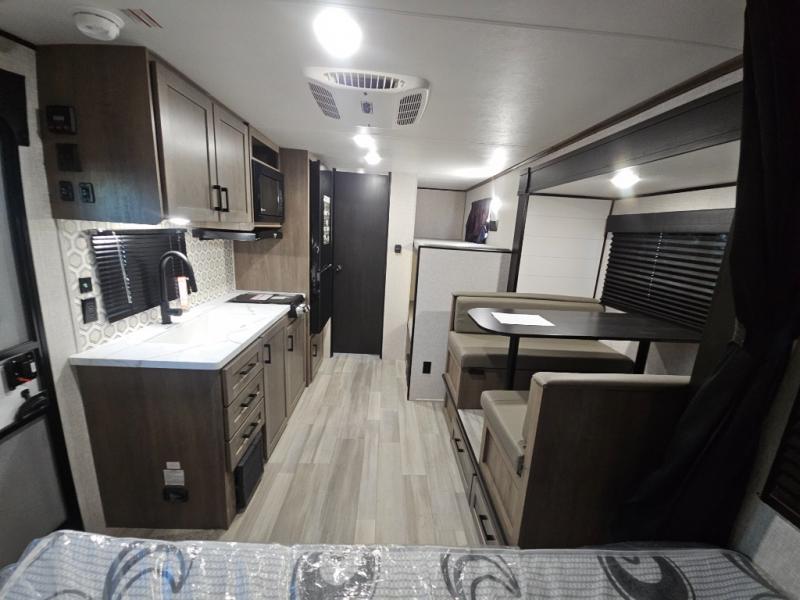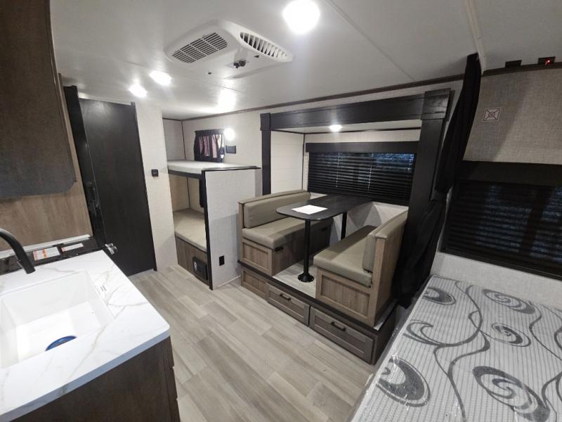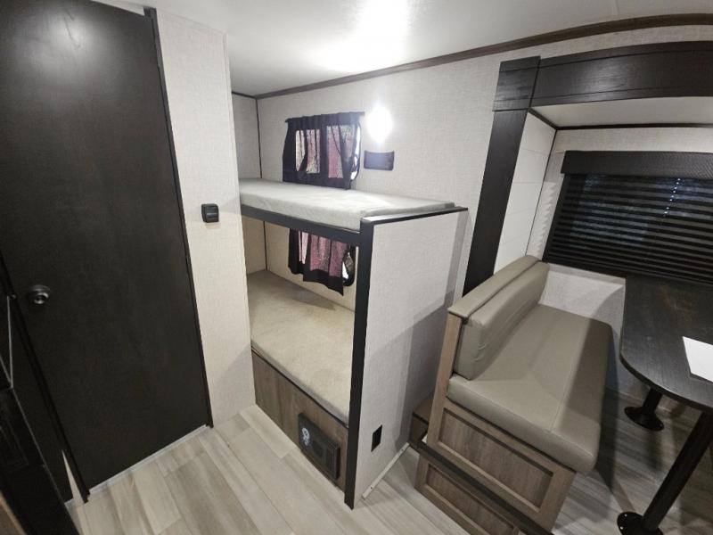 Bunk beds in this single axle travel trailer make each camping trip fun, plus there is a booth dinette slide that provides more space to stretch out and relax. The front bed includes a wardrobe at the end of it to store your clothes, and there is an overhead cabinet here for special belongings. In the morning you can make breakfast on the two burner cooktop, or use the microwave oven if you're on the go. This model also includes outside storage that will be perfect for the tackle boxes or hiking gear!