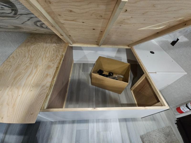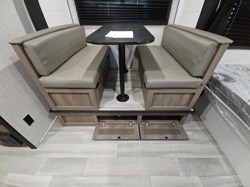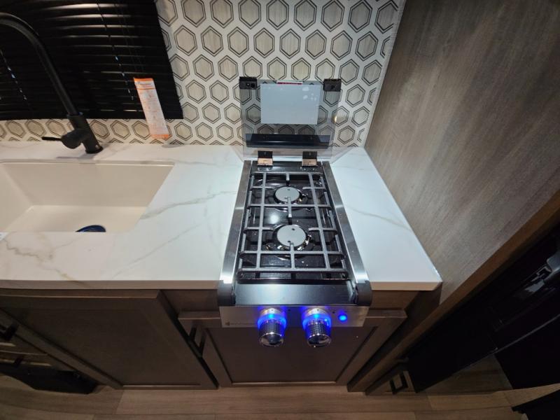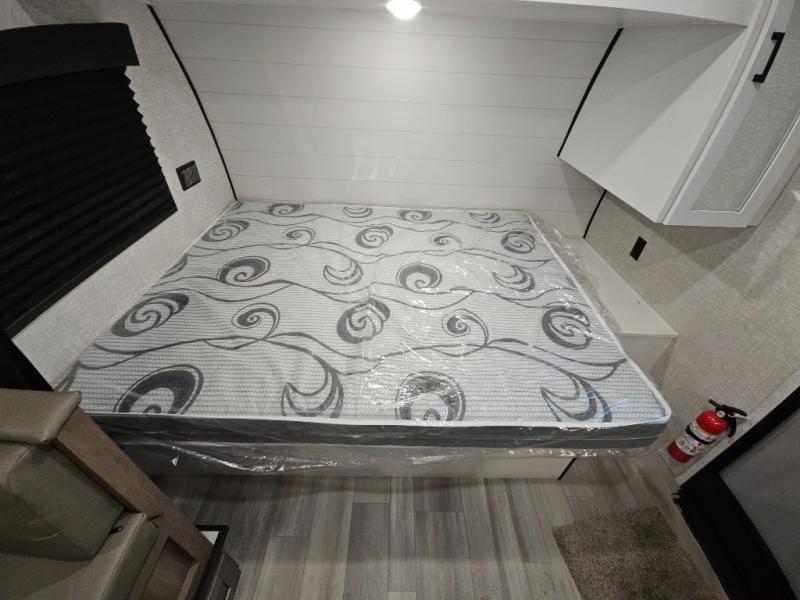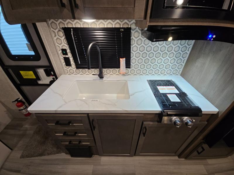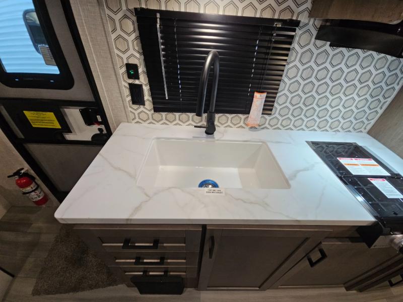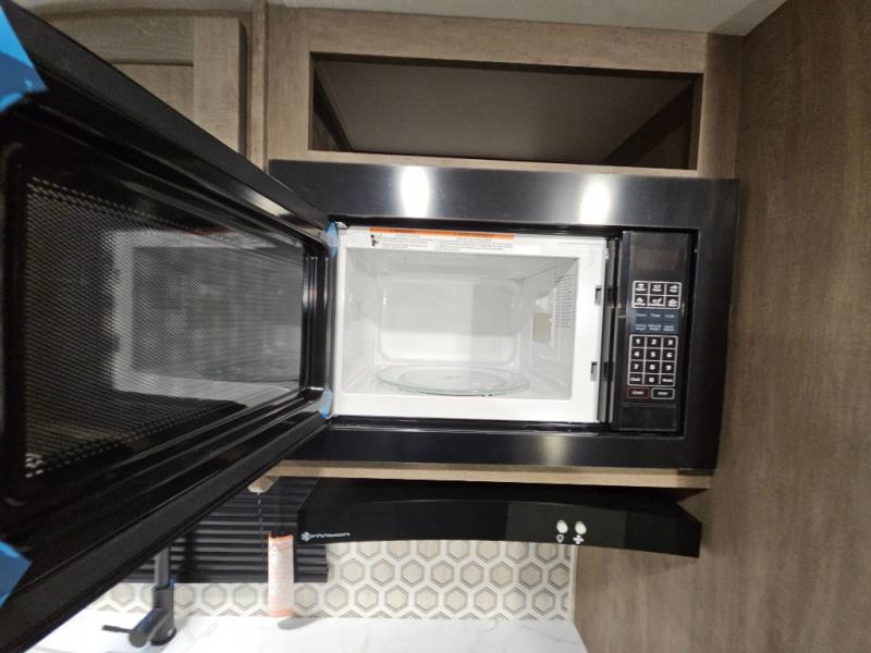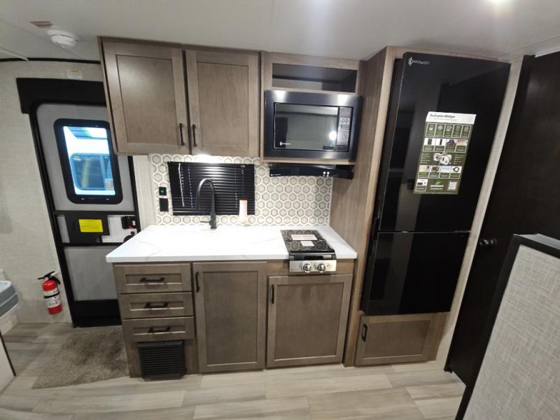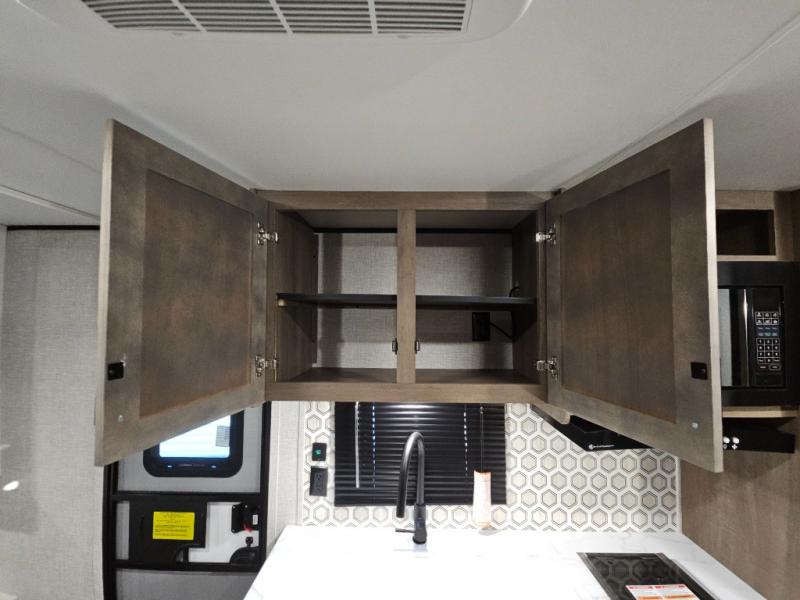 Bunk beds in this single axle travel trailer make each camping trip fun, plus there is a booth dinette slide that provides more space to stretch out and relax. The front bed includes a wardrobe at the end of it to store your clothes, and there is an overhead cabinet here for special belongings. In the morning you can make breakfast on the two burner cooktop, or use the microwave oven if you're on the go. This model also includes outside storage that will be perfect for the tackle boxes or hiking gear!