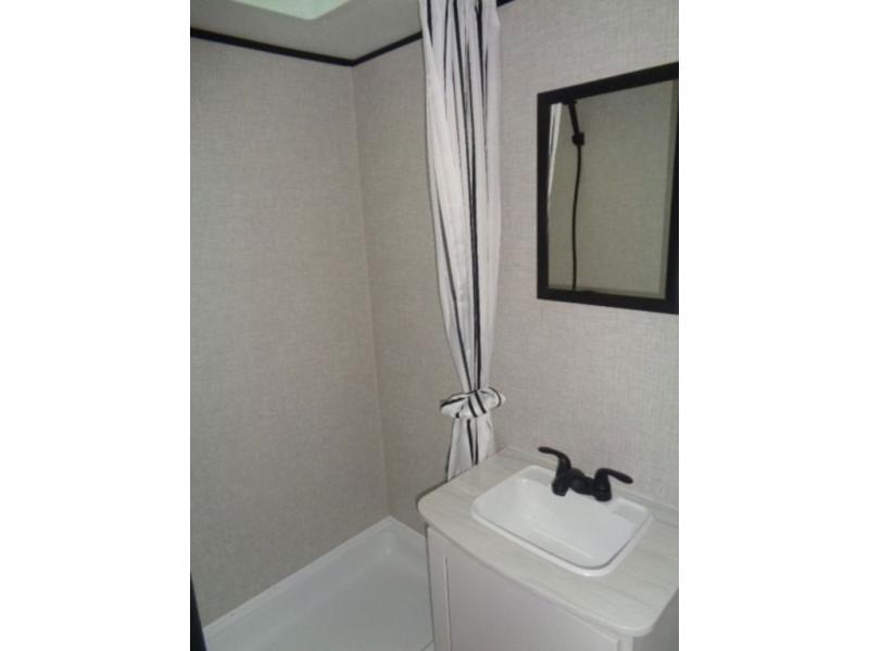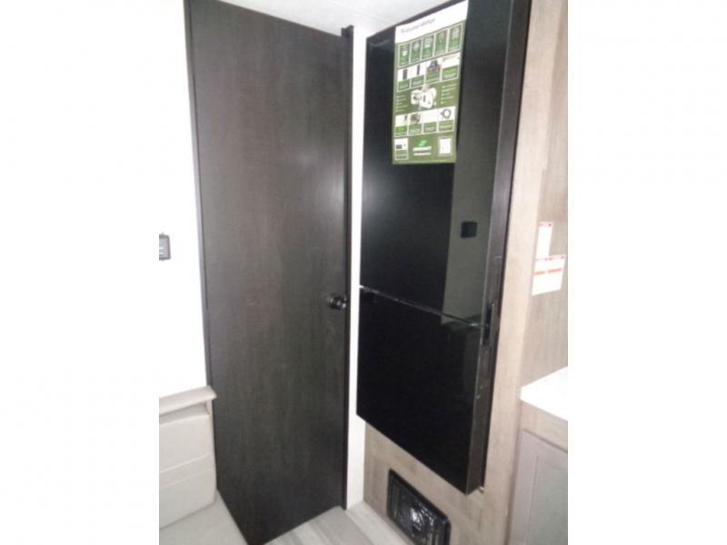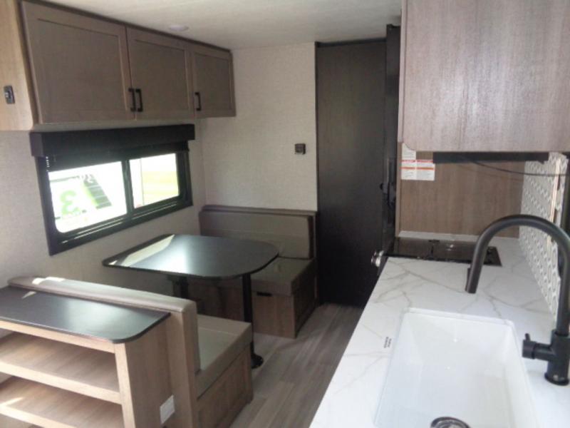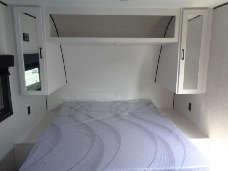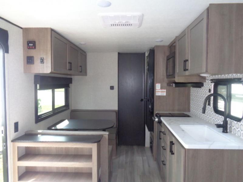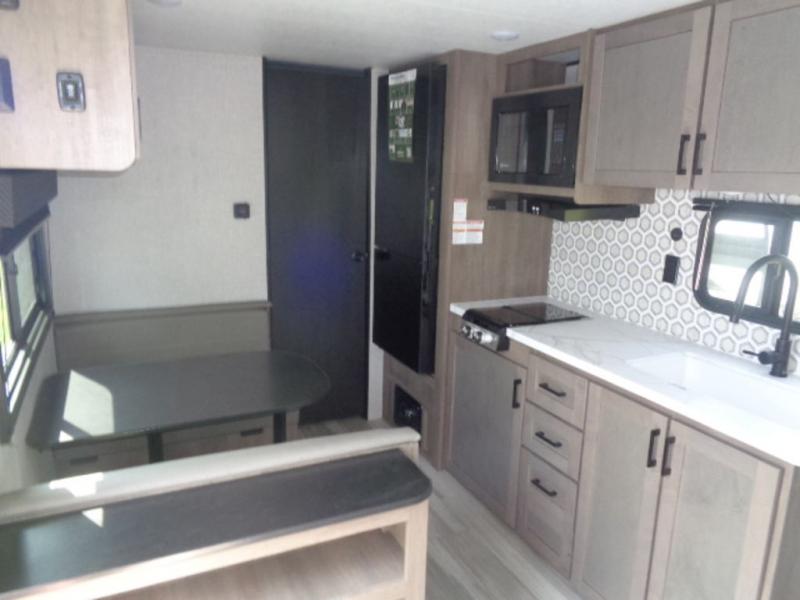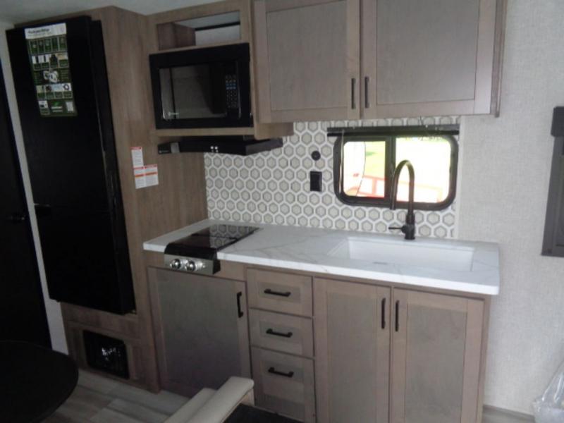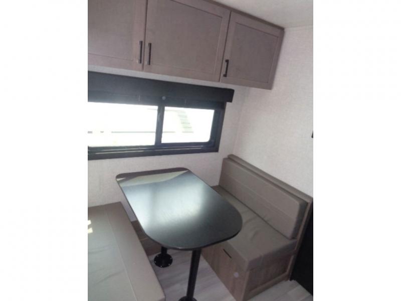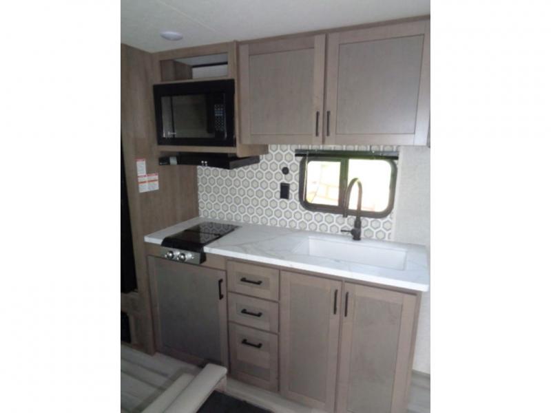 This cozy single axle travel trailer can sleep three people comfortably thanks to the front walk-around bed and the booth dinette. There is a full rear bath with a foot flush toilet, a powered bath vent, plus a bath wardrobe for clean towels and toiletries. The full kitchen is complete with a two burner cooktop, a microwave oven, and a refrigerator to keep your perishables fresh. Start camping today at your favorite campground!
