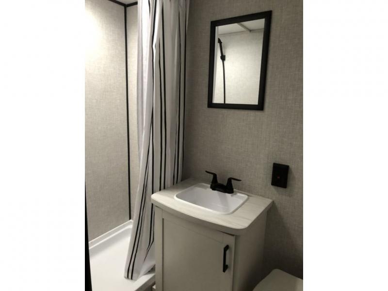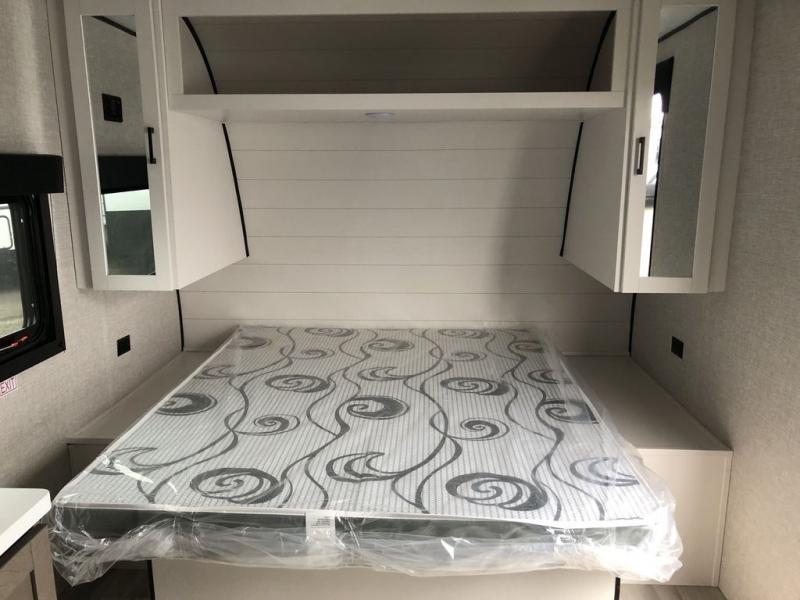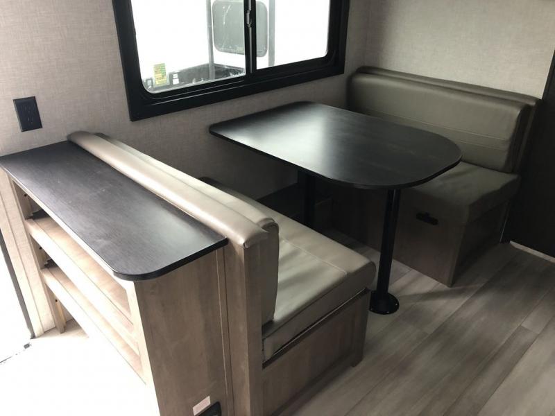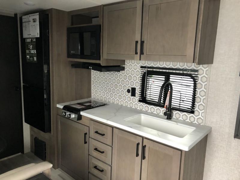 This cozy single axle travel trailer can sleep three people comfortably thanks to the front walk-around bed and the booth dinette. There is a full rear bath with a foot flush toilet, a powered bath vent, plus a bath wardrobe for clean towels and toiletries. The full kitchen is complete with a two burner cooktop, a microwave oven, and a refrigerator to keep your perishables fresh. Start camping today at your favorite campground!