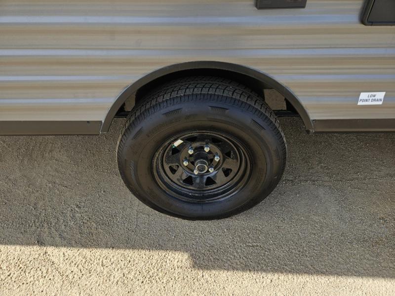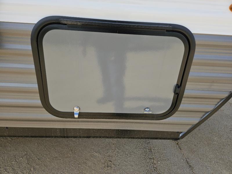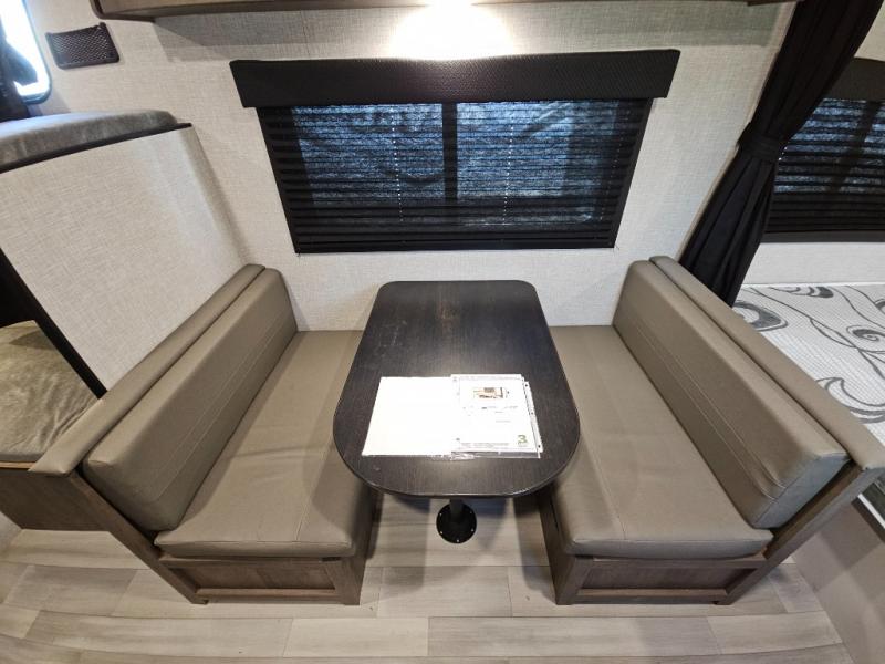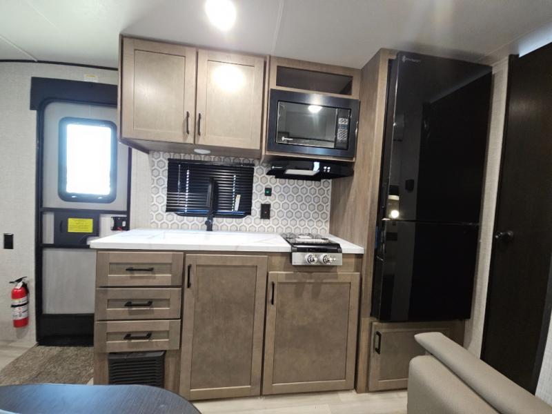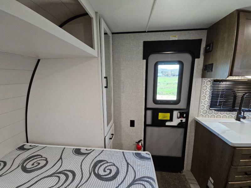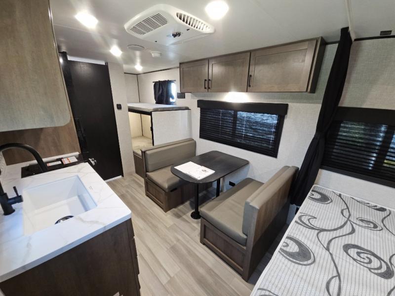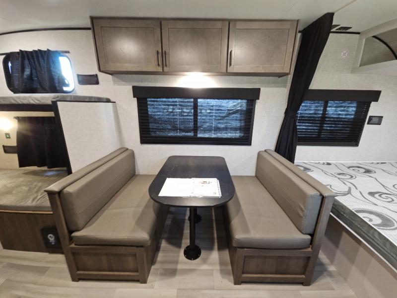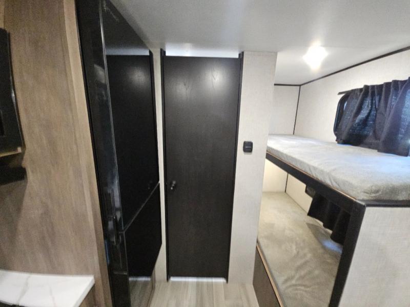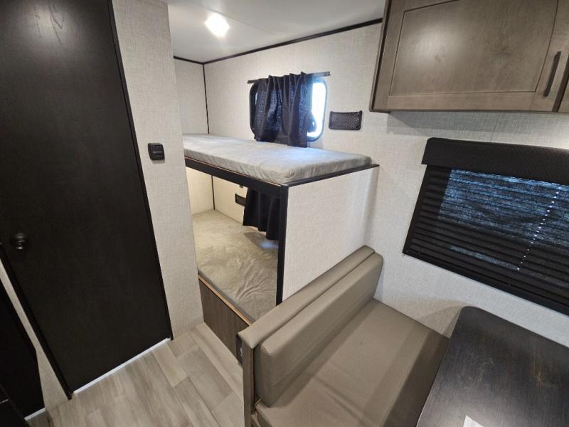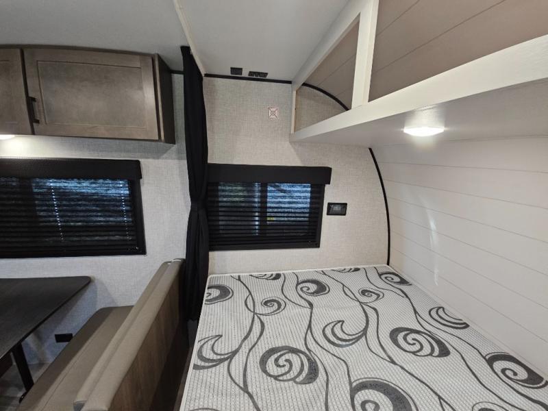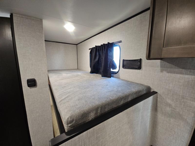 If you're in the market for a lightweight single axle travel trailer with bunk beds, you're in luck with this unit! You will have the front bed all to yourselves, and there is a wardrobe here to store your clothes. The chef can whip up lunch on the two burner cooktop, and you can dine at the booth dinette. If the weather is nice, you may just want to sit outdoors under the 13' power awning with LED lights. The rear corner bath includes a foot flush toilet and a tub/shower, and you'll find plenty of storage space throughout this model, including outside storage for charcoal, tackle boxes, and tools!
