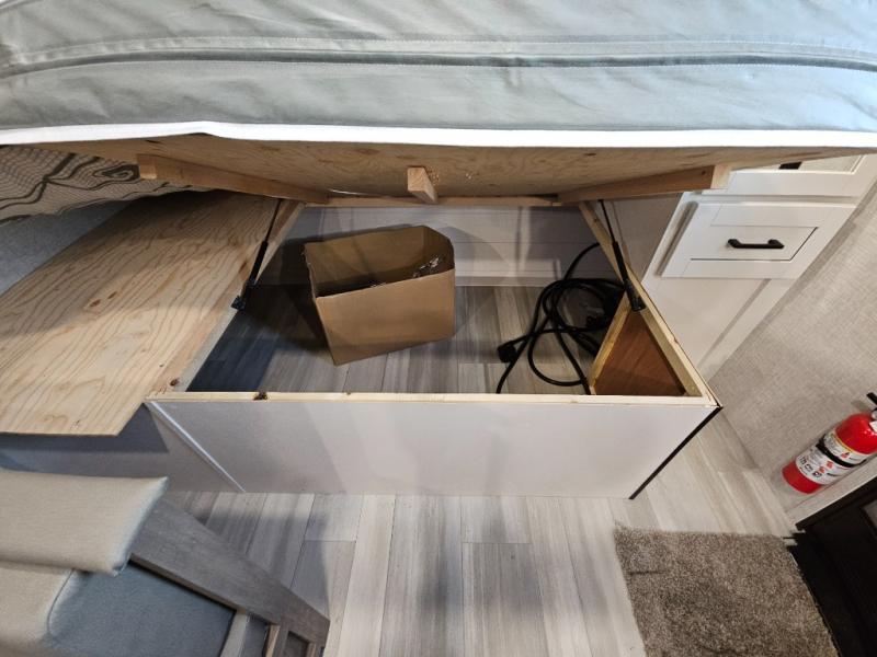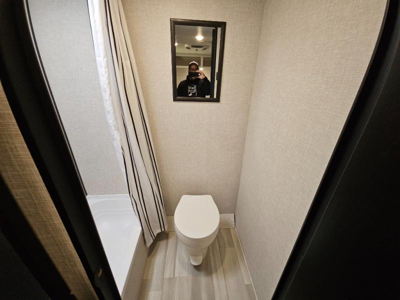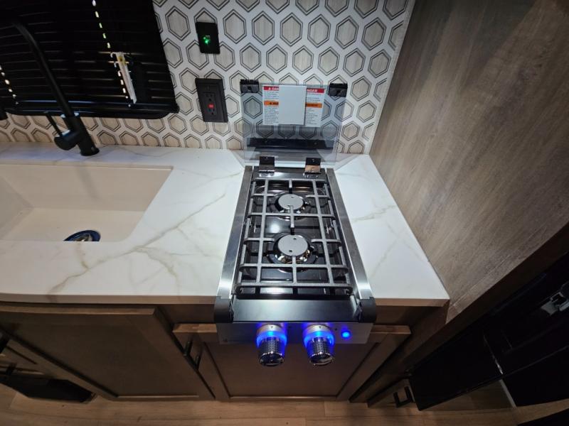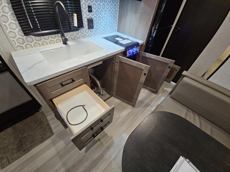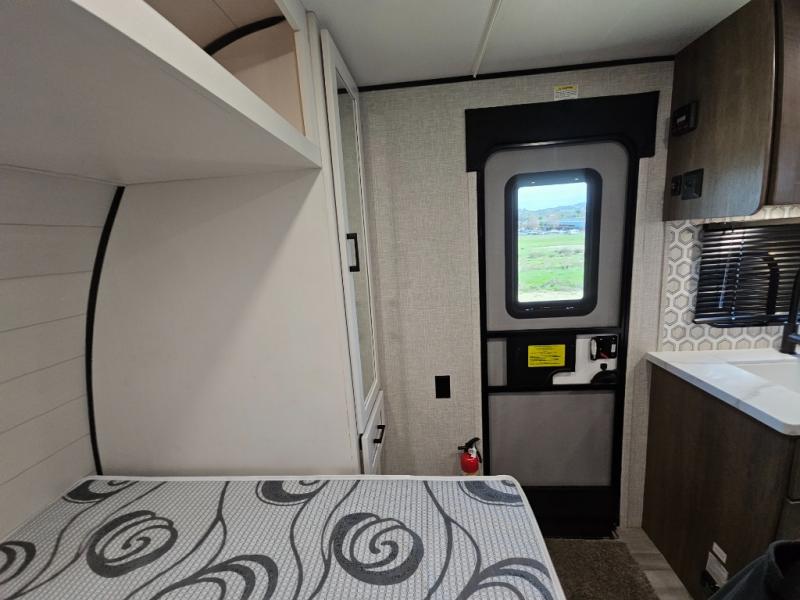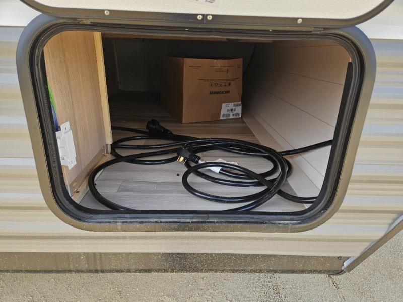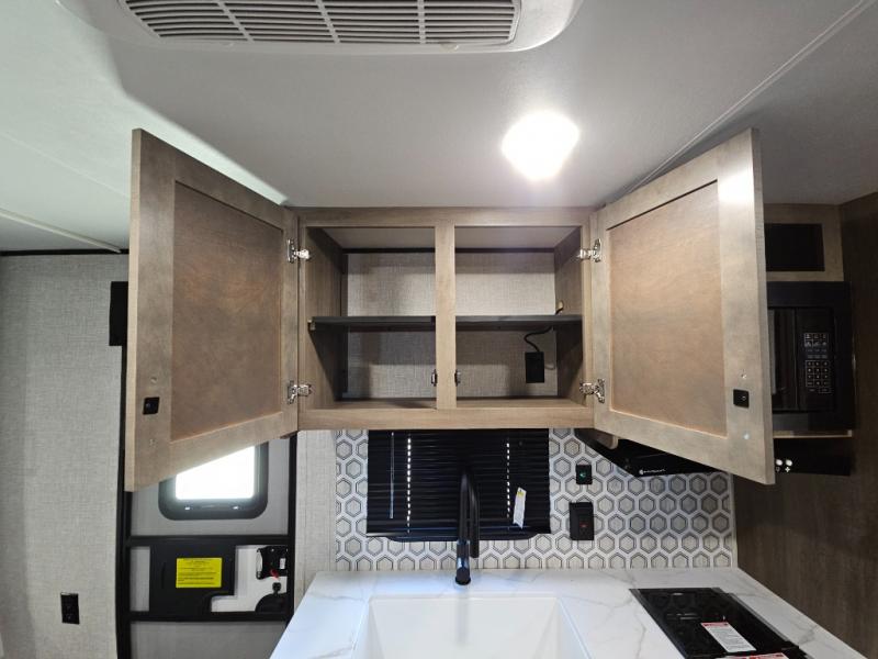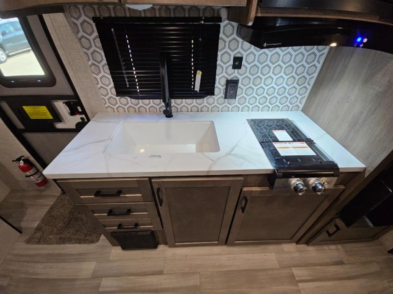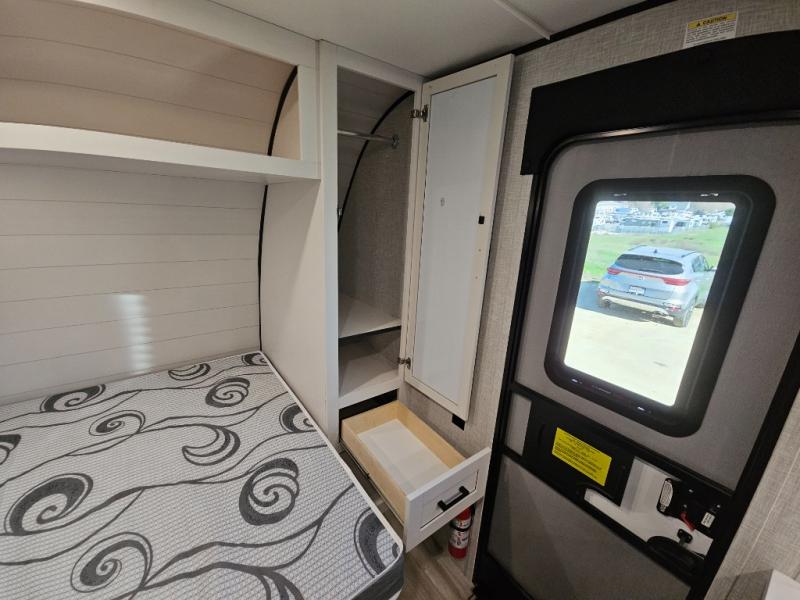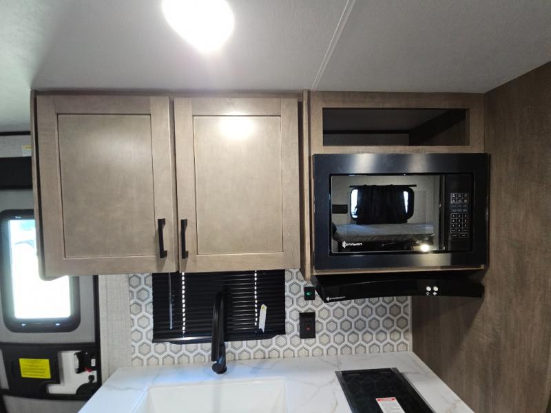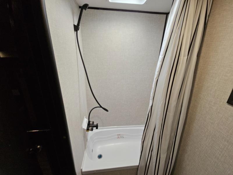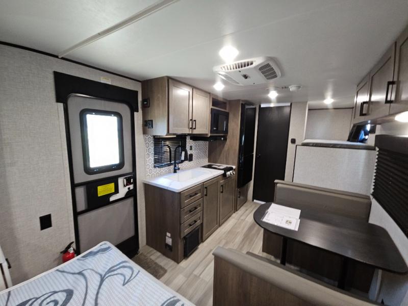 If you're in the market for a lightweight single axle travel trailer with bunk beds, you're in luck with this unit! You will have the front bed all to yourselves, and there is a wardrobe here to store your clothes. The chef can whip up lunch on the two burner cooktop, and you can dine at the booth dinette. If the weather is nice, you may just want to sit outdoors under the 13' power awning with LED lights. The rear corner bath includes a foot flush toilet and a tub/shower, and you'll find plenty of storage space throughout this model, including outside storage for charcoal, tackle boxes, and tools!