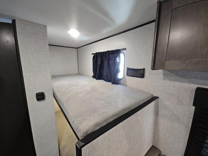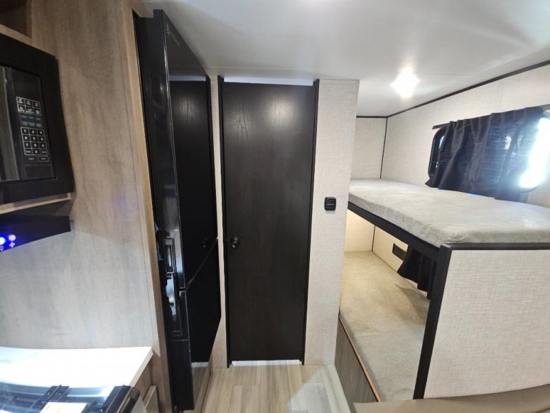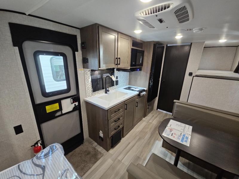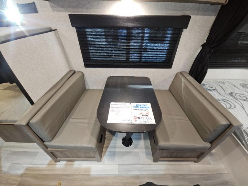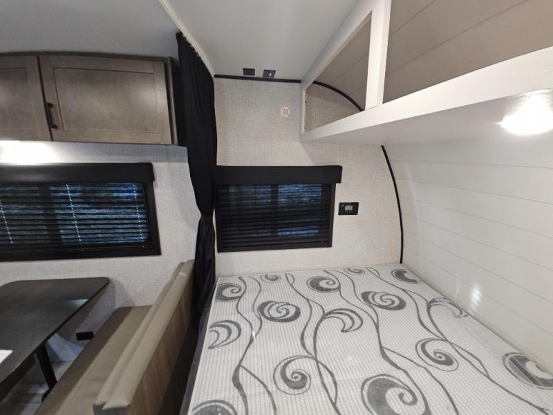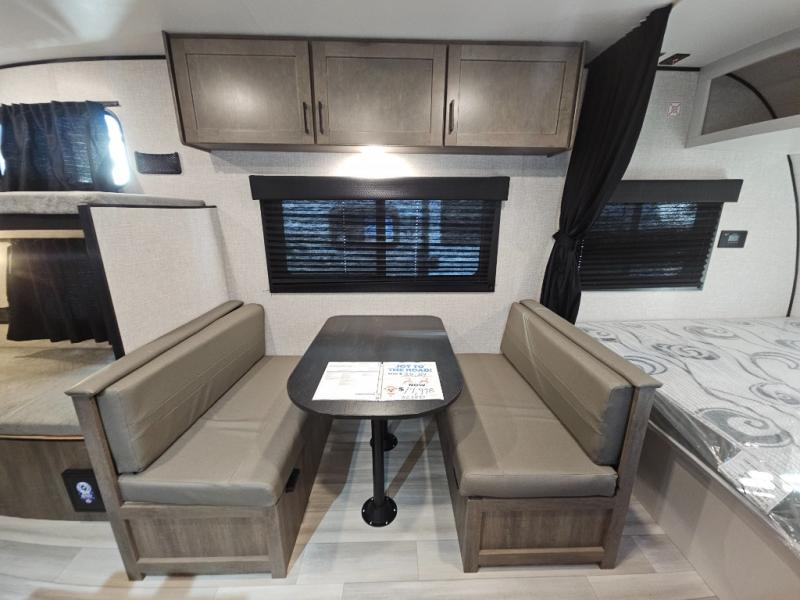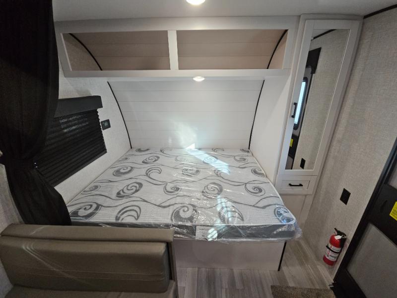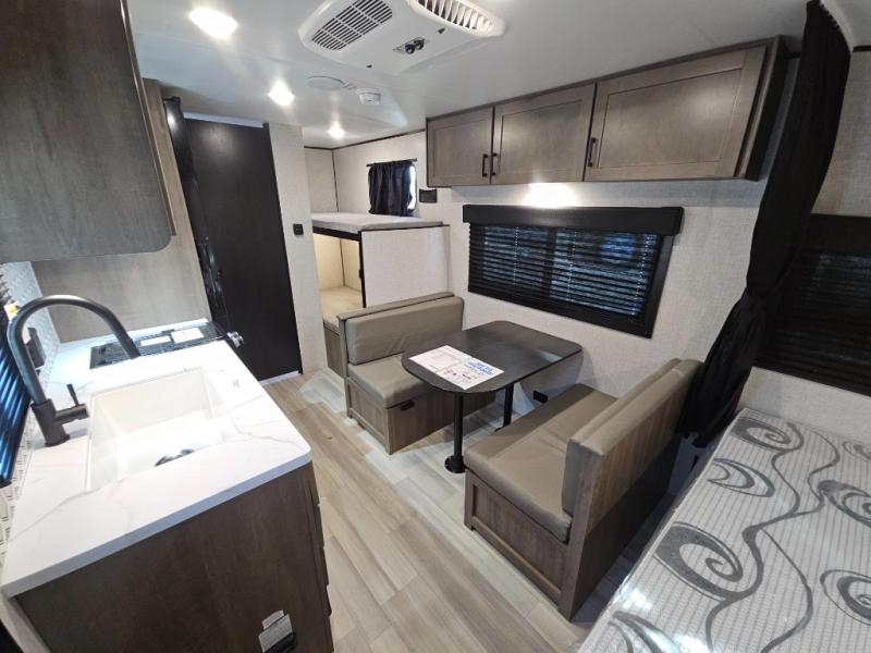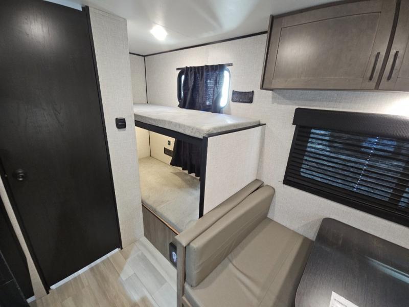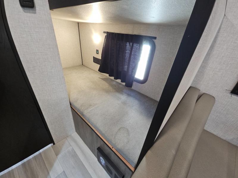 If you're in the market for a lightweight single axle travel trailer with bunk beds, you're in luck with this unit! You will have the front bed all to yourselves, and there is a wardrobe here to store your clothes. The chef can whip up lunch on the two burner cooktop, and you can dine at the booth dinette. If the weather is nice, you may just want to sit outdoors under the 13' power awning with LED lights. The rear corner bath includes a foot flush toilet and a tub/shower, and you'll find plenty of storage space throughout this model, including outside storage for charcoal, tackle boxes, and tools!