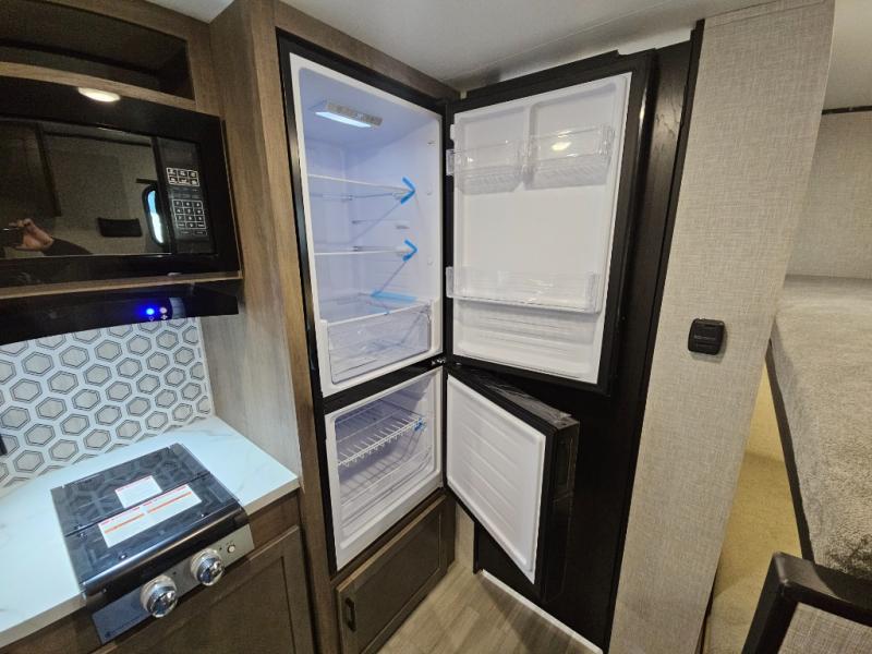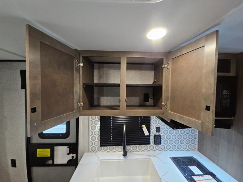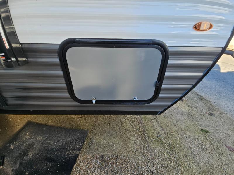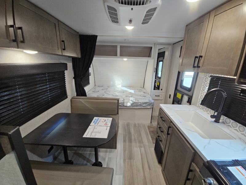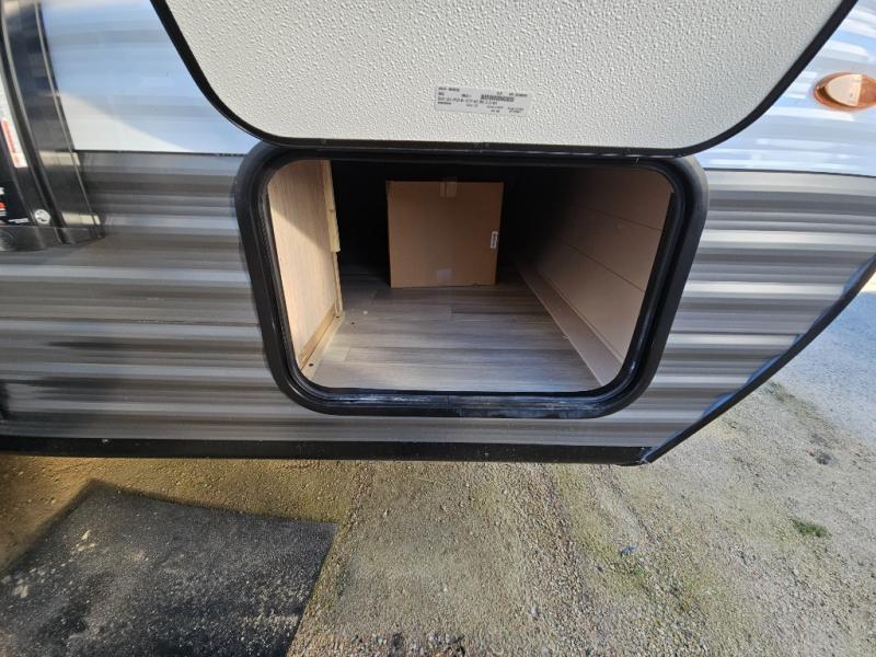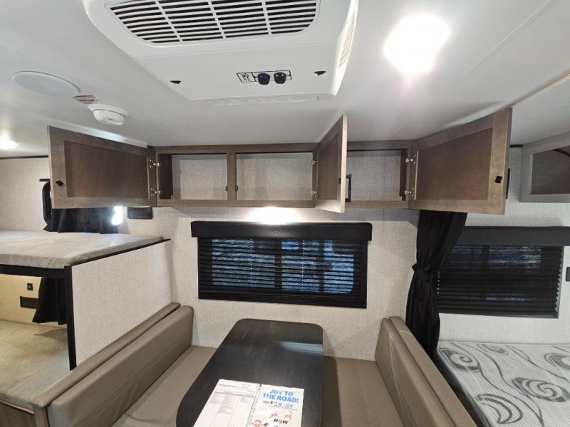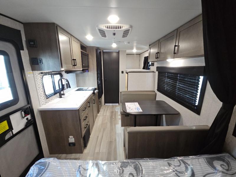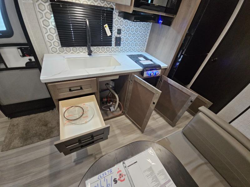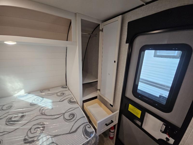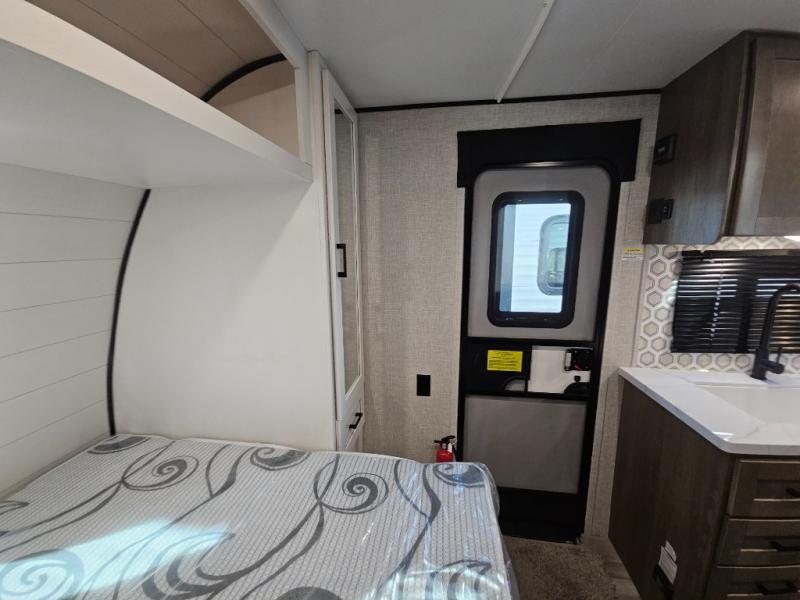 If you're in the market for a lightweight single axle travel trailer with bunk beds, you're in luck with this unit! You will have the front bed all to yourselves, and there is a wardrobe here to store your clothes. The chef can whip up lunch on the two burner cooktop, and you can dine at the booth dinette. If the weather is nice, you may just want to sit outdoors under the 13' power awning with LED lights. The rear corner bath includes a foot flush toilet and a tub/shower, and you'll find plenty of storage space throughout this model, including outside storage for charcoal, tackle boxes, and tools!