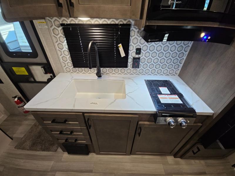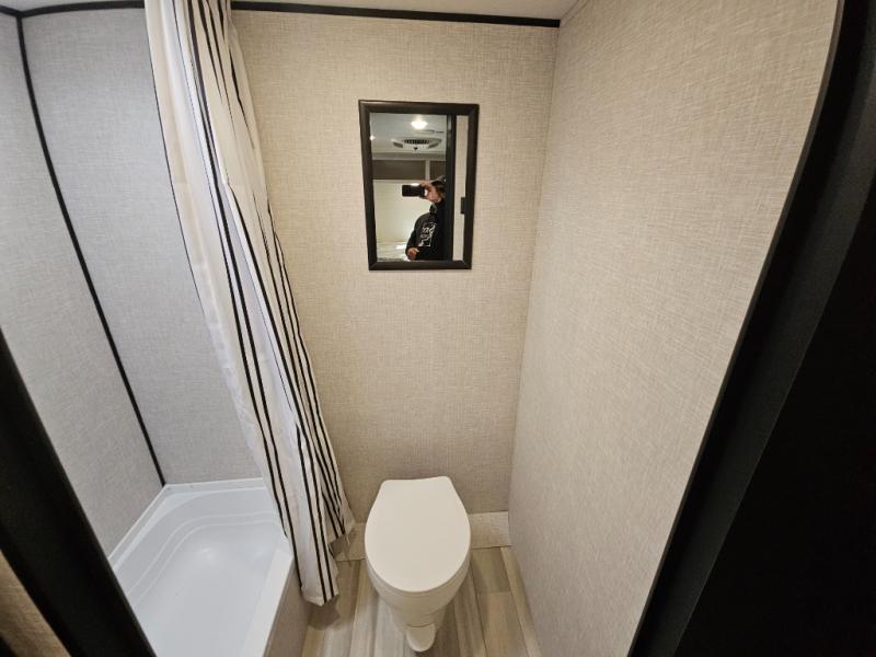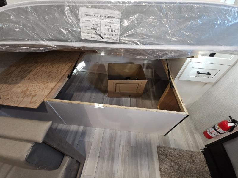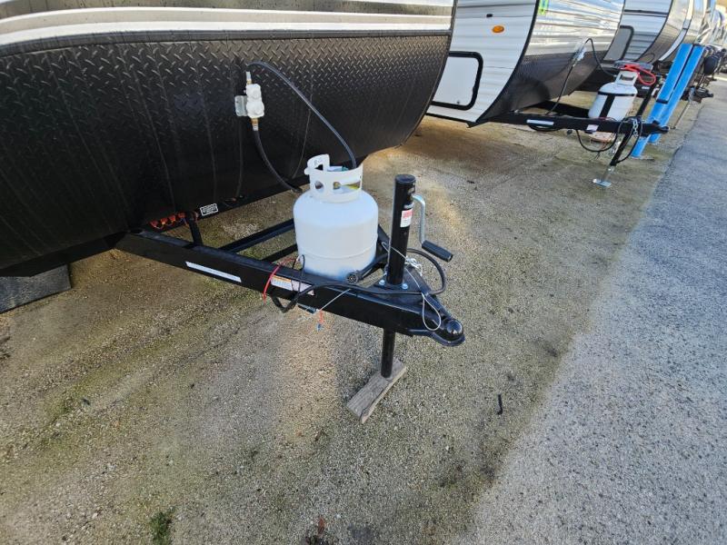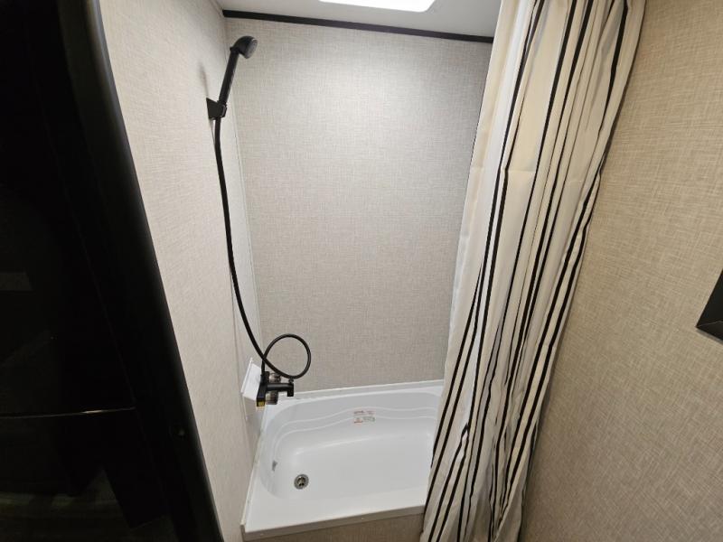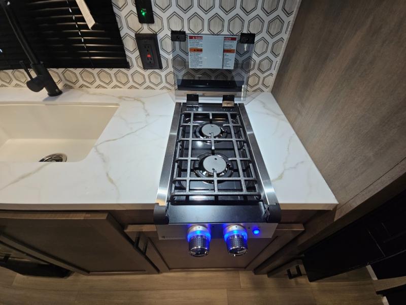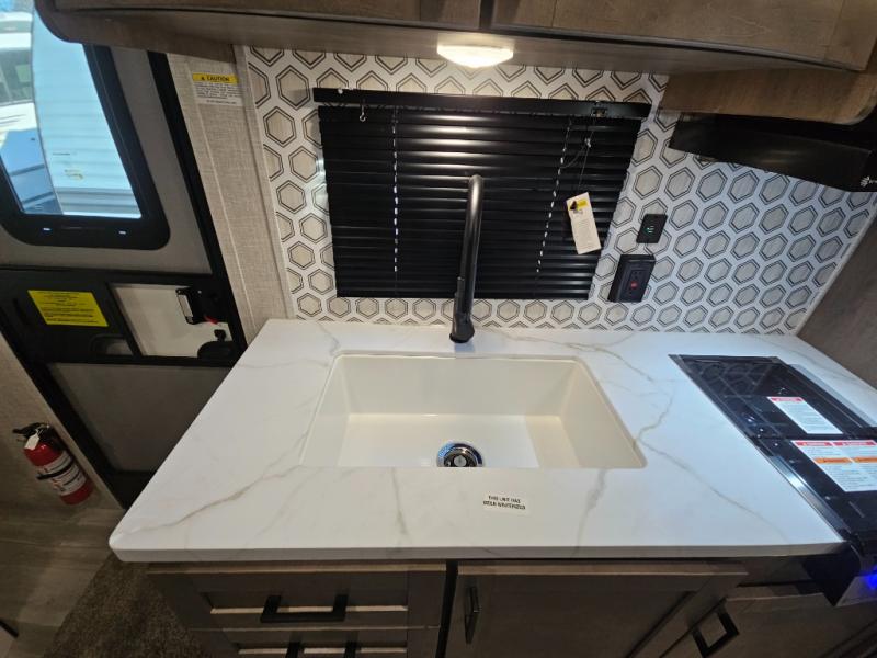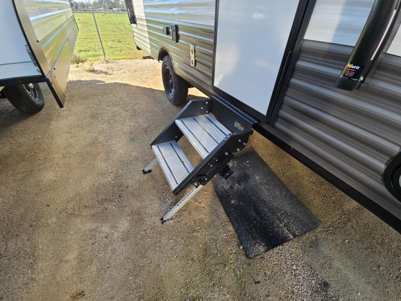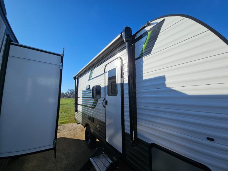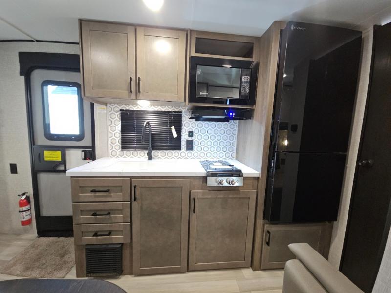 If you're in the market for a lightweight single axle travel trailer with bunk beds, you're in luck with this unit! You will have the front bed all to yourselves, and there is a wardrobe here to store your clothes. The chef can whip up lunch on the two burner cooktop, and you can dine at the booth dinette. If the weather is nice, you may just want to sit outdoors under the 13' power awning with LED lights. The rear corner bath includes a foot flush toilet and a tub/shower, and you'll find plenty of storage space throughout this model, including outside storage for charcoal, tackle boxes, and tools!
