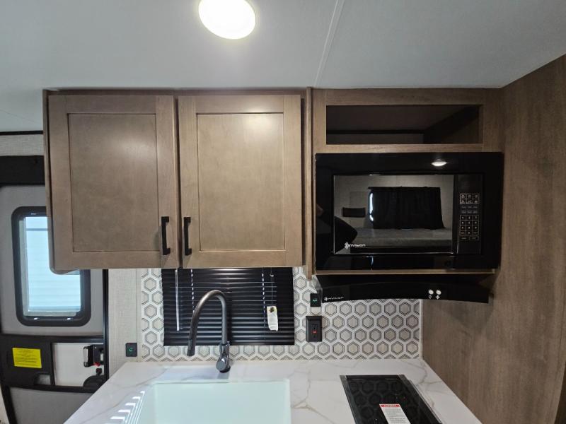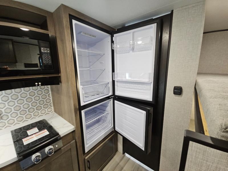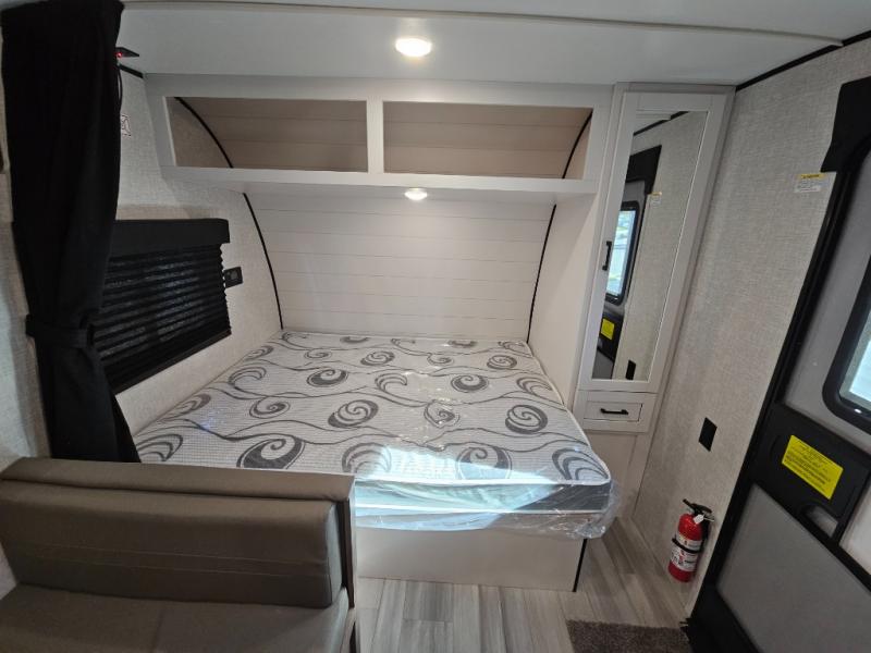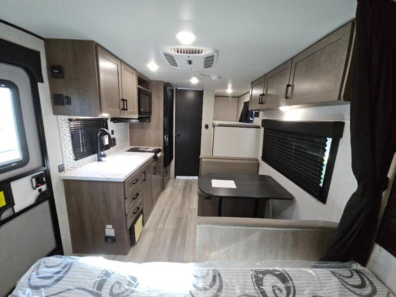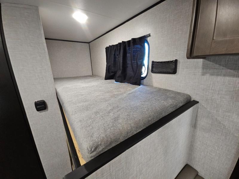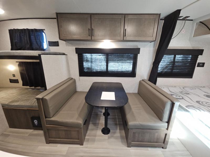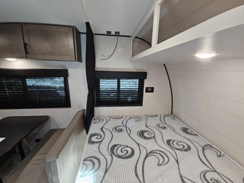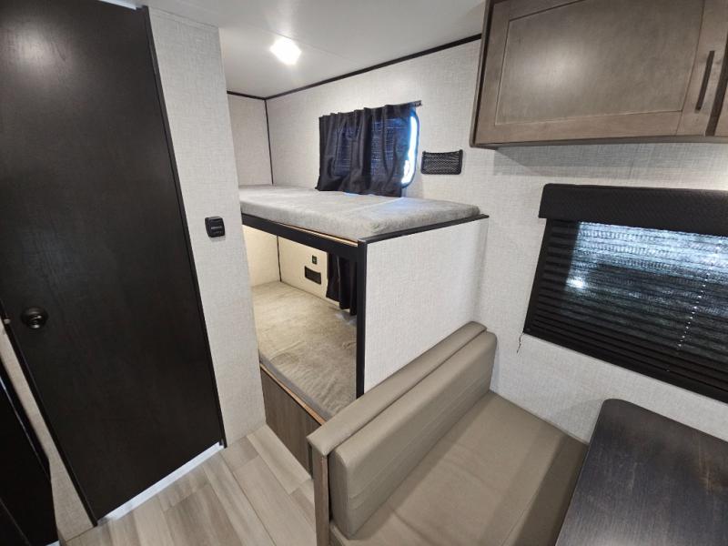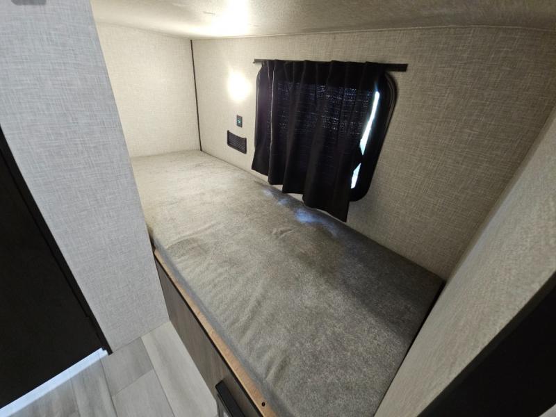If you're in the market for a lightweight single axle travel trailer with bunk beds, you're in luck with this unit! You will have the front bed all to yourselves, and there is a wardrobe here to store your clothes. The chef can whip up lunch on the two burner cooktop, and you can dine at the booth dinette. If the weather is nice, you may just want to sit outdoors under the 13' power awning with LED lights. The rear corner bath includes a foot flush toilet and a tub/shower, and you'll find plenty of storage space throughout this model, including outside storage for charcoal, tackle boxes, and tools!