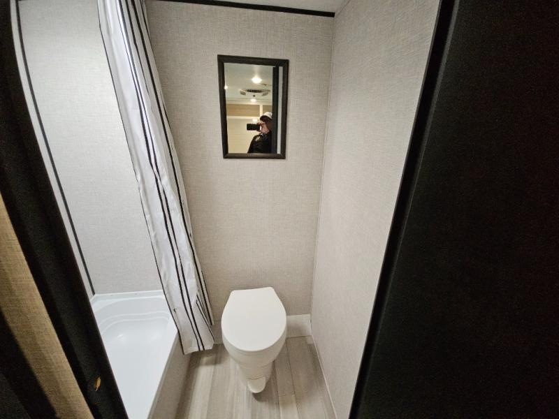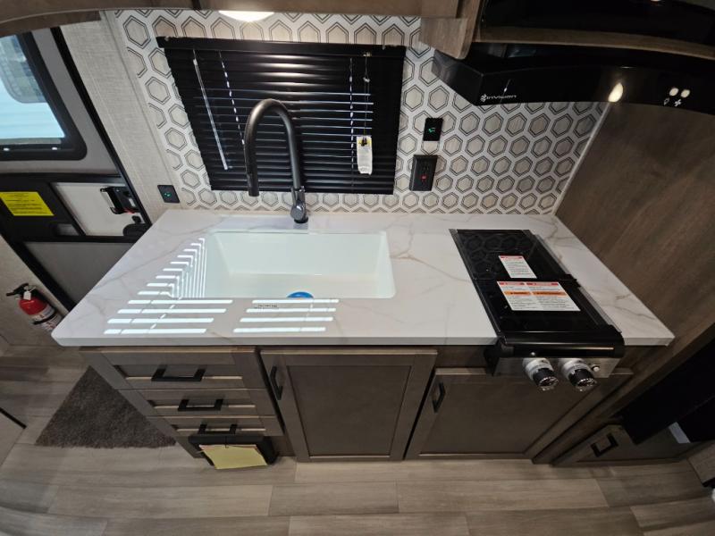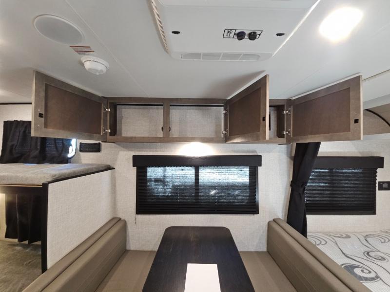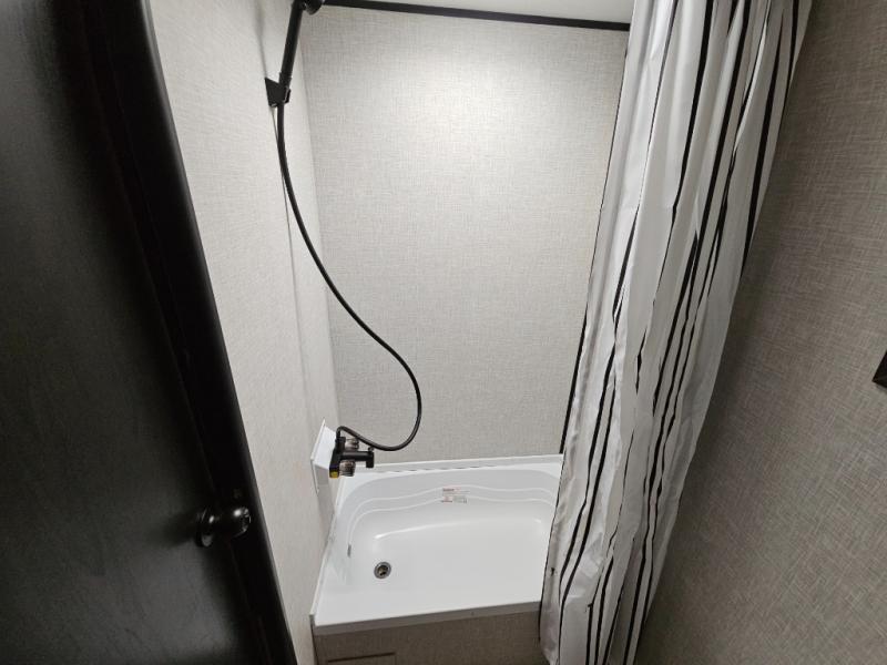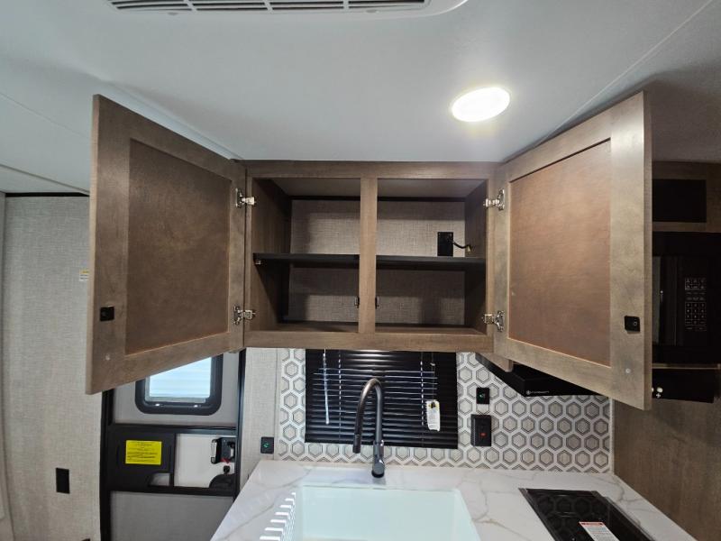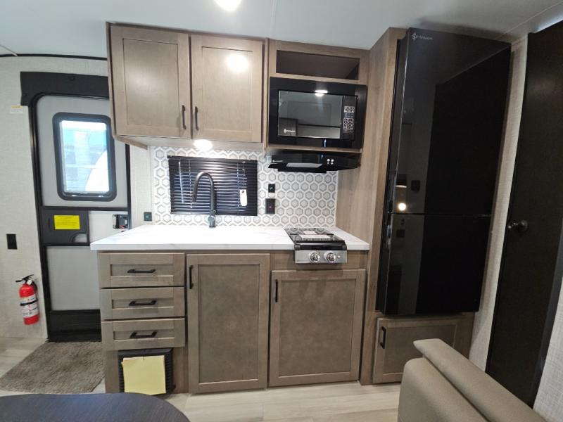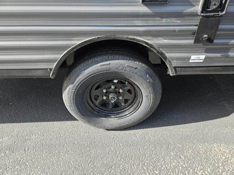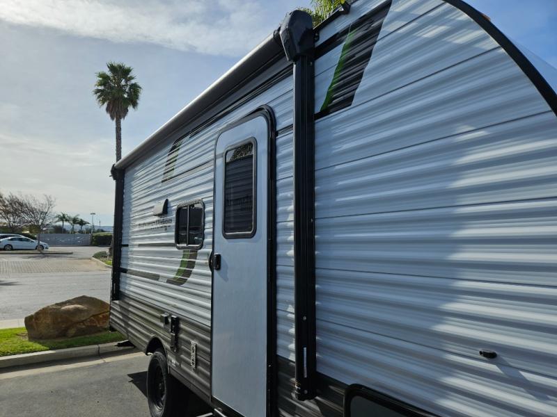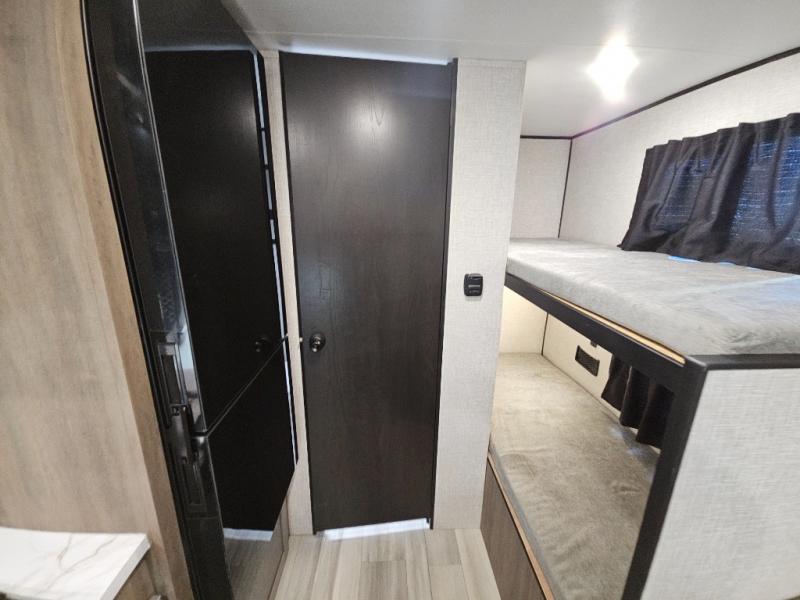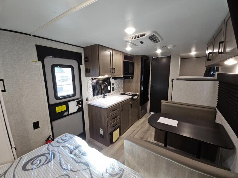 If you're in the market for a lightweight single axle travel trailer with bunk beds, you're in luck with this unit! You will have the front bed all to yourselves, and there is a wardrobe here to store your clothes. The chef can whip up lunch on the two burner cooktop, and you can dine at the booth dinette. If the weather is nice, you may just want to sit outdoors under the 13' power awning with LED lights. The rear corner bath includes a foot flush toilet and a tub/shower, and you'll find plenty of storage space throughout this model, including outside storage for charcoal, tackle boxes, and tools!