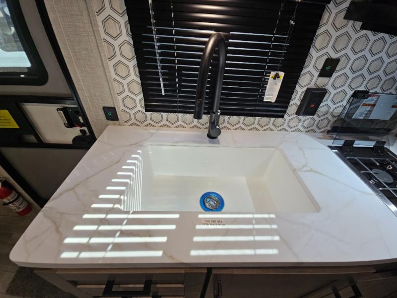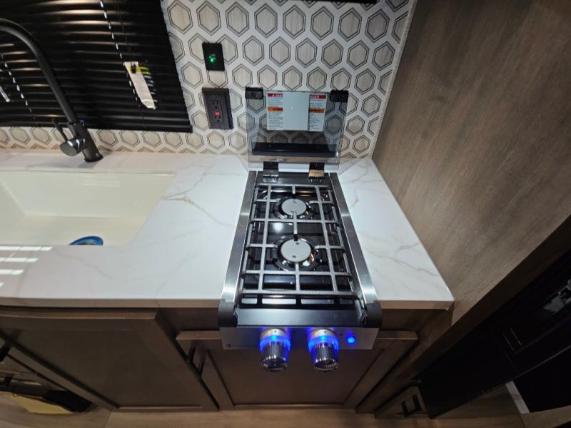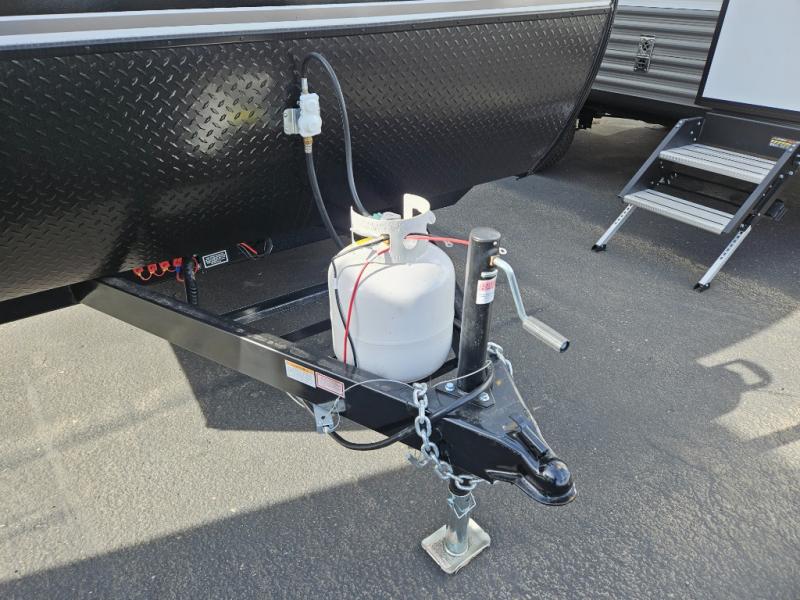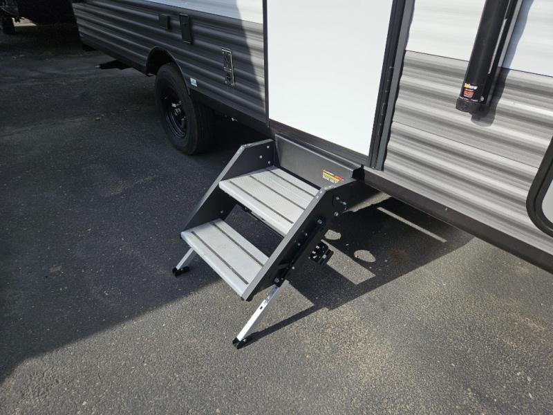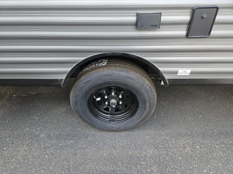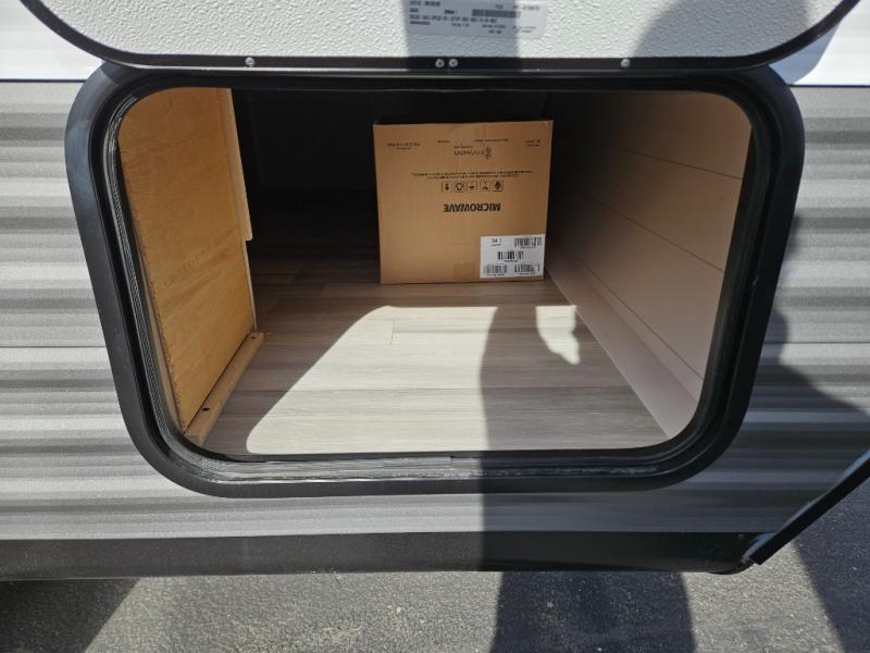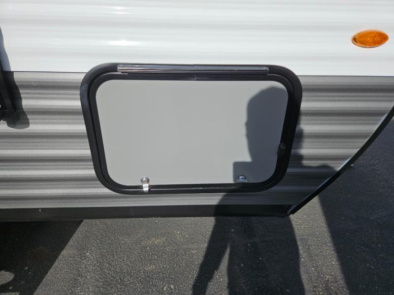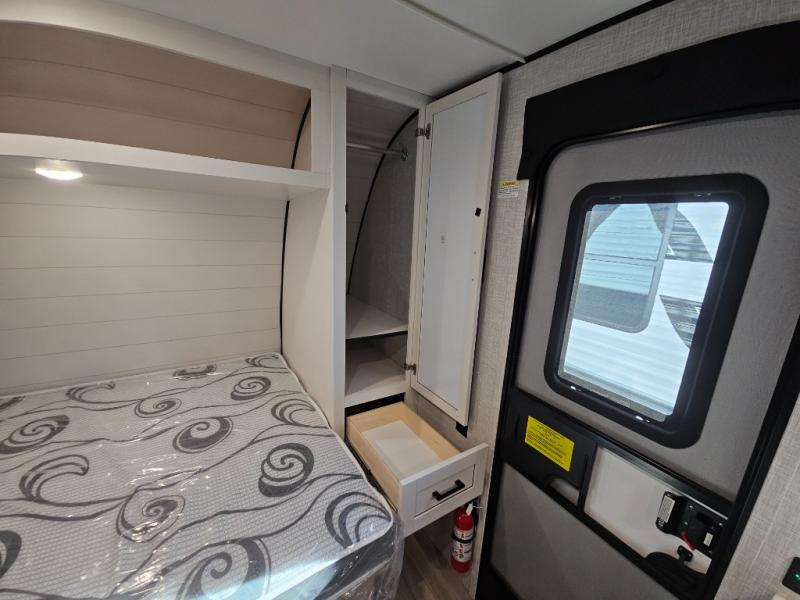 If you're in the market for a lightweight single axle travel trailer with bunk beds, you're in luck with this unit! You will have the front bed all to yourselves, and there is a wardrobe here to store your clothes. The chef can whip up lunch on the two burner cooktop, and you can dine at the booth dinette. If the weather is nice, you may just want to sit outdoors under the 13' power awning with LED lights. The rear corner bath includes a foot flush toilet and a tub/shower, and you'll find plenty of storage space throughout this model, including outside storage for charcoal, tackle boxes, and tools!