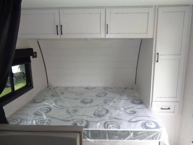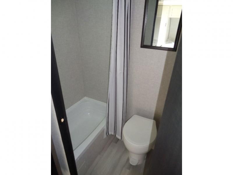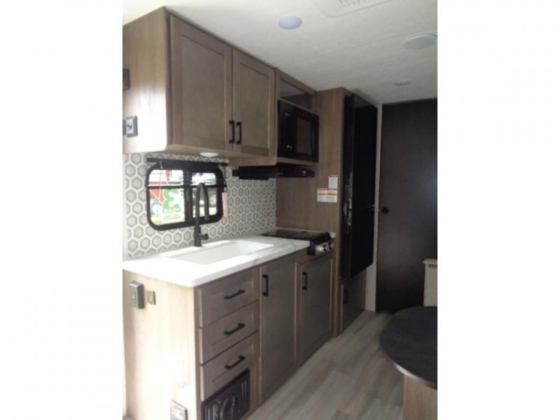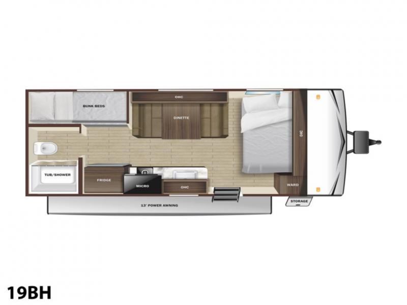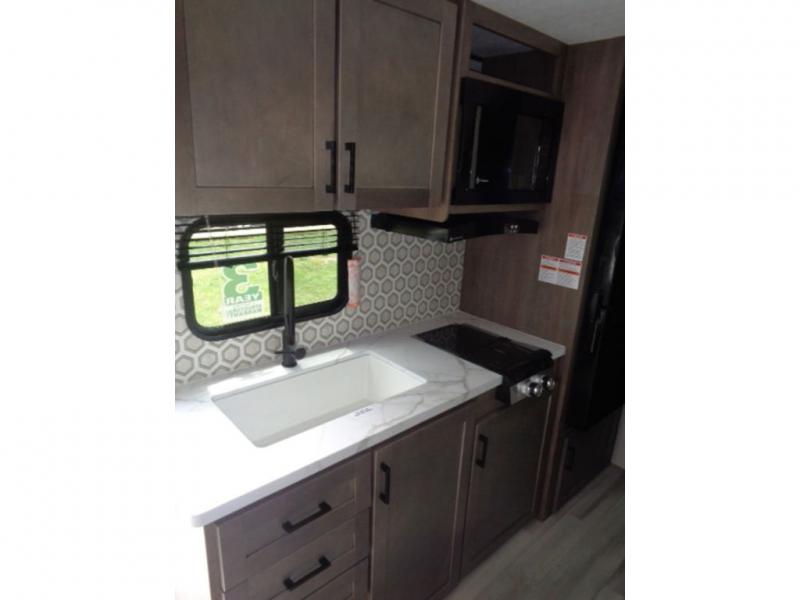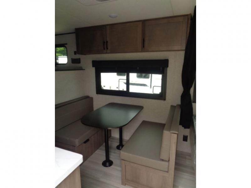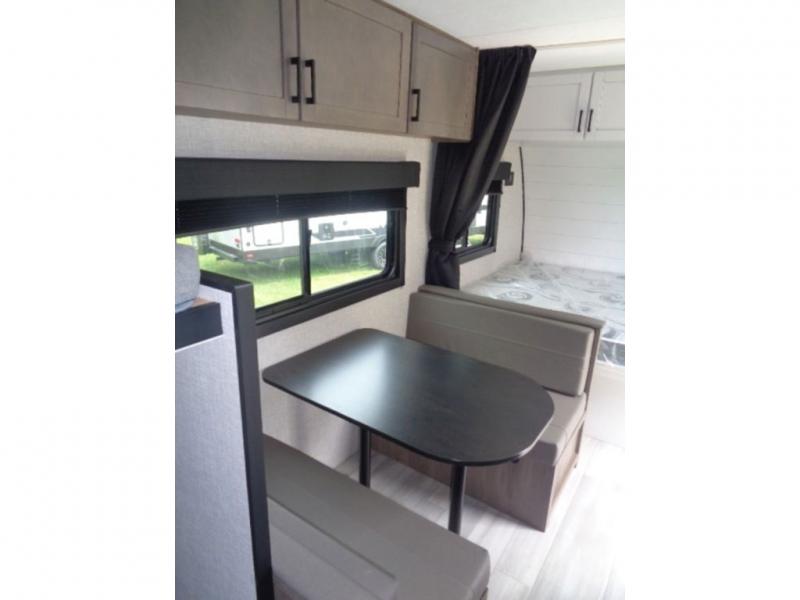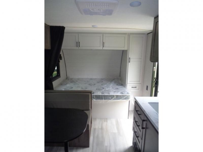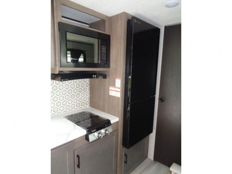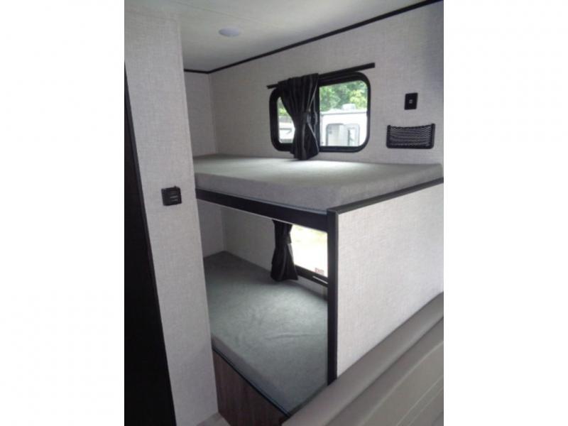 If you're in the market for a lightweight single axle travel trailer with bunk beds, you're in luck with this unit! You will have the front bed all to yourselves, and there is a wardrobe here to store your clothes. The chef can whip up lunch on the two burner cooktop, and you can dine at the booth dinette. If the weather is nice, you may just want to sit outdoors under the 13' power awning with LED lights. The rear corner bath includes a foot flush toilet and a tub/shower, and you'll find plenty of storage space throughout this model, including outside storage for charcoal, tackle boxes, and tools!