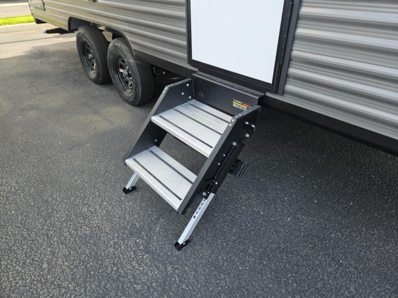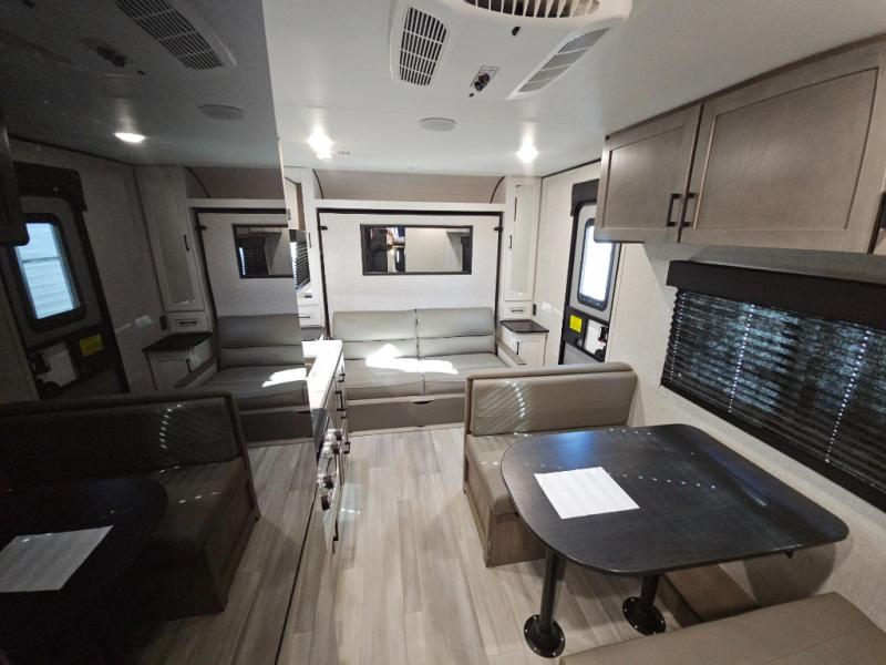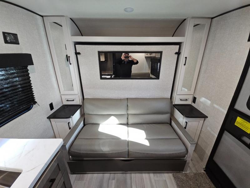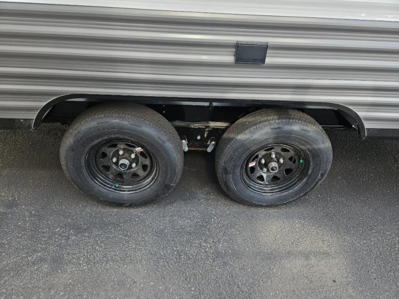 Easy to tow, setup and enjoy, this dual axle trailer offers lots of sleeping space, a booth dinette for two, and a versatile front living area and bedroom combination. You can relax on a jack-knife sofa during the daytime, and easily prepare the Murphy bed at night. You will also have two wardrobes to hang your clothes and an overhead shelf for more storage. The galley kitchen offers a 17" oven, a microwave and a refrigerator. The bathroom sink is just outside the private toilet and tub/shower room so two people can get ready at one time. And the double-size bunks will be a favorite sleeping space. There are options you might like to add such as a 15,000 BTU A/C and/or a Smart TV.