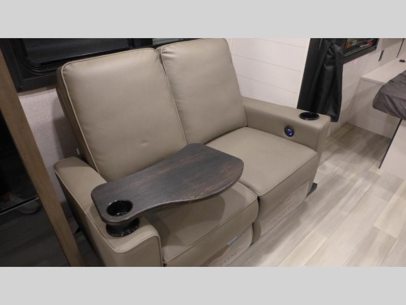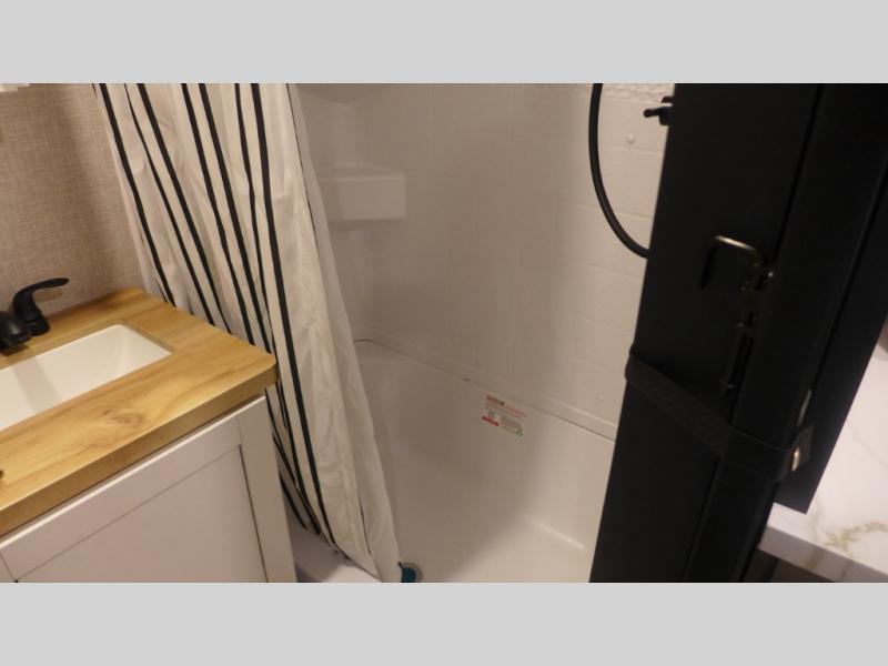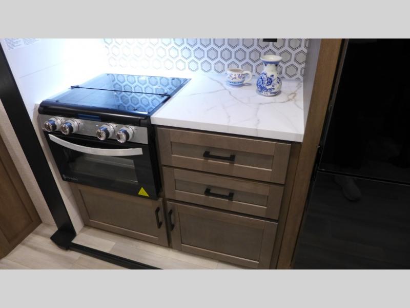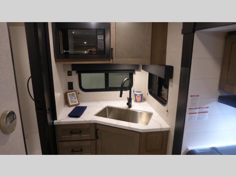 You'll love the amount of space you have in this travel trailer thanks to the large slide out. Here, you'll find theater seating, a three burner range with countertop space, plus a 10 cu. ft. 12V refrigerator. There is additional counter space by the rear corner sink, along with overhead cabinets for kitchen knickknacks. A booth dinette provides a place to dine inside when you don't want to sit outdoors under the 18' power awning. You'll feel right at home in the front bedroom that includes a walk-around bed, dual wardrobes, and a privacy curtain!