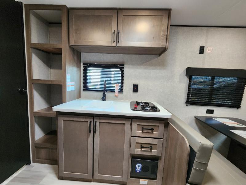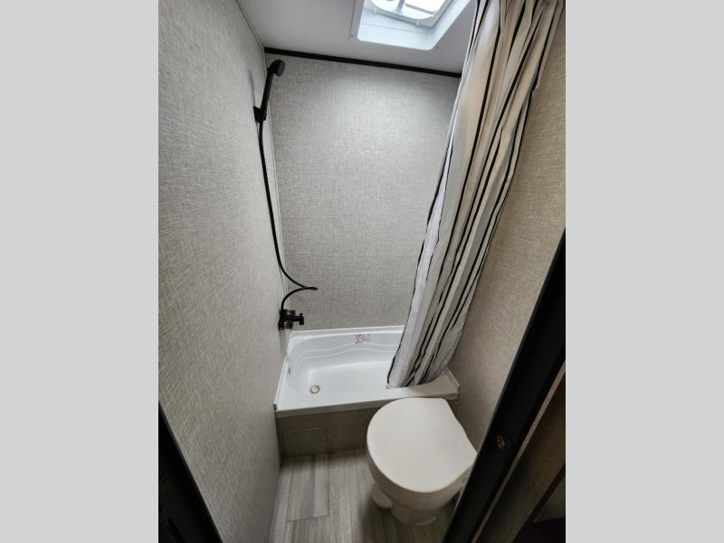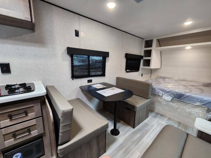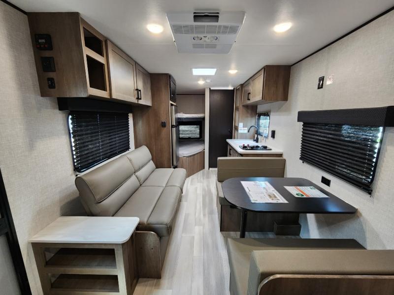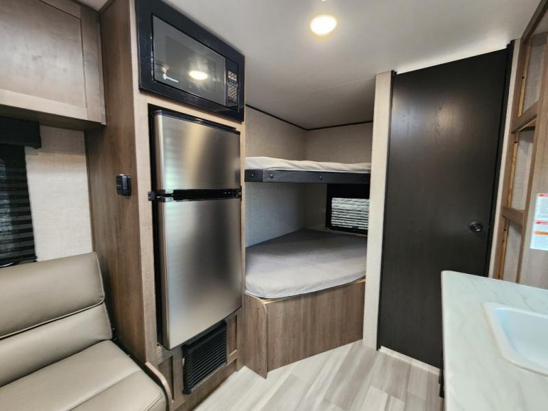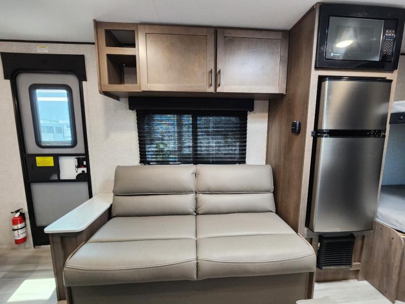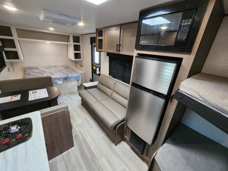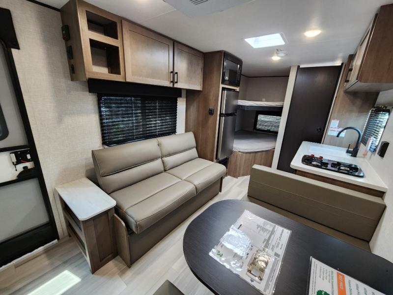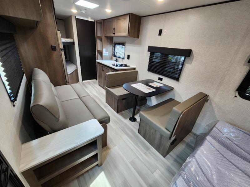 This travel trailer has everything you need for a fun getaway! You can unload the exterior storage when you get to camp, then head inside to make lunch on the two burner cooktop or microwave oven. A 12V refrigerator will keep your perishables fresh, and a booth dinette will provide dining space. The jackknife sofa offers a comfortable place to relax while you let your stomach settle from the delicious meal. Everyone can take turns freshening up in the rear corner private bath that includes a tub/shower and a toilet, and the little ones are sure to love the double over double bunk beds!