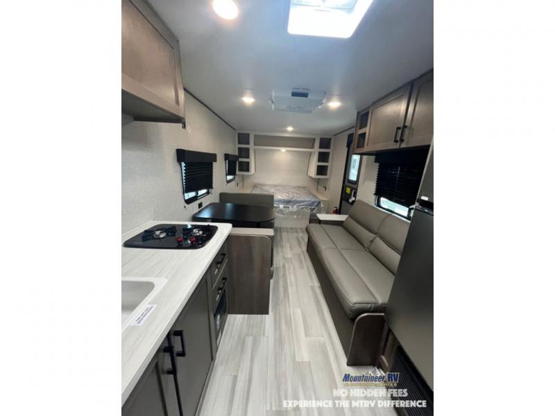 This travel trailer has everything you need for a fun getaway! You can unload the exterior storage when you get to camp, then head inside to make lunch on the two burner cooktop or microwave oven. A 12V refrigerator will keep your perishables fresh, and a booth dinette will provide dining space. The jackknife sofa offers a comfortable place to relax while you let your stomach settle from the delicious meal. Everyone can take turns freshening up in the rear corner private bath that includes a tub/shower and a toilet, and the little ones are sure to love the double over double bunk beds!